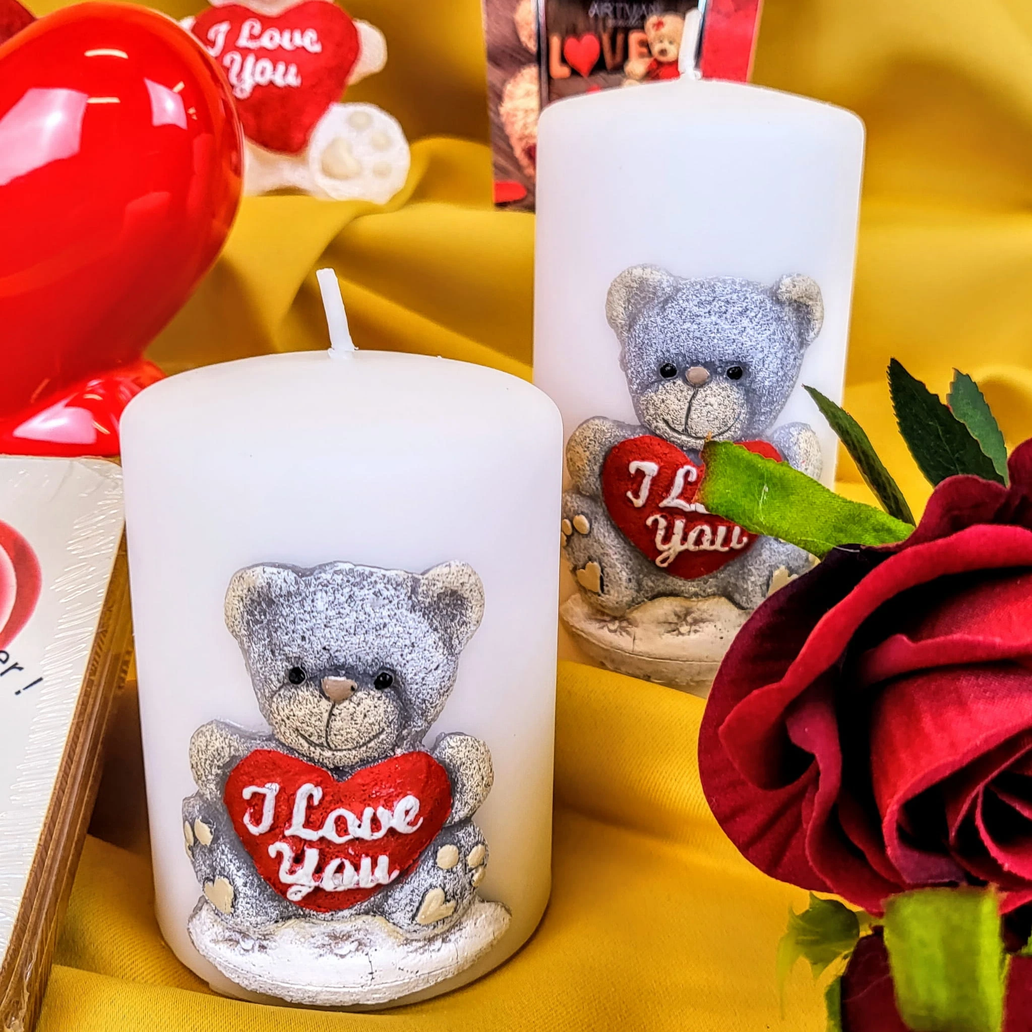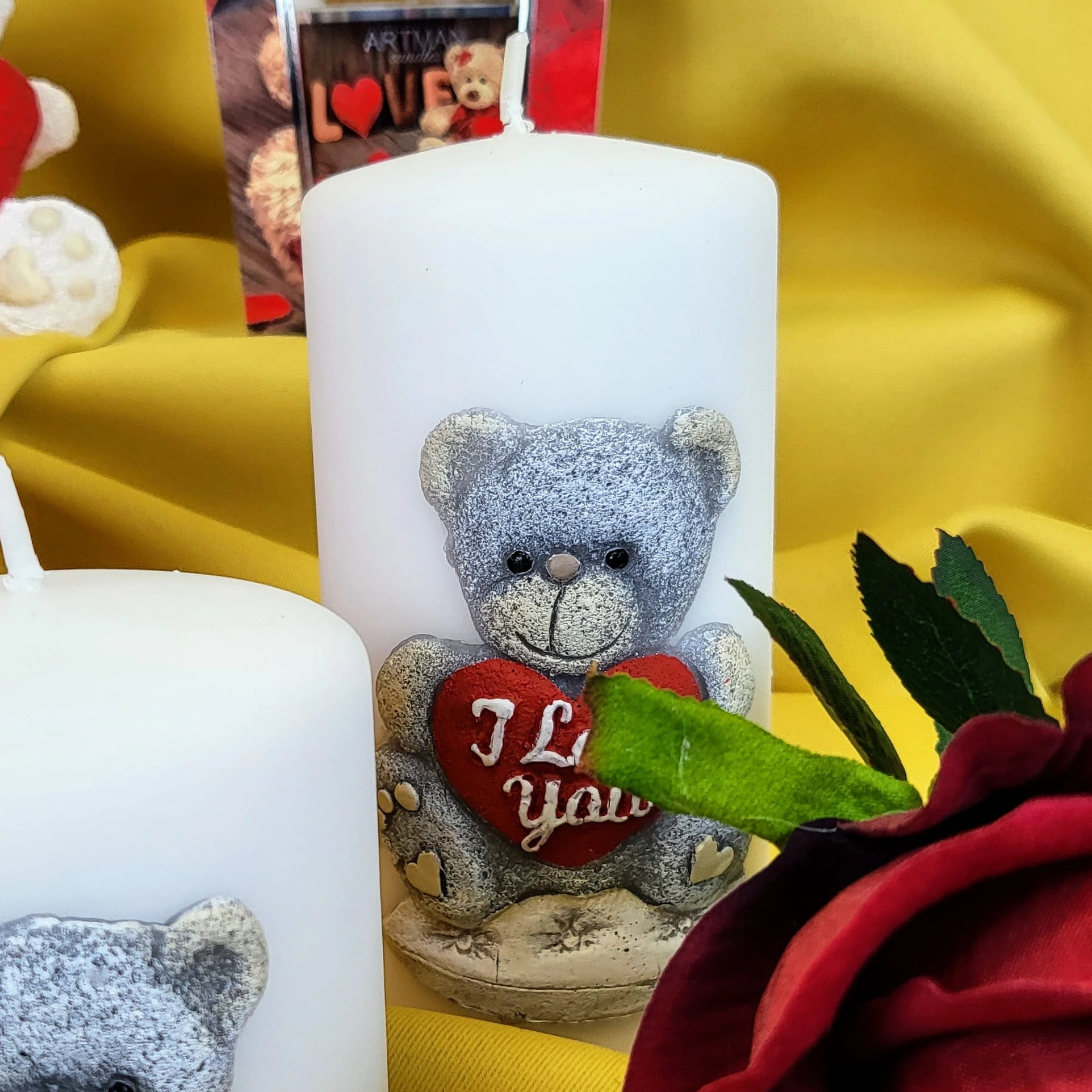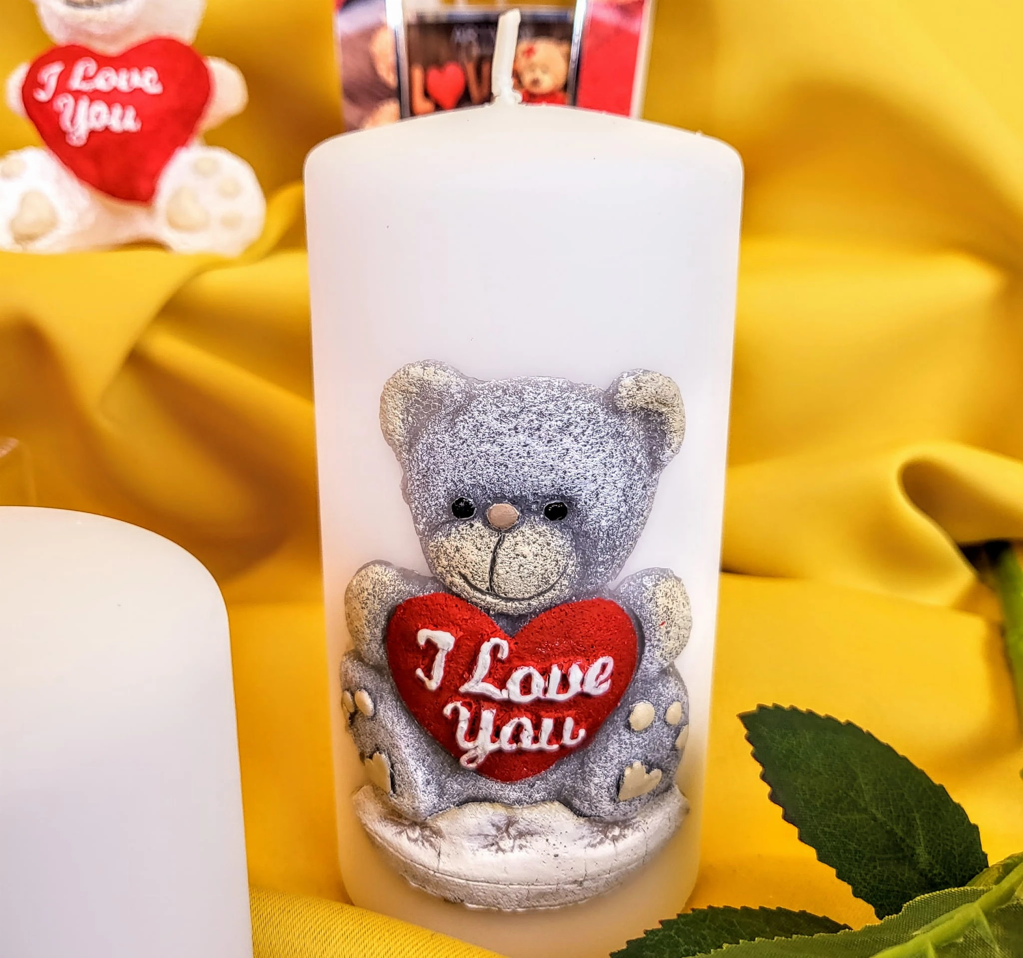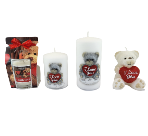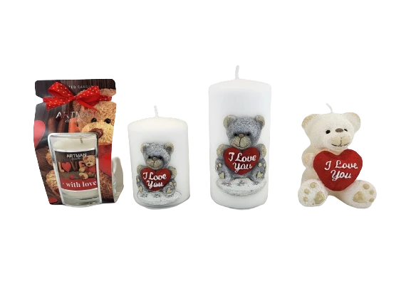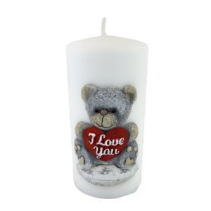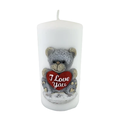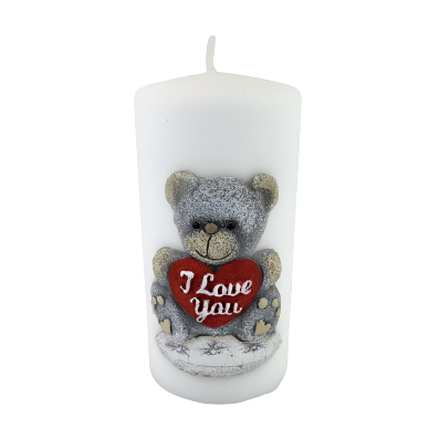 Świeca parafinowa TEDDY w kolorze białym z uroczym misiem. Miś z serduszkiem "I Love You" (kocham Cię).