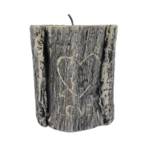 Świeca ozdobna do złudzenia przypominająca pień prawdziwego drzewa z wyrytym sercem i napisem "love". Ożywi każdą półkę czy komodę, będzie stanowić bardzo elegancką ozdobę stołu i/lub stroików.