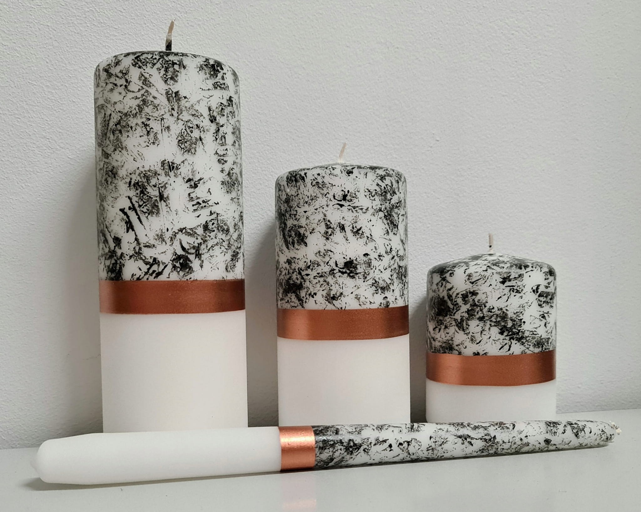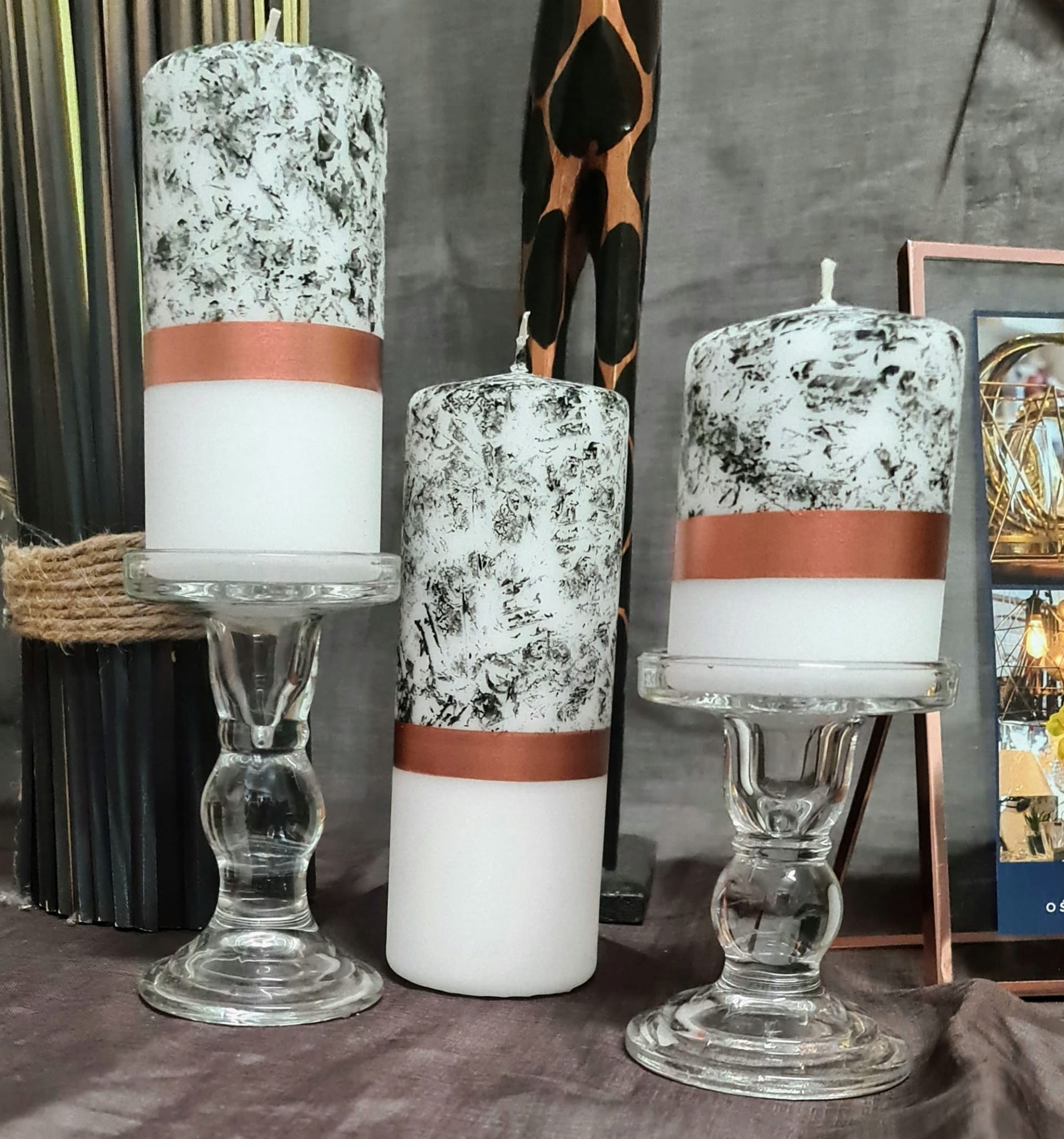 Świece z serii COPPER BELT, to oryginalna biało-marmurkowa świeca z efektownym zdobieniem w kolorze miedzi. Świetnie sprawdzi się we wnętrzach nowoczesnych i nie tylko. Jest to idealny pomysł na prezent dla osoby, która lubi eleganckie dodatki.