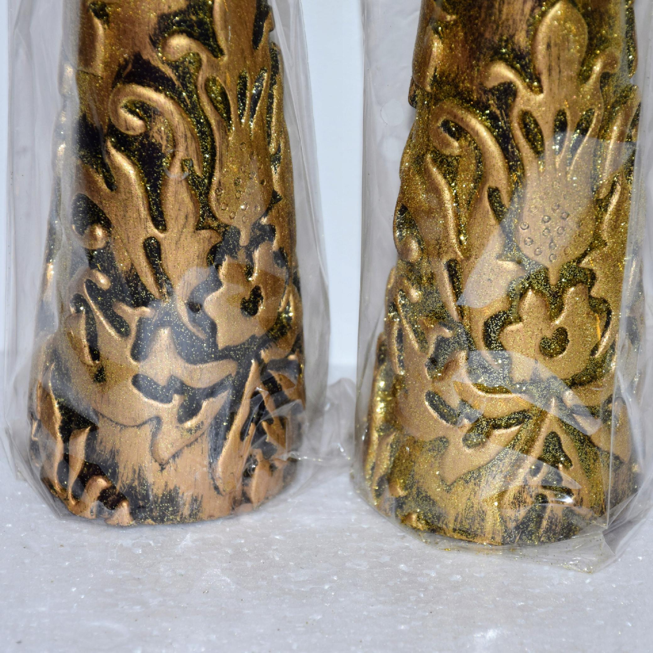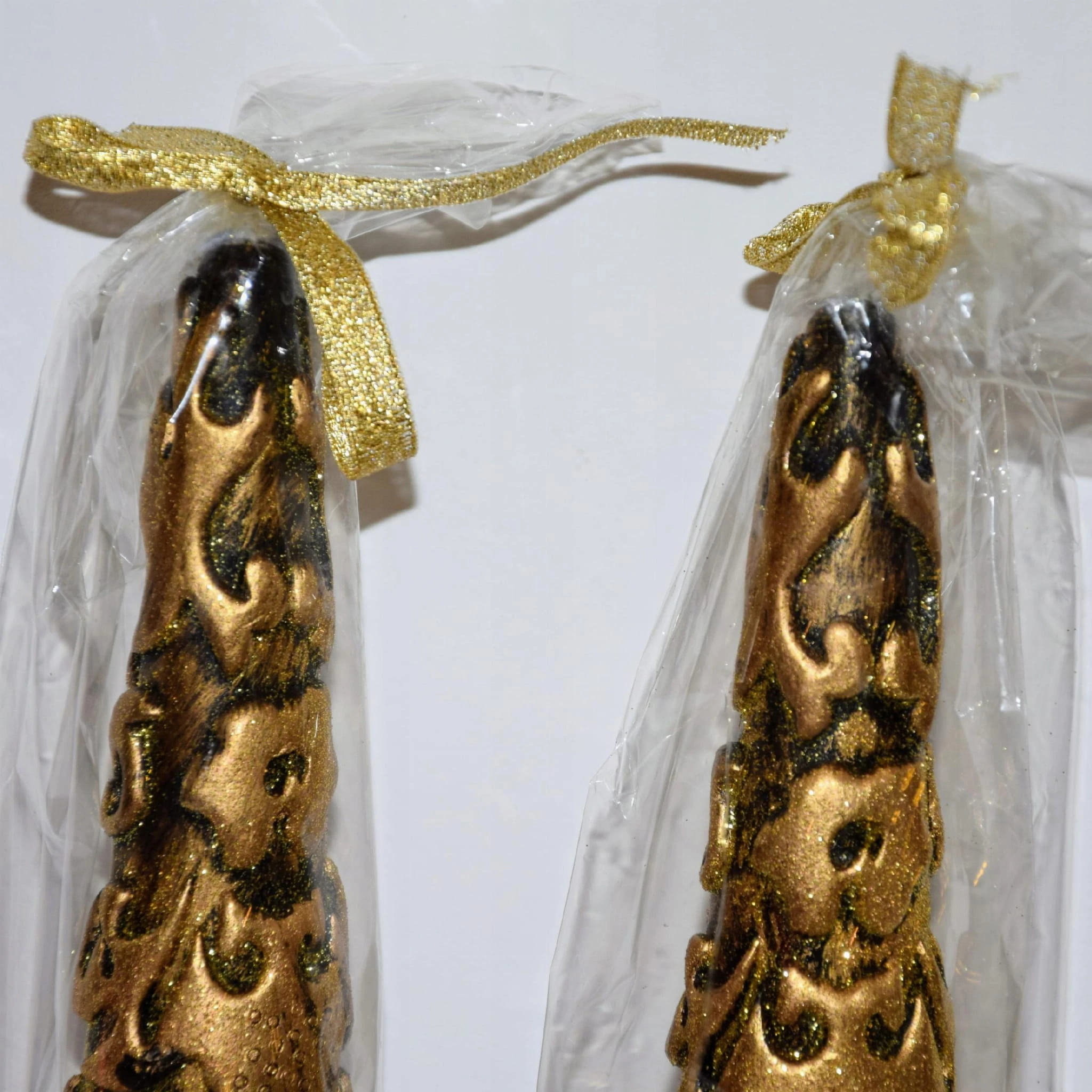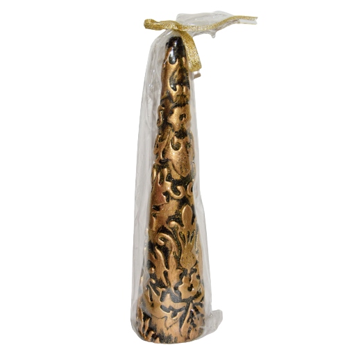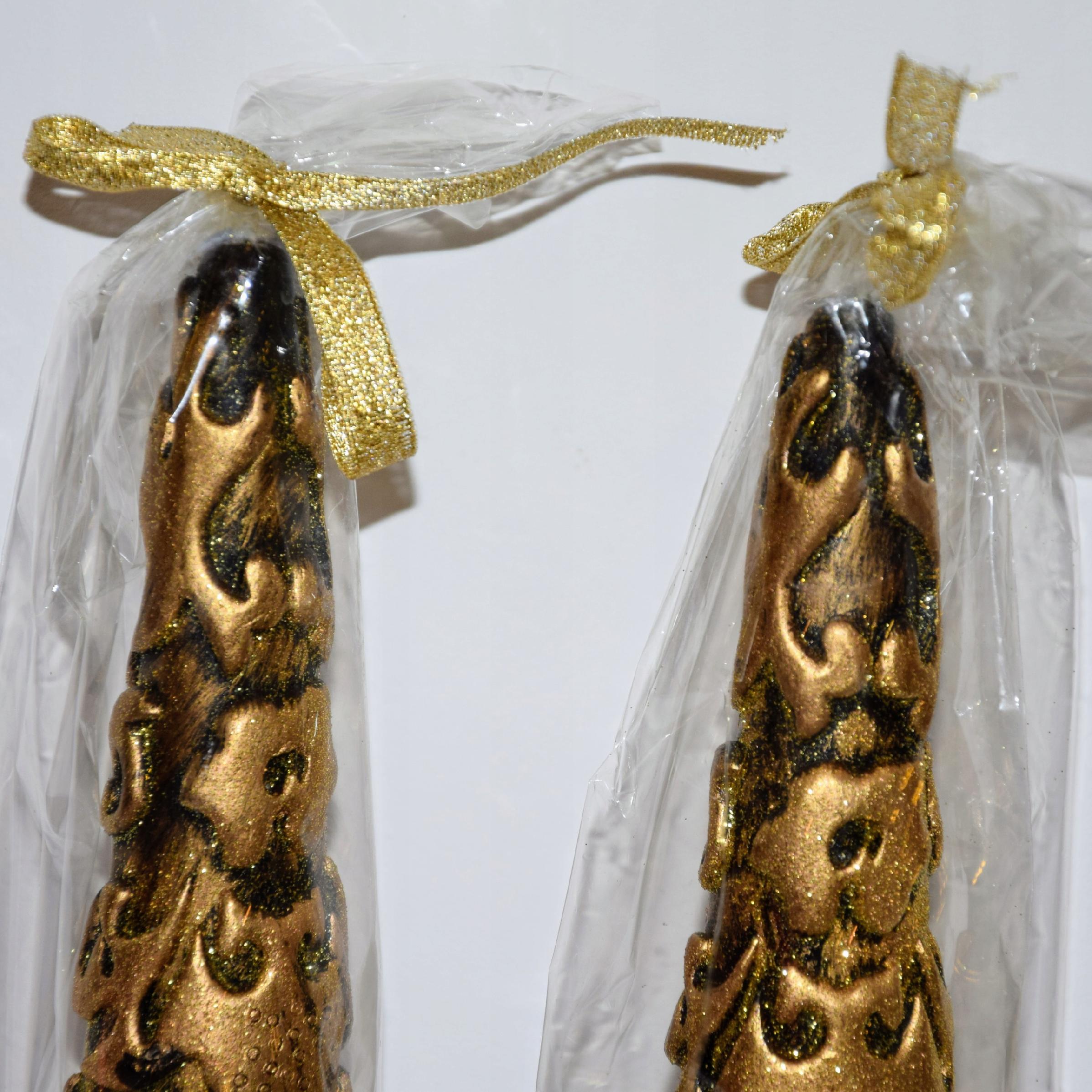 Ozdobna świeczka w kolorze złotym, zdobiona. Ożywi każdą półkę czy komodę, a w okresie bożonarodzeniowym stanowić będzie bardzo elegancką ozdobę stołu i/lub stroików.