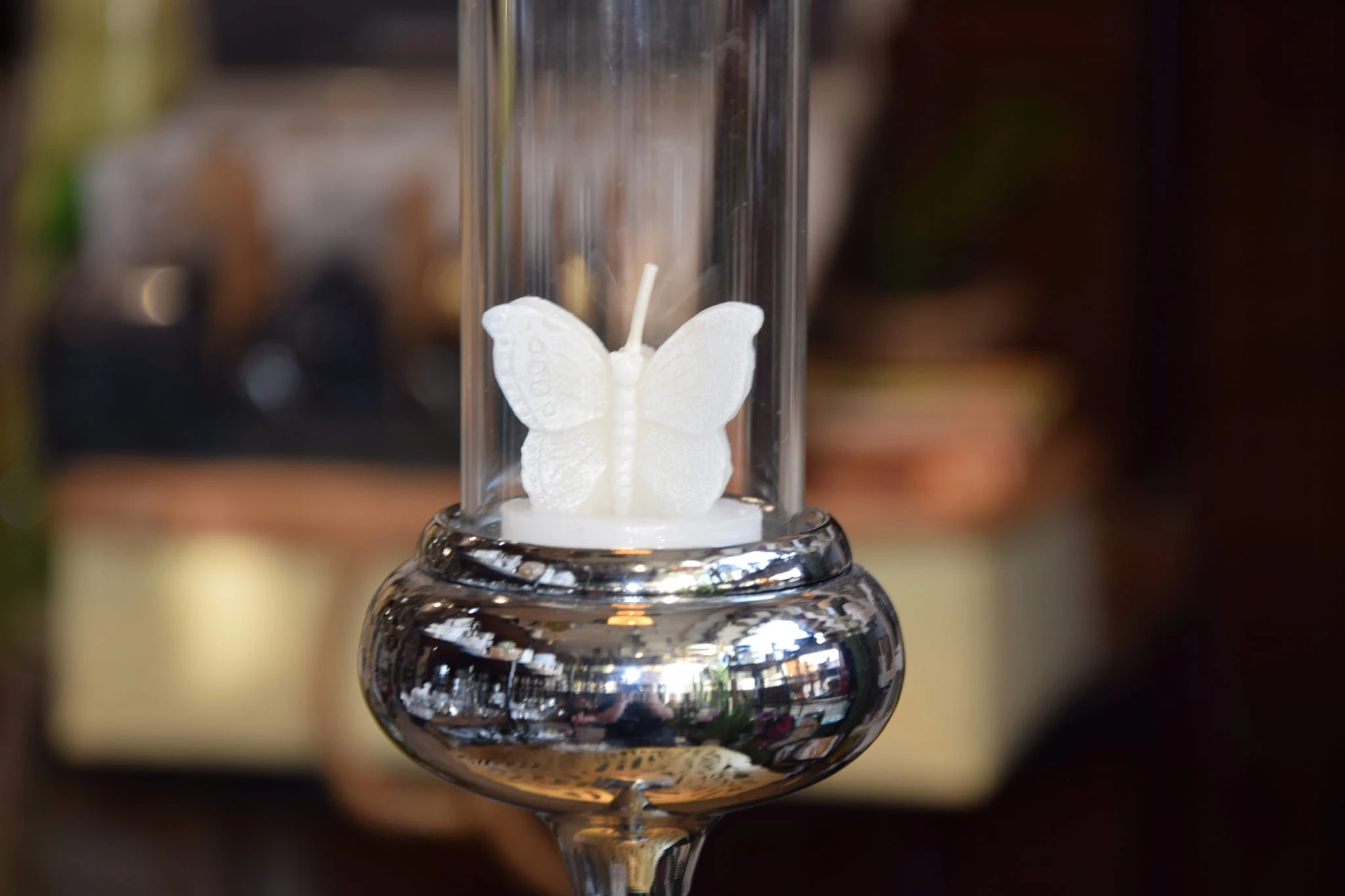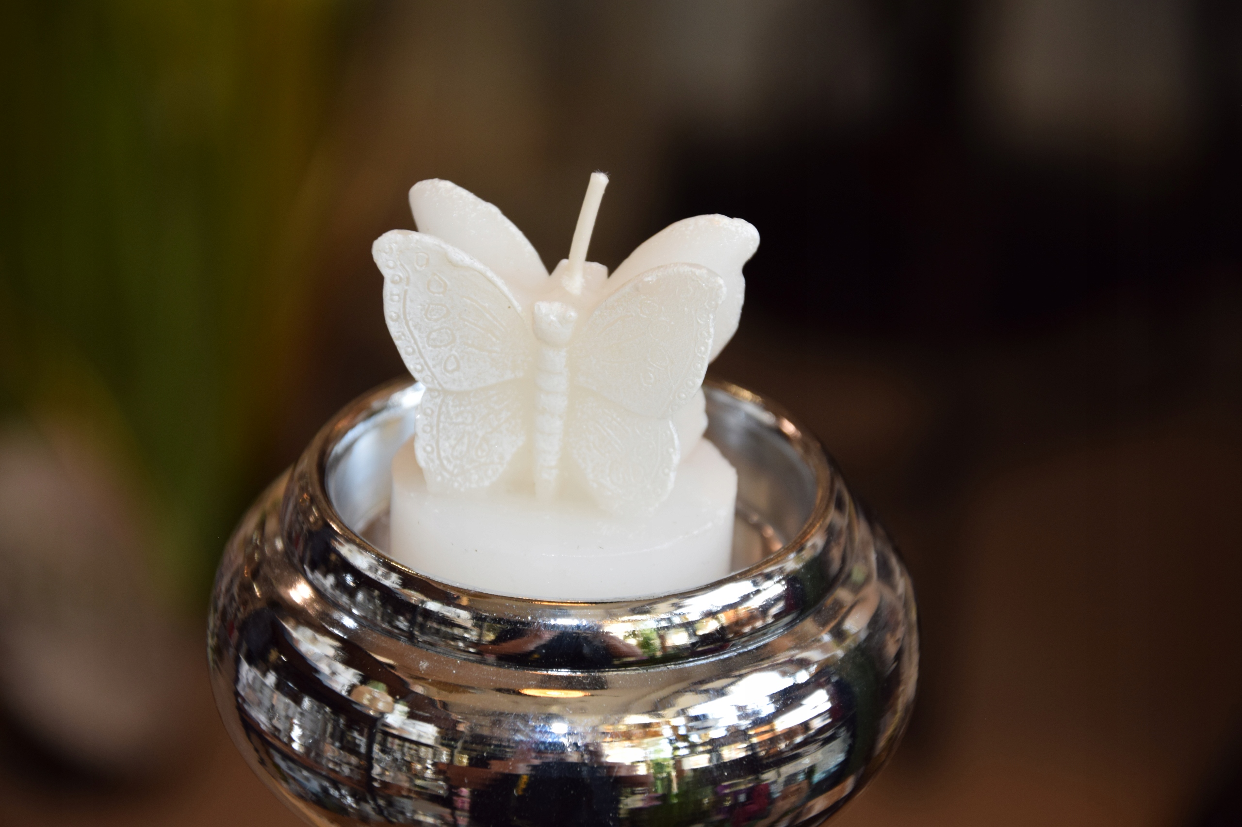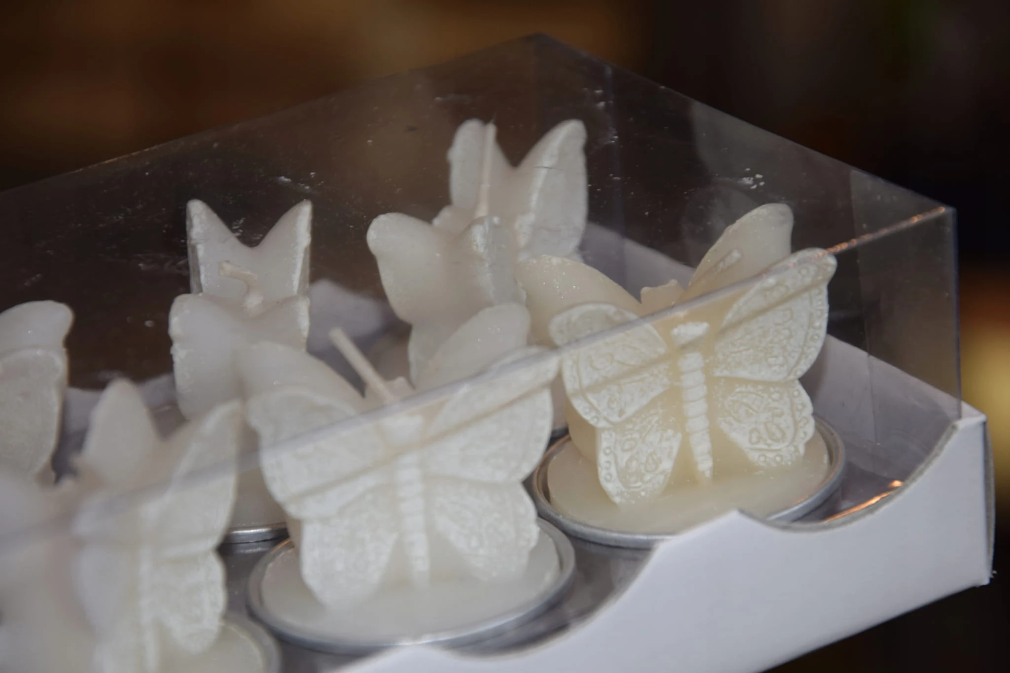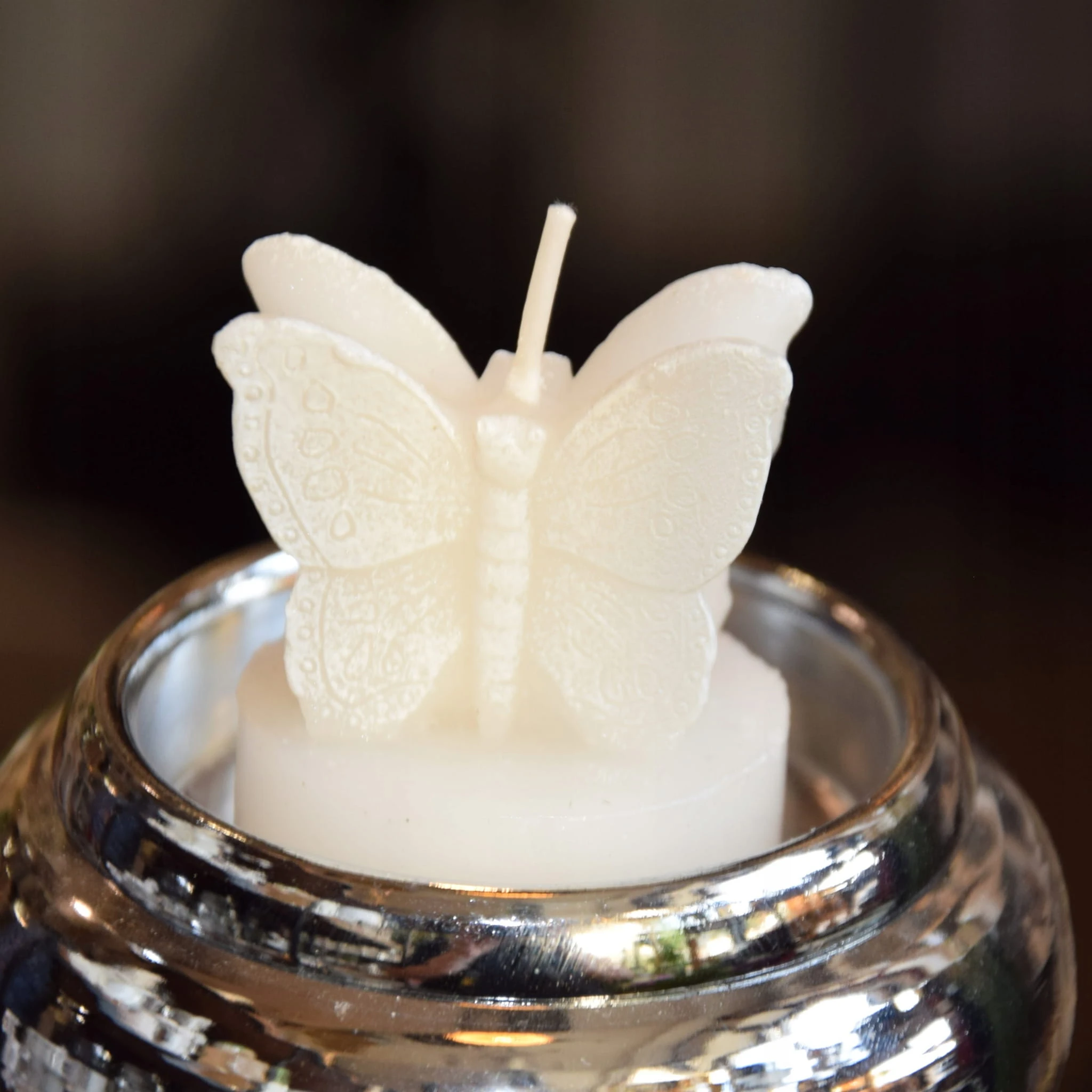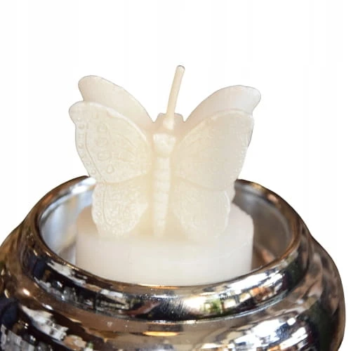 Biała świeca T-light w kształcie motyla. Podgrzewacz o nietypowym wyglądzie. Idealnie sprawdzą się jako elegancka dekoracja do wszystkich standardowych świeczników.