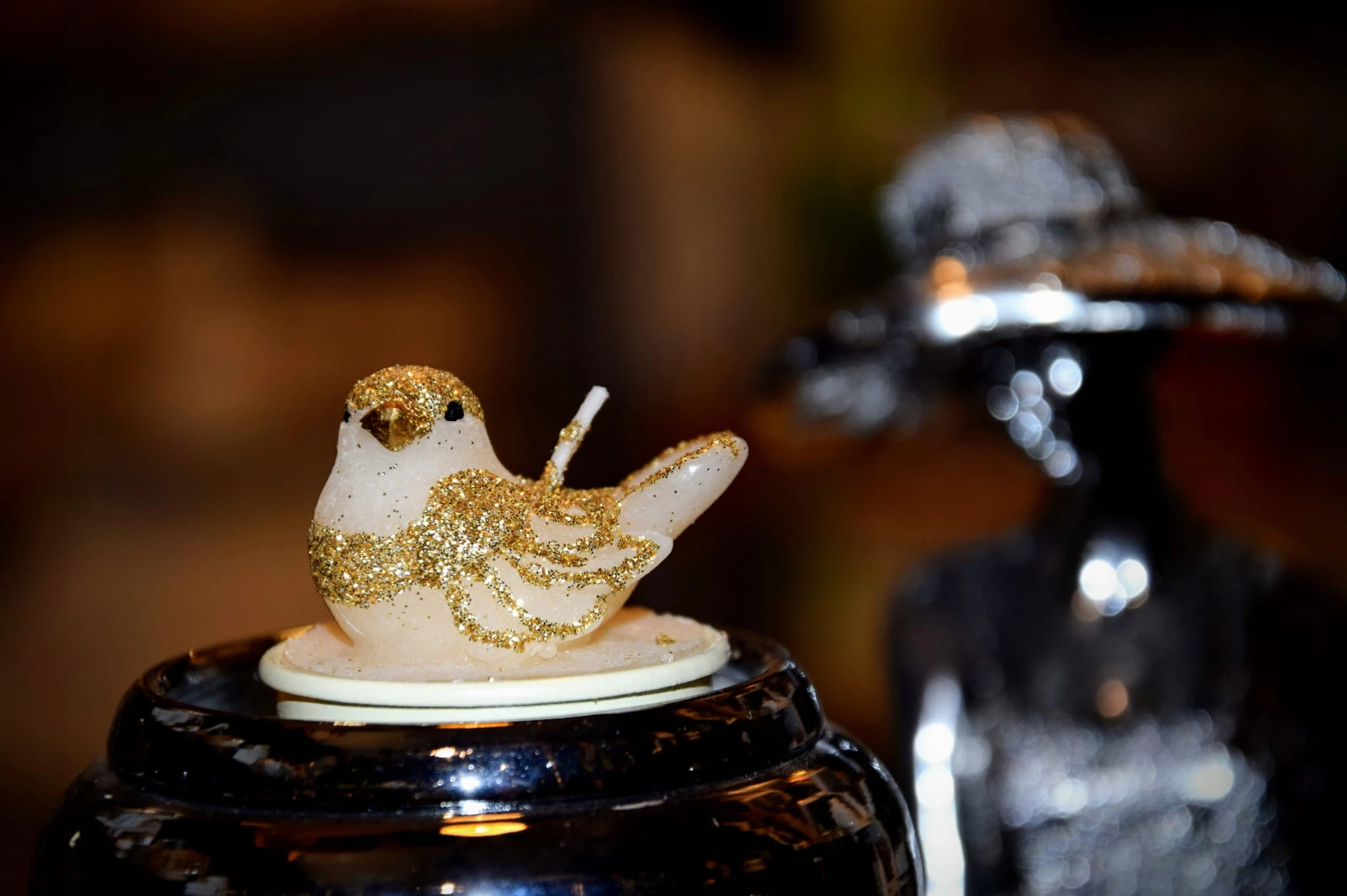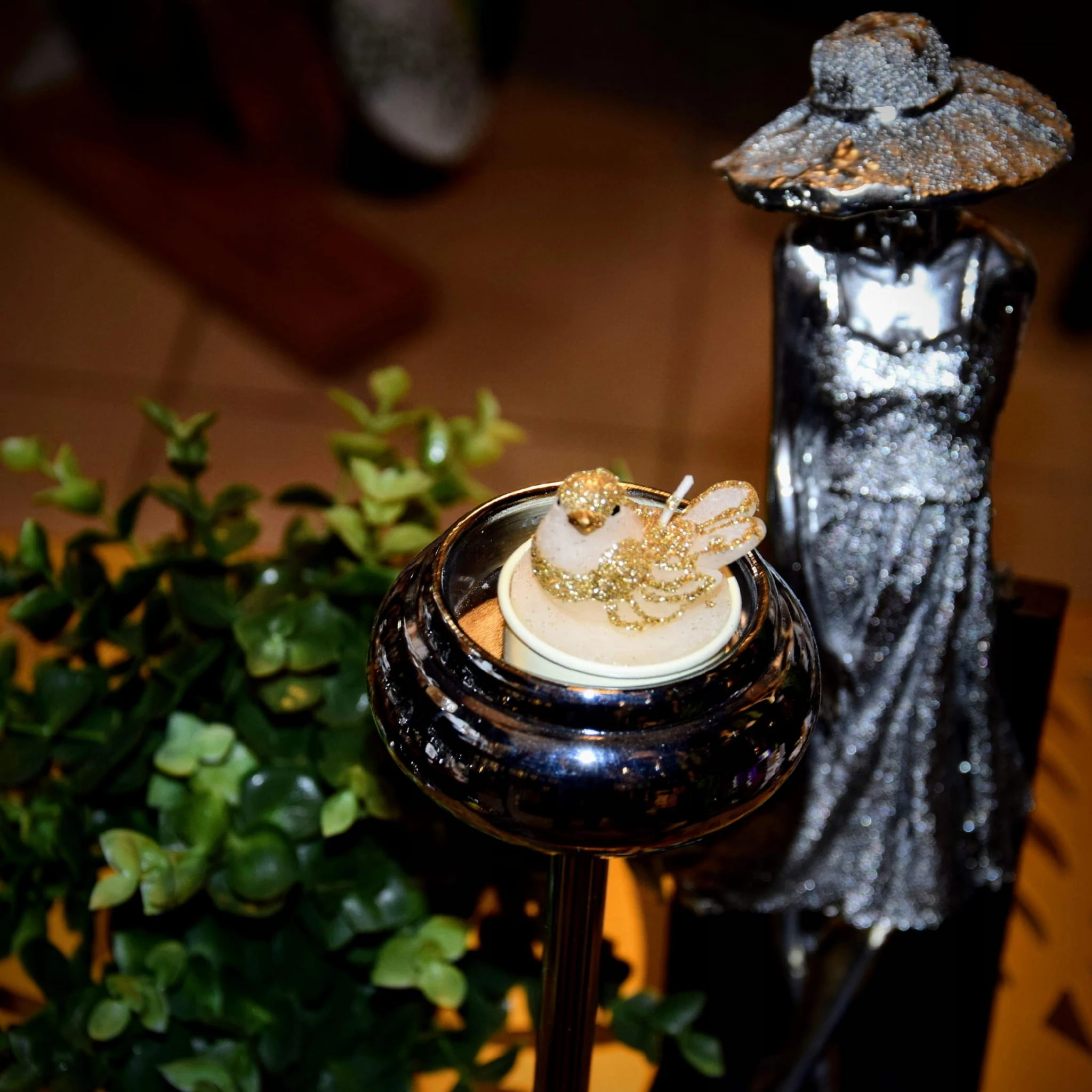 Świeca T-light w kształcie ptaszka w ecru powlekanego złotym brokatem. Podgrzewacz o nietypowym wyglądzie. Idealnie sprawdzą się jako elegancka dekoracja do wszystkich standardowych świeczników na t-lighty, całkowicie odmieniajace ich wygląd.