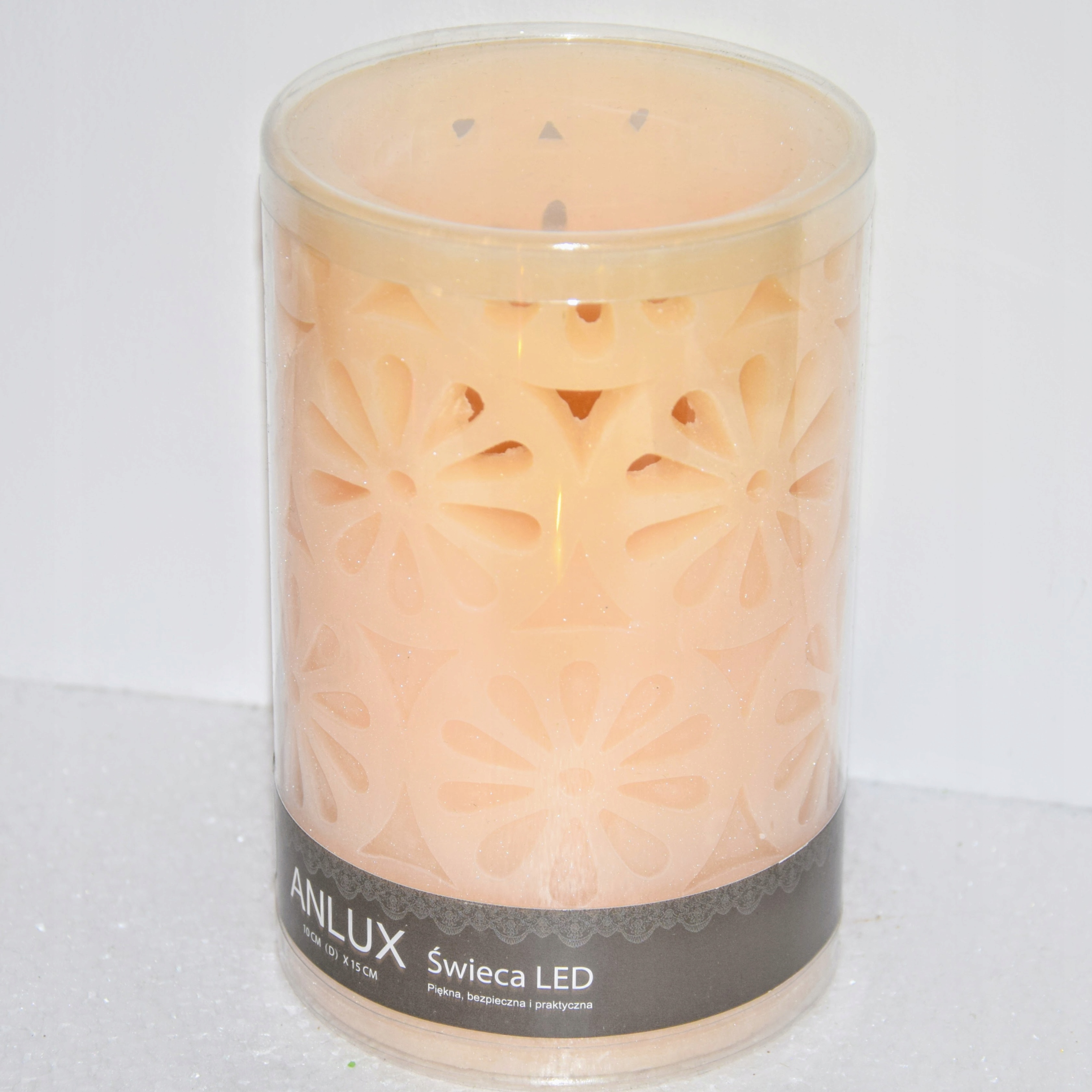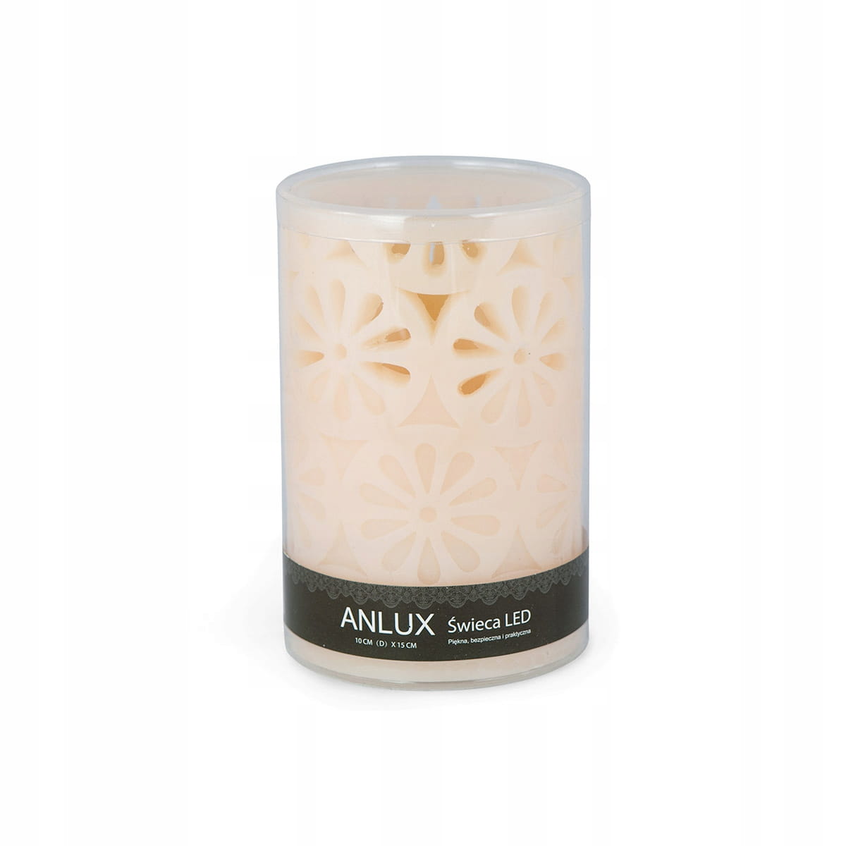 Nowoczesna, wielokrotnego użytku świeca LED, wykonana z wosku w kolorze ecru. Powierzchnia wyrzeźbiona w ażurowe kształty kół, przez które przenika światło tworząc ciekawy efekt wizualny. Migoczące światło imituje płomień tradycyjnej świecy.