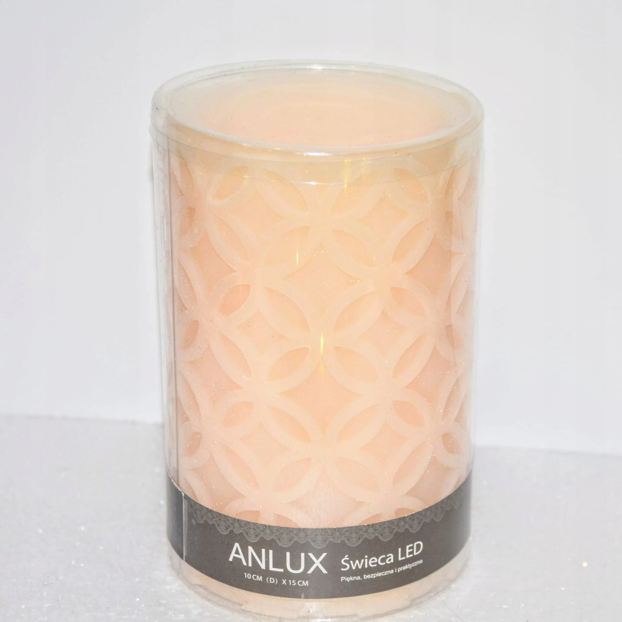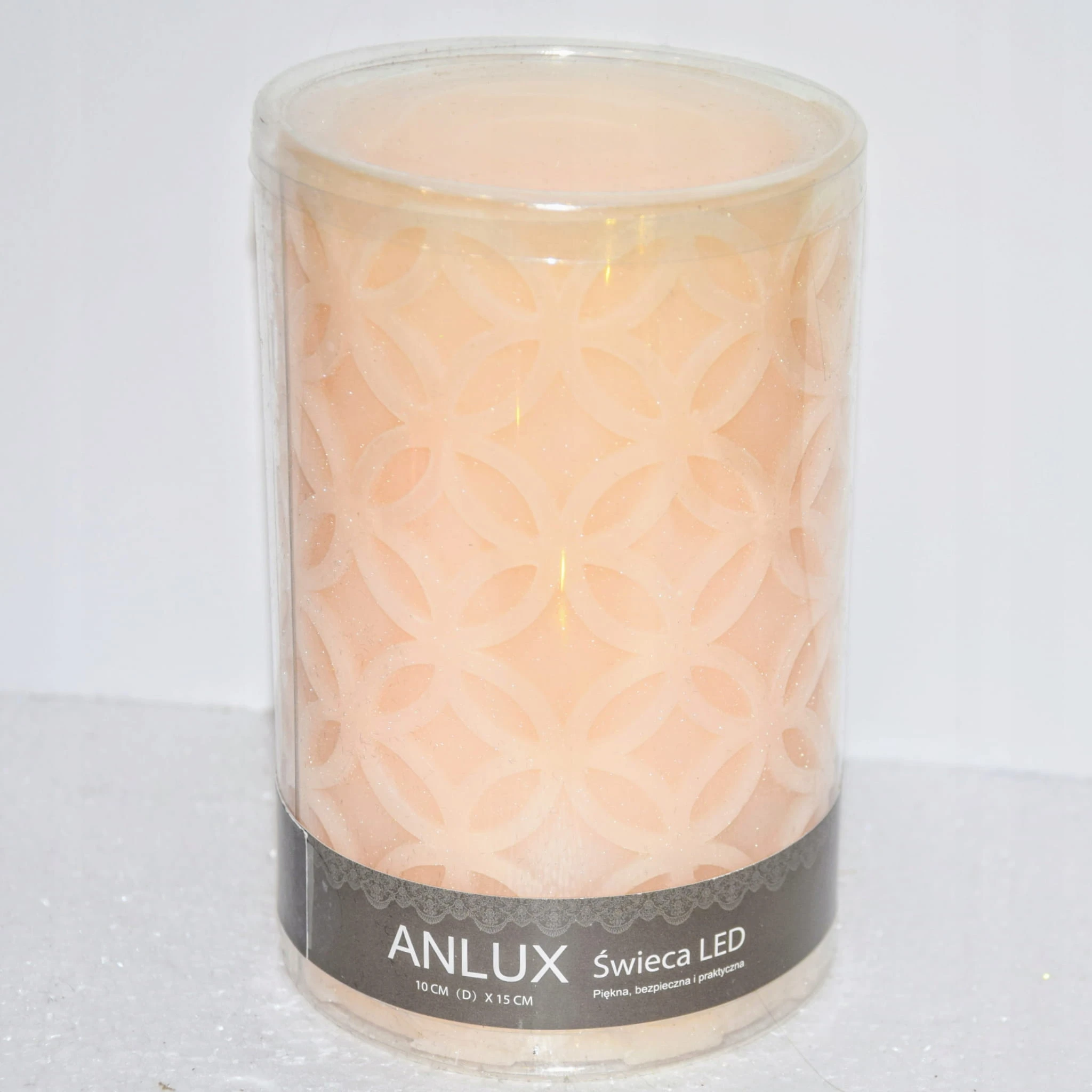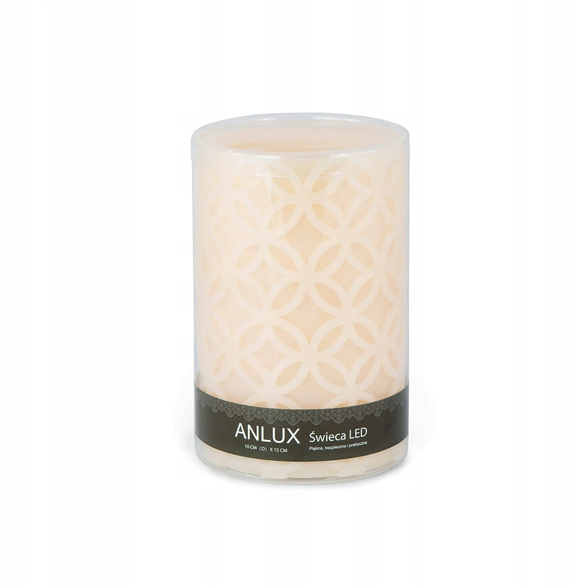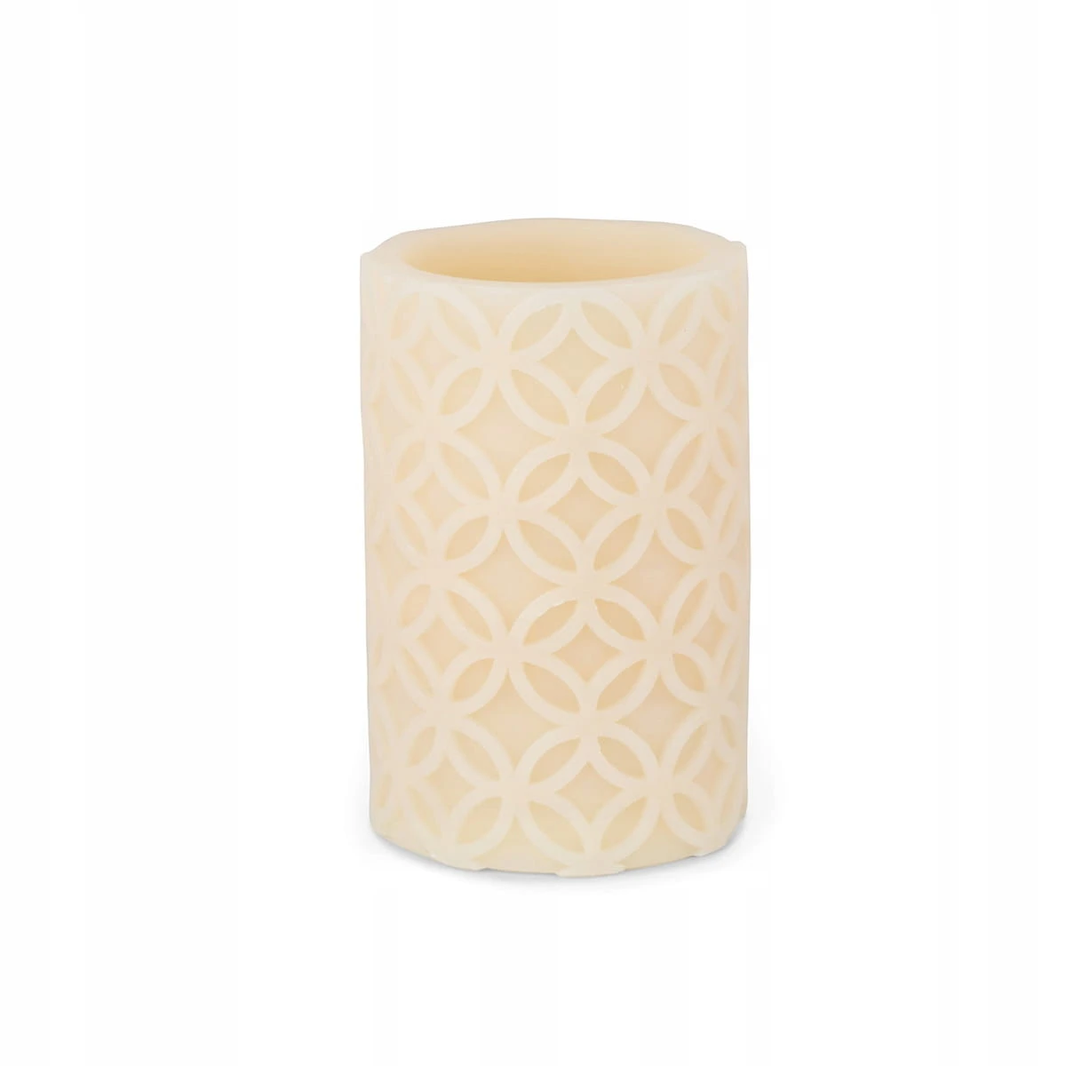 Nowoczesna, wielokrotnego użytku świeca LED, wykonana z wosku w kolorze ecru. Powierzchnia wyrzeźbiona w koła z ornamentem. Migoczące światło imituje płomień tradycyjnej świecy.