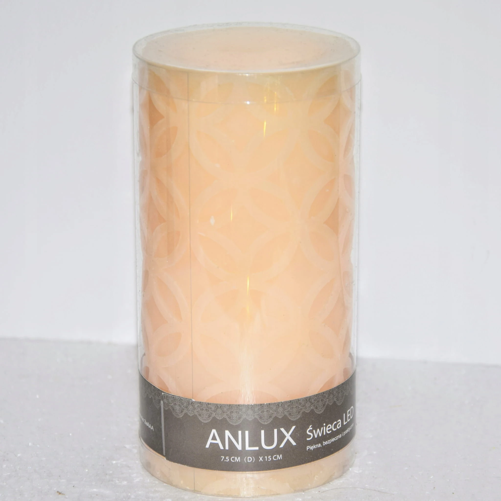 Nowoczesna, wielokrotnego użytku świeca LED, wykonana z wosku w kolorze ecru. Powierzchnia wyrzeźbiona w koła z ornamentem. Migoczące światło imituje płomień tradycyjnej świecy.