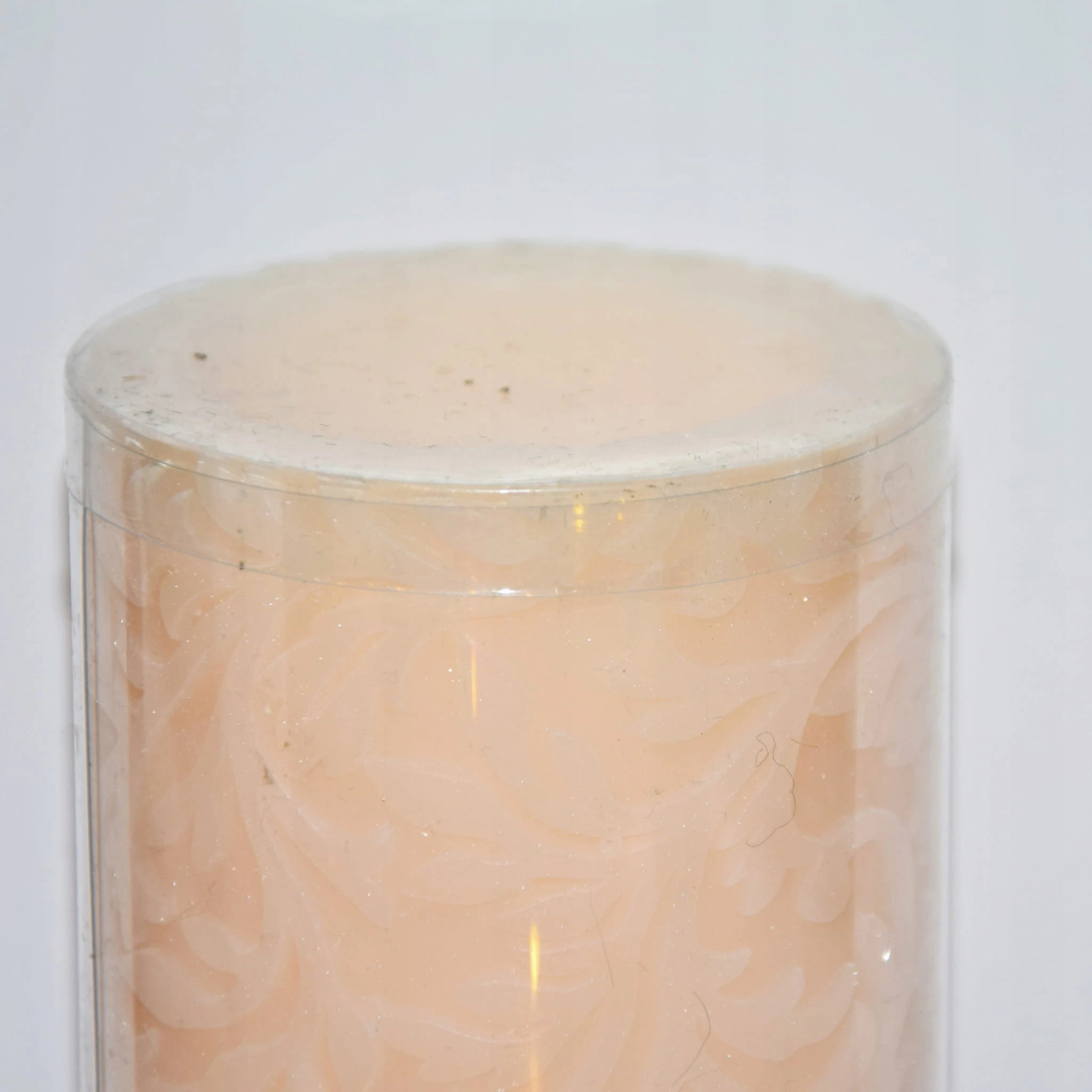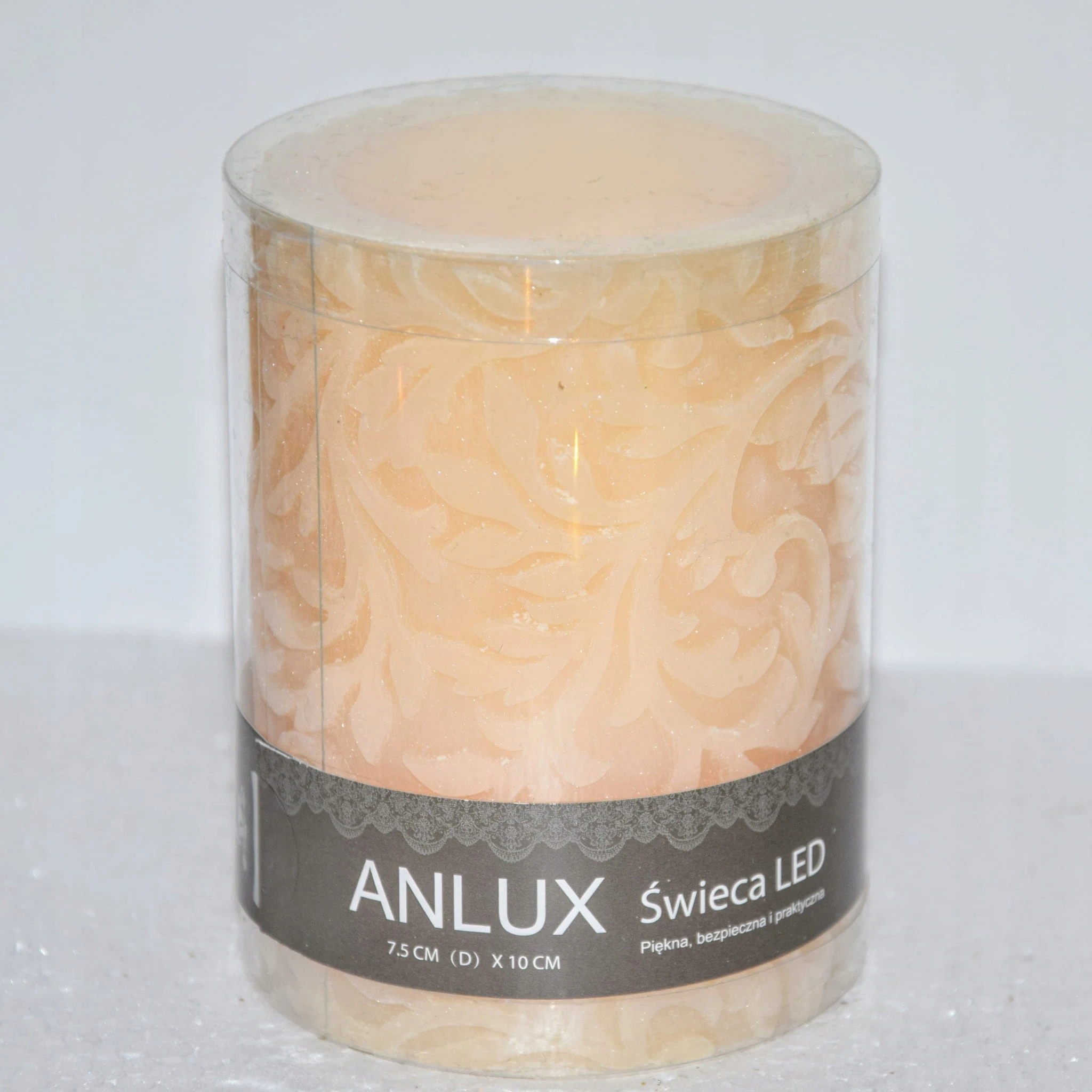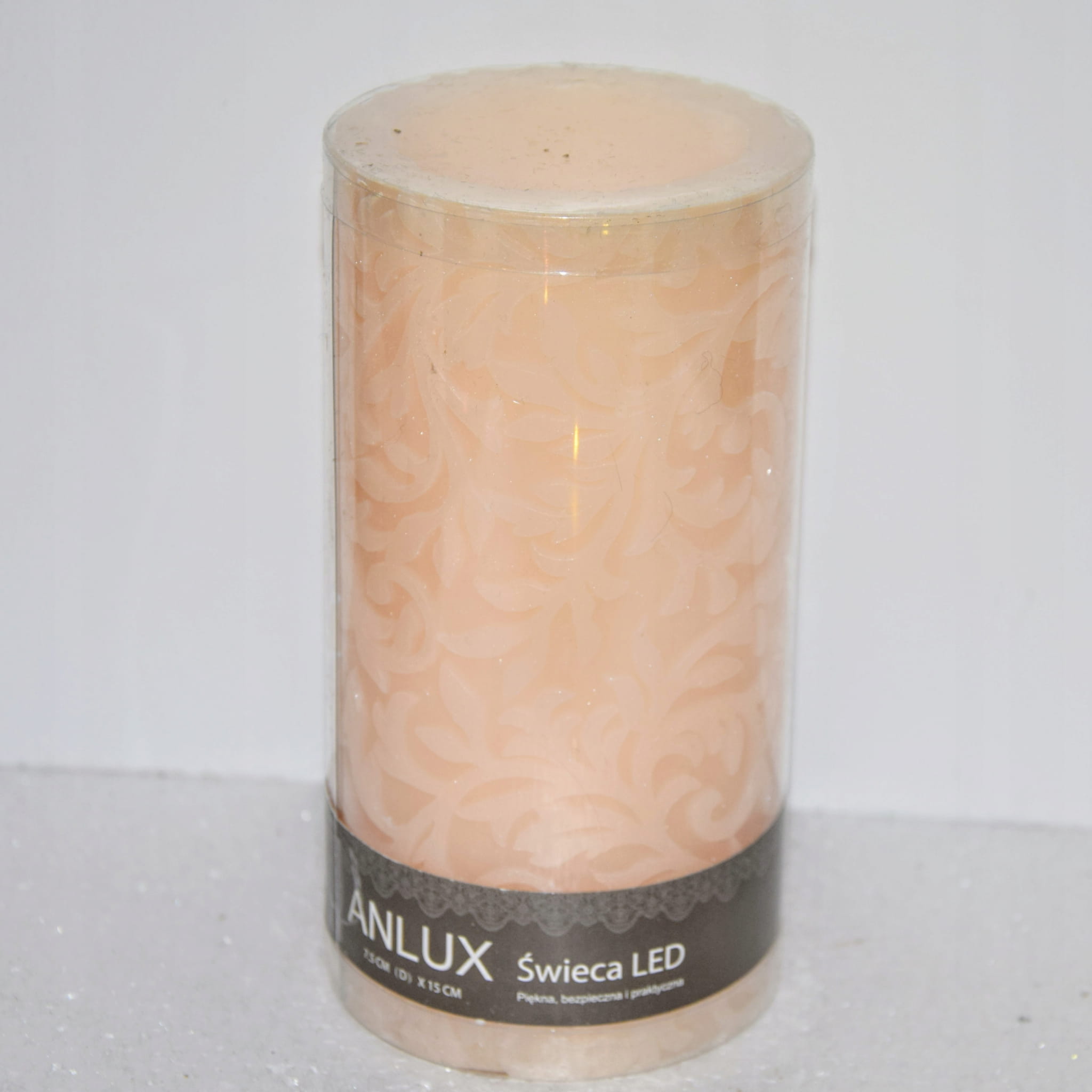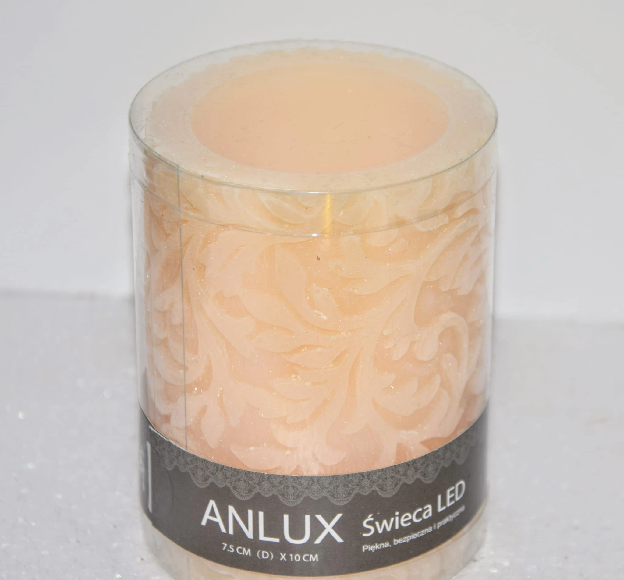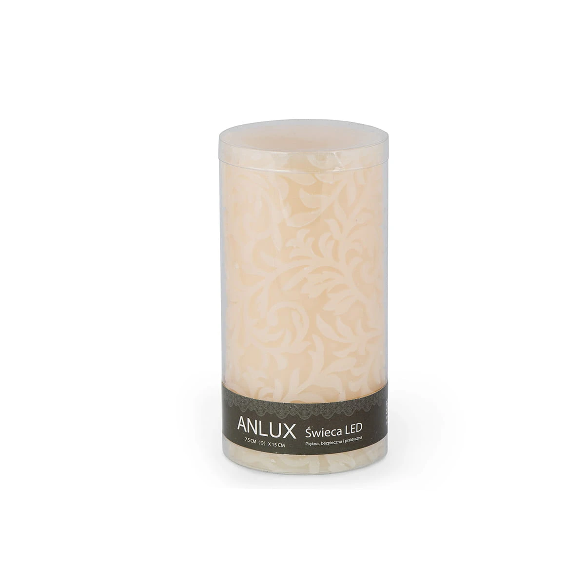 Nowoczesna, wielokrotnego użytku świeca LED, wykonana z wosku w kolorze ecru. Powierzchnia wyrzeźbiona w ornamenty. Migoczące światło imituje płomień tradycyjnej świecy.