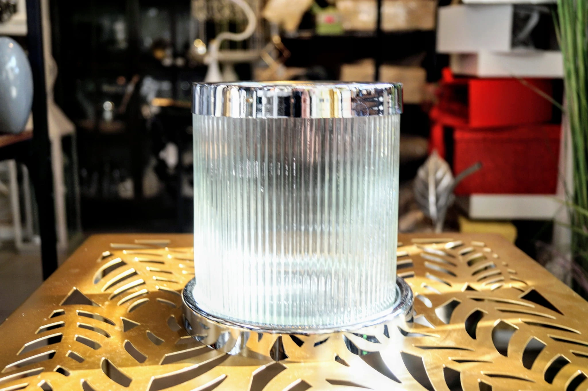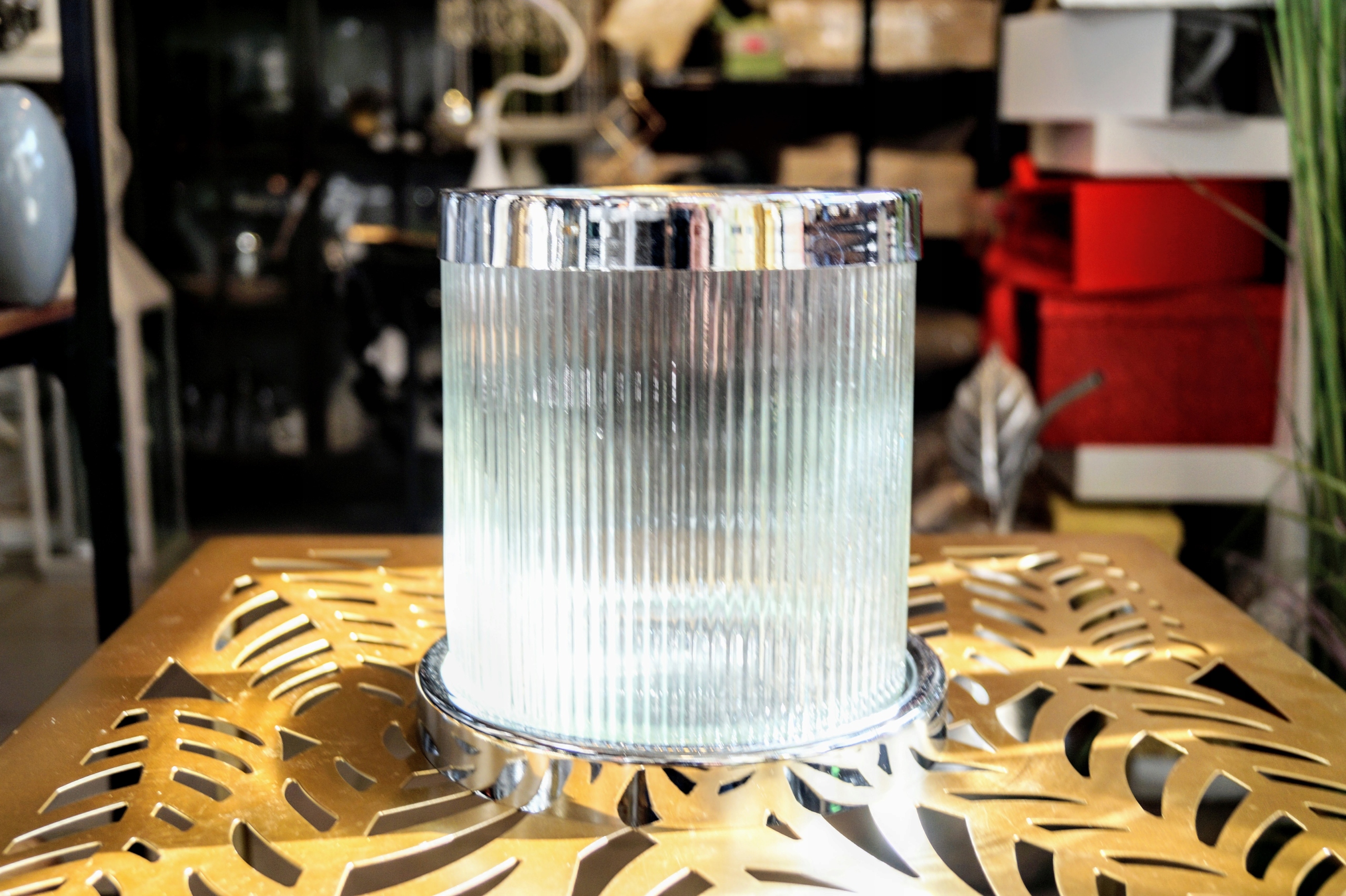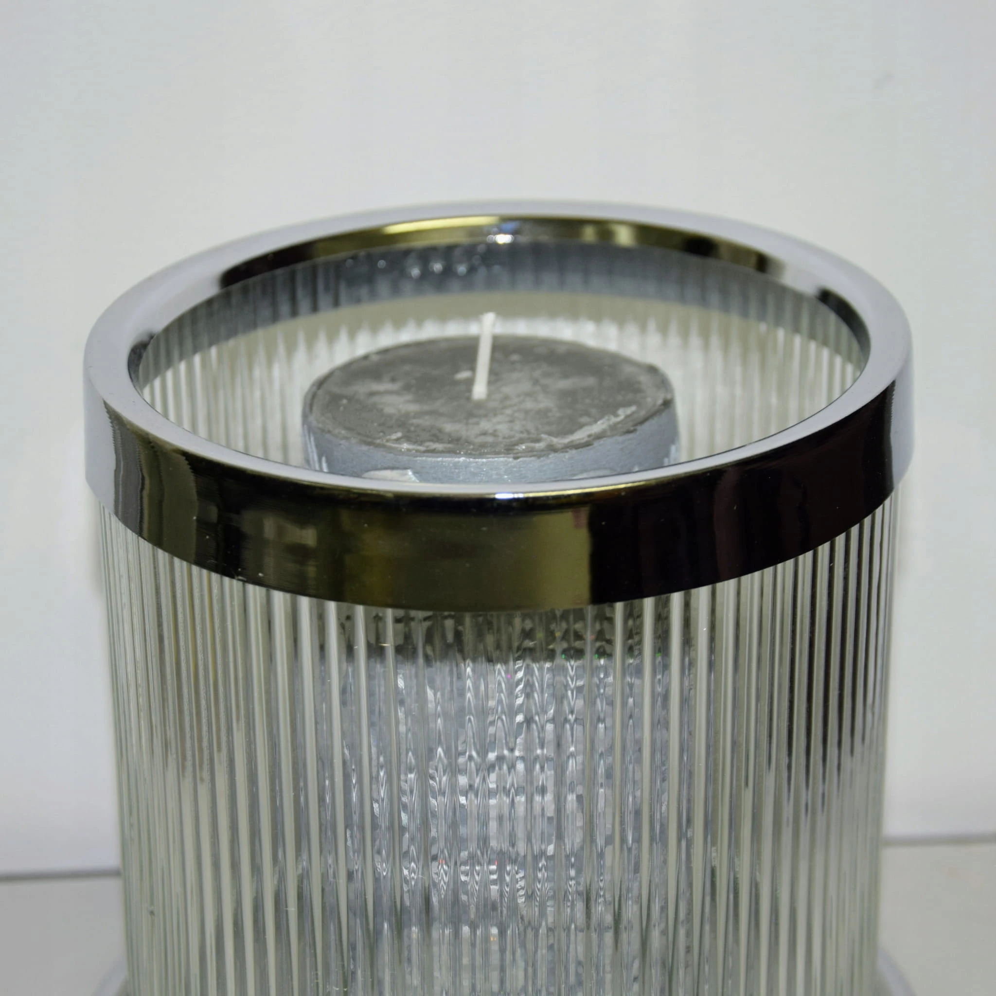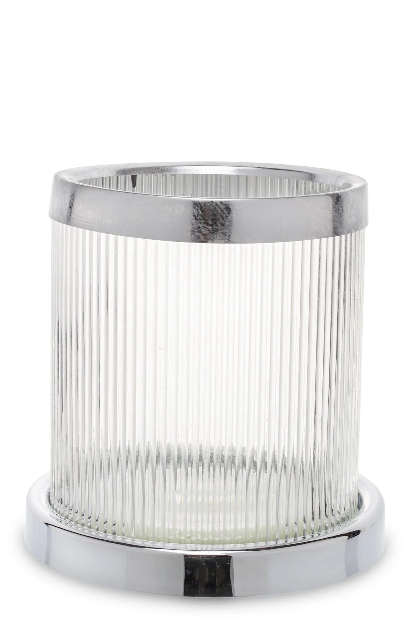Świecznik ze szklaną, perforowaną osłonką oraz wykończeniem w srebrnym kolorze.