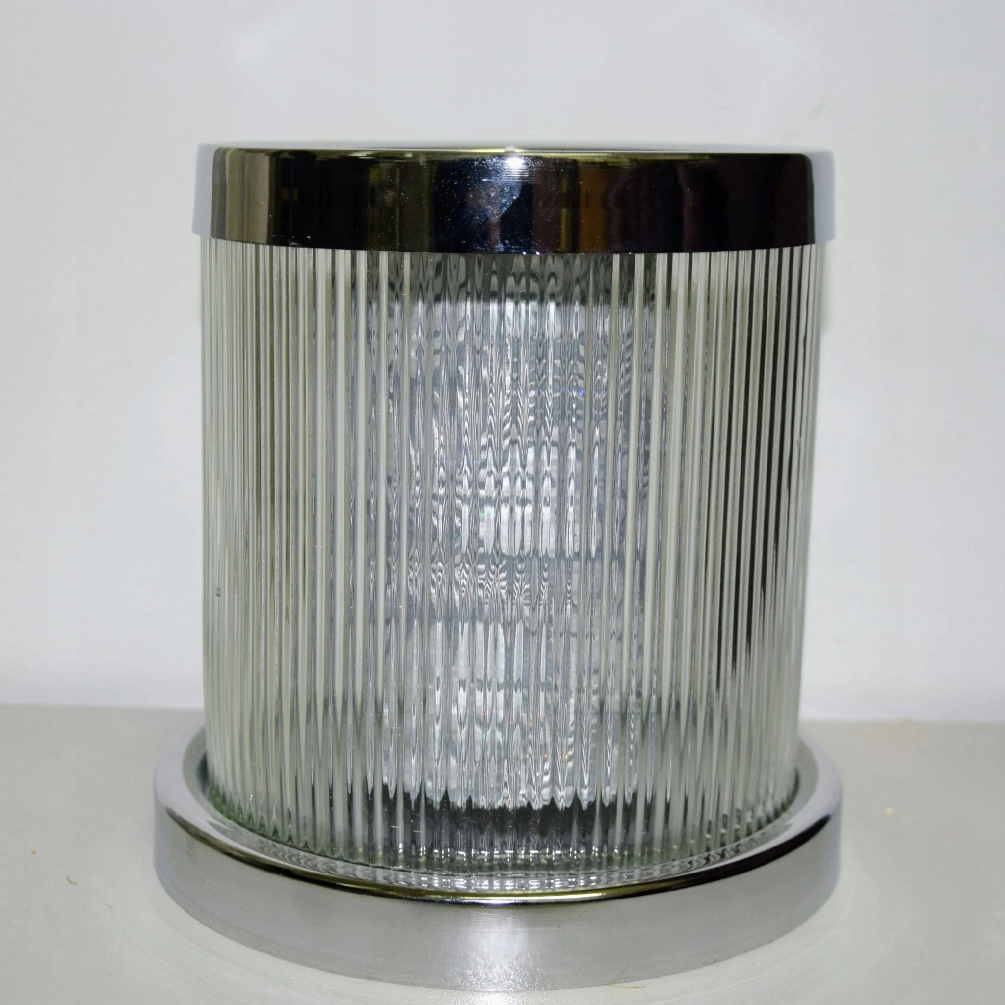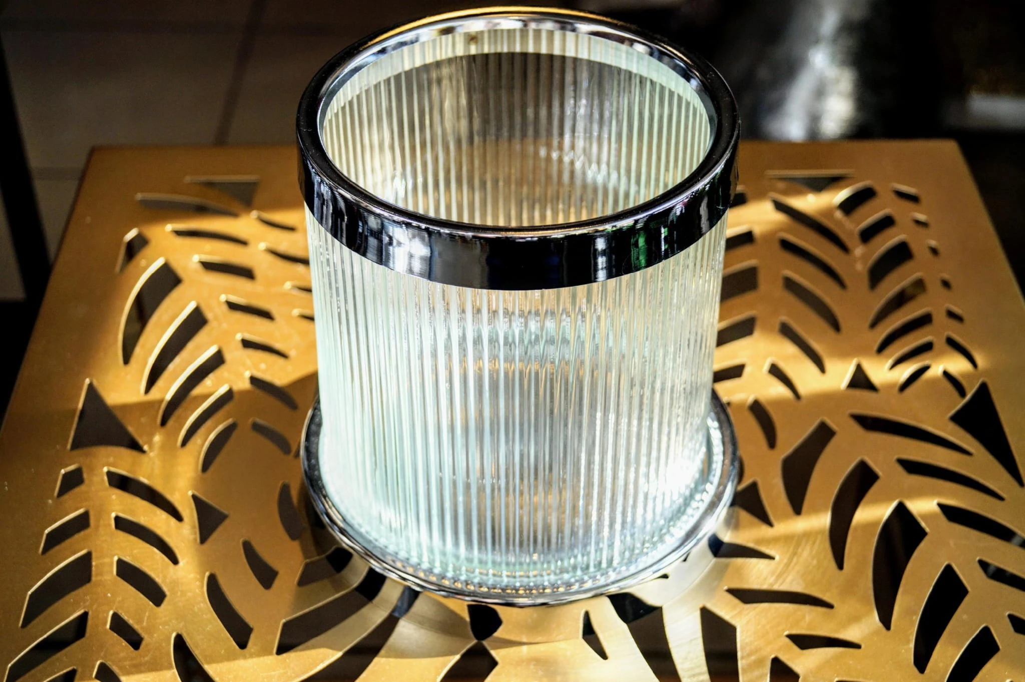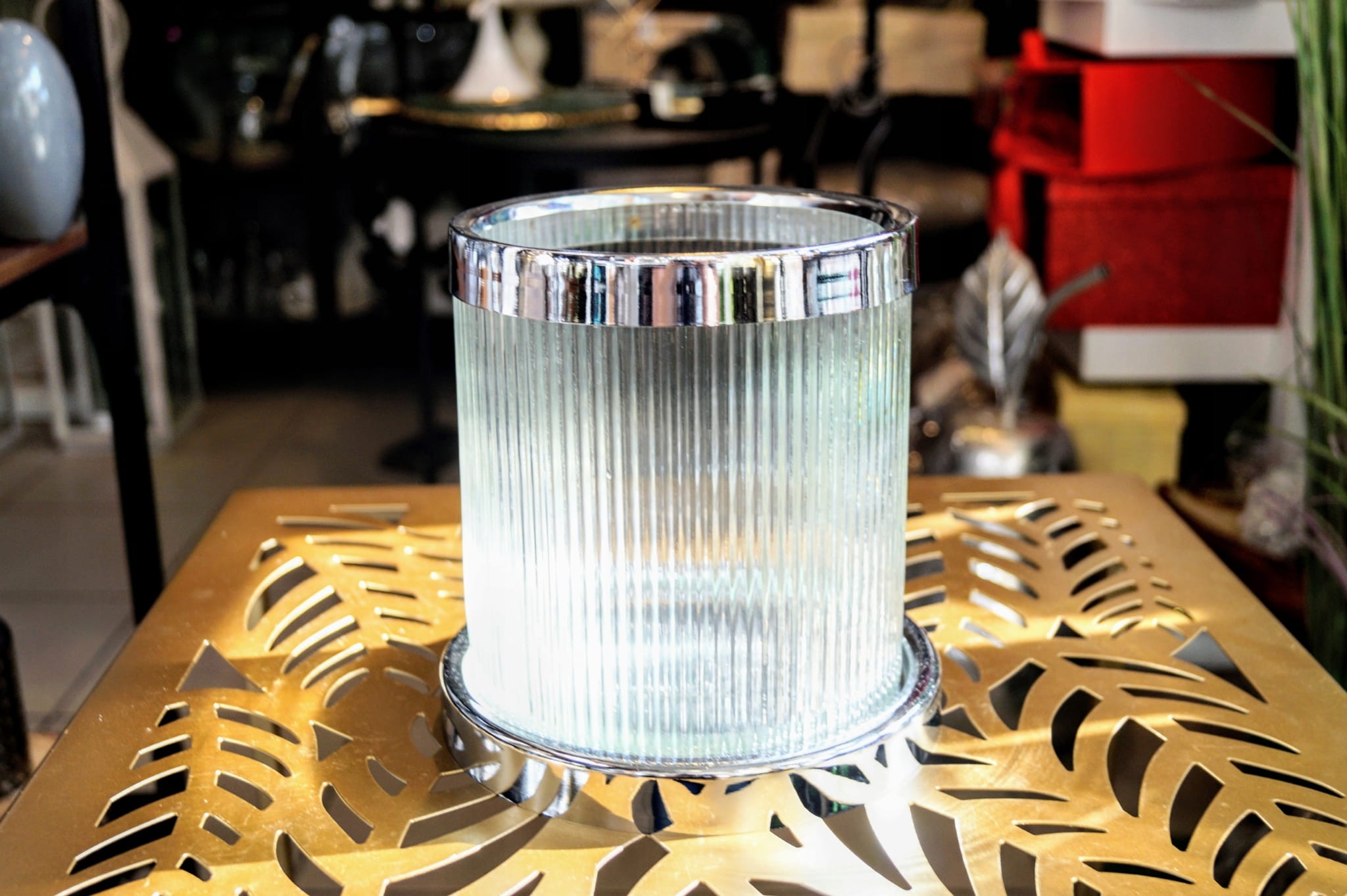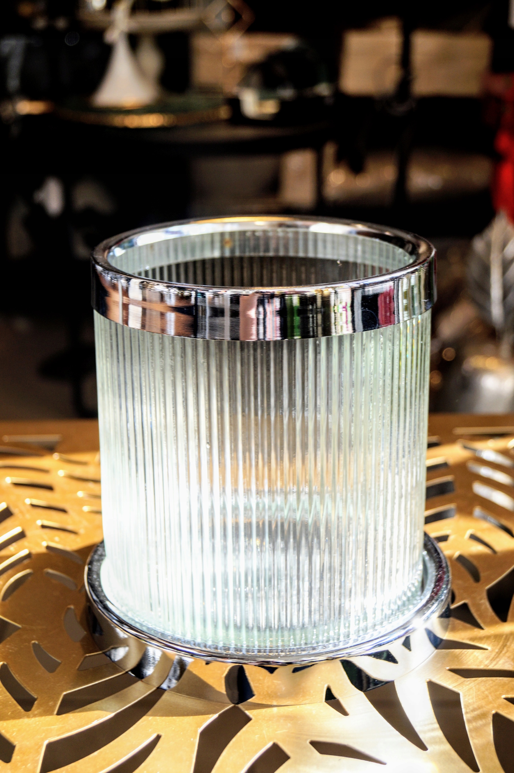 Świecznik ze szklaną, perforowaną osłonką oraz wykończeniem w srebrnym kolorze.