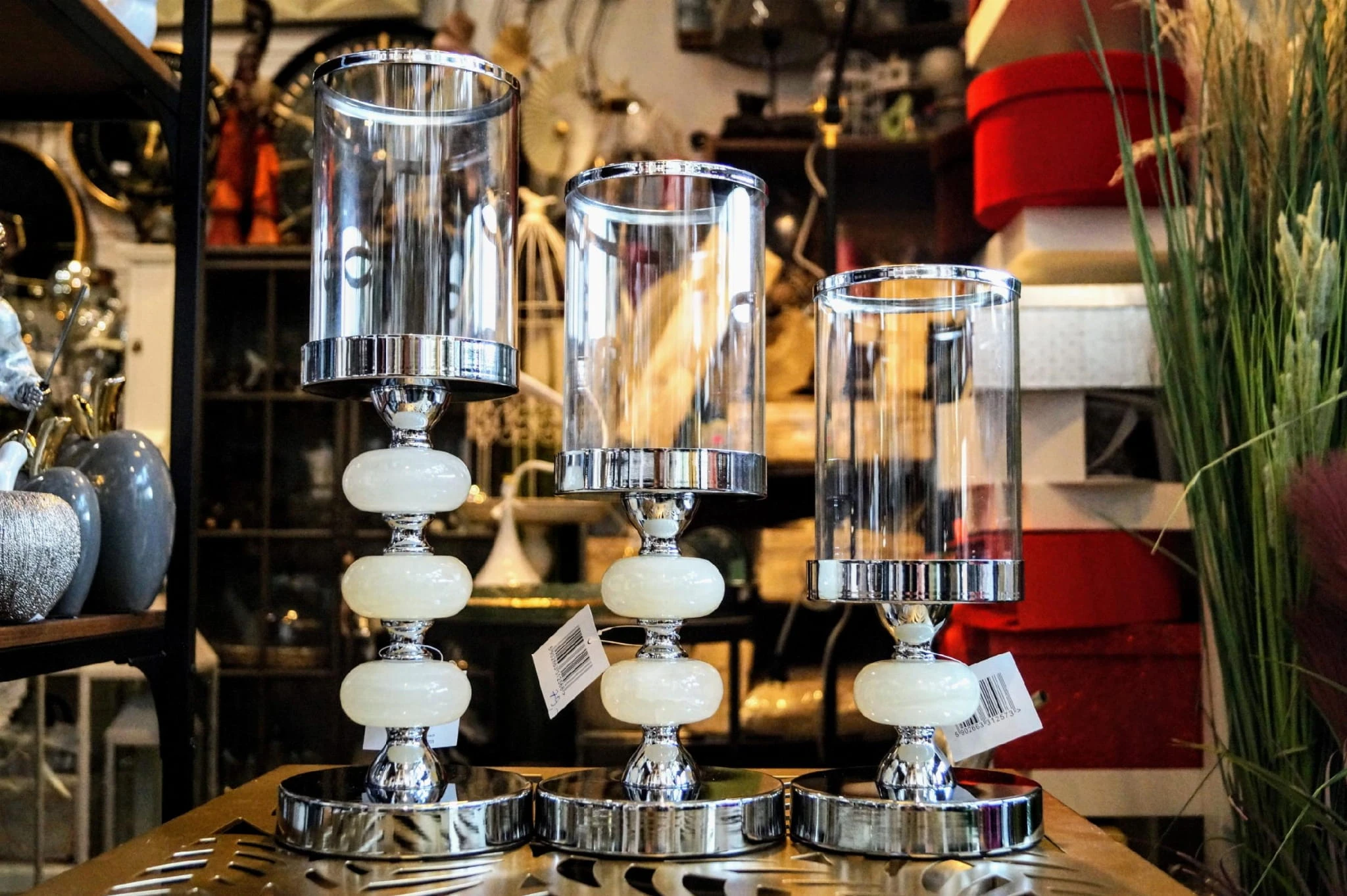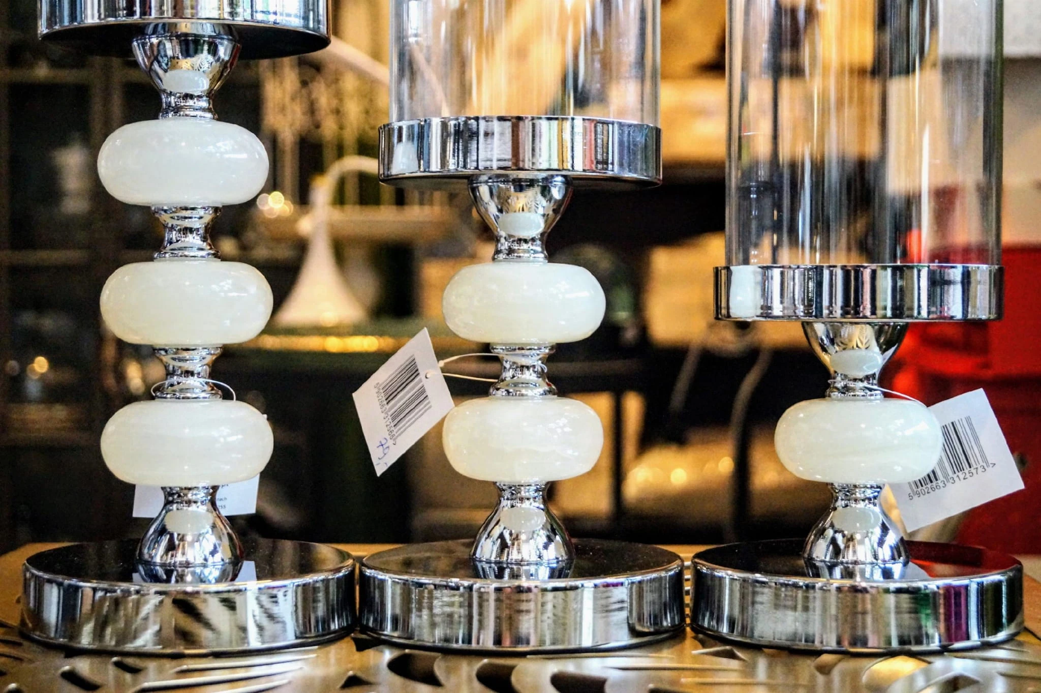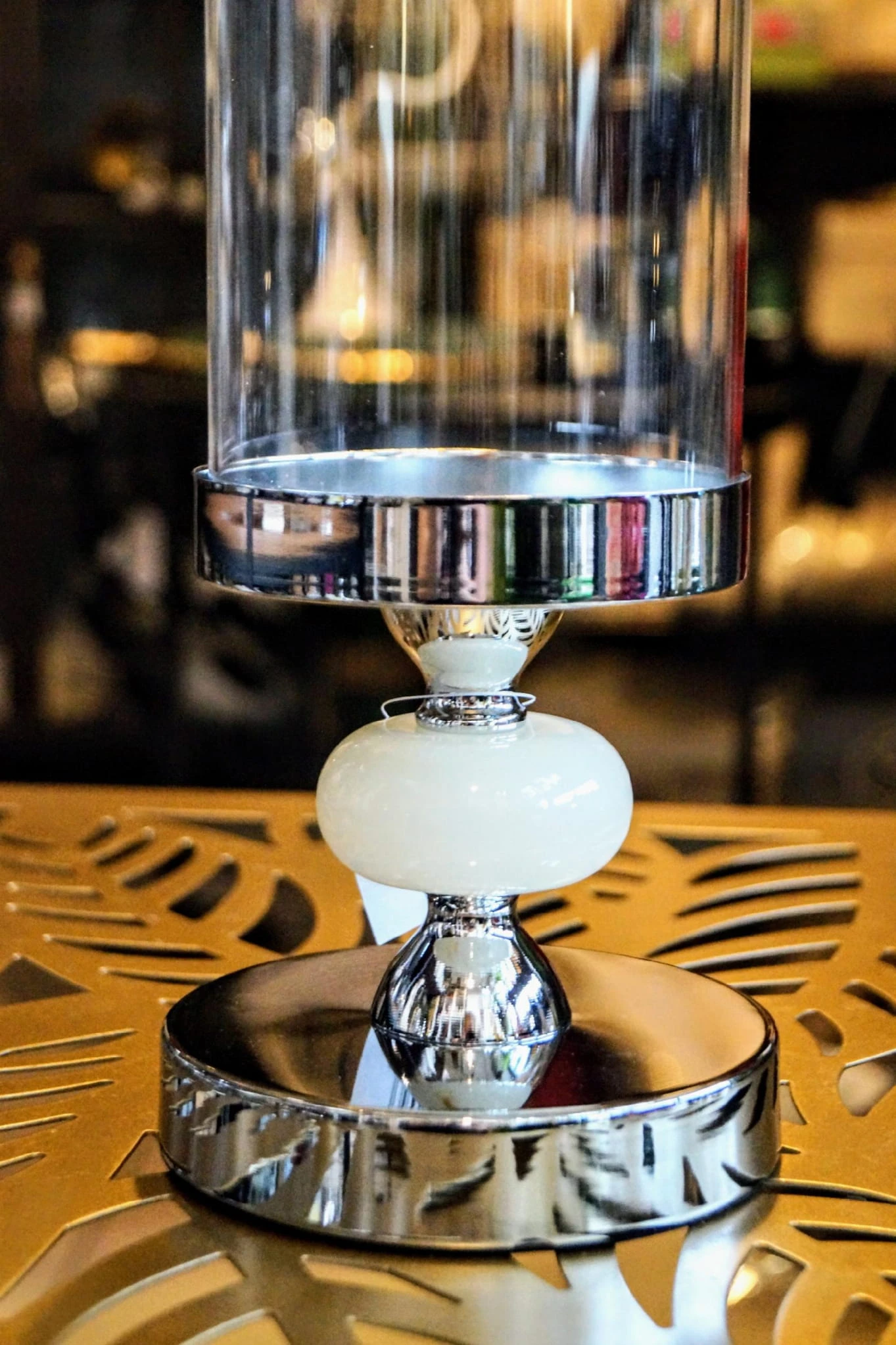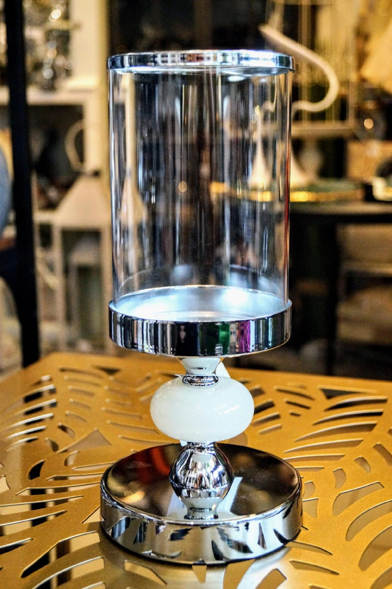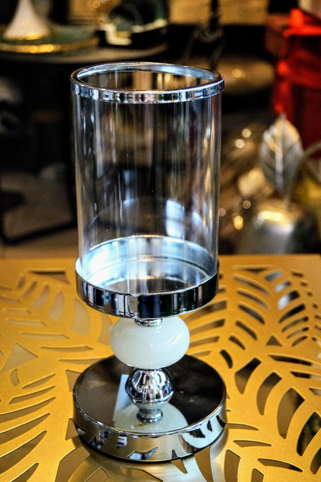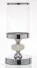 Szklany świecznik na metalowej podstawie w srebrnym kolorze, zdobiony jasnym krążkiem.