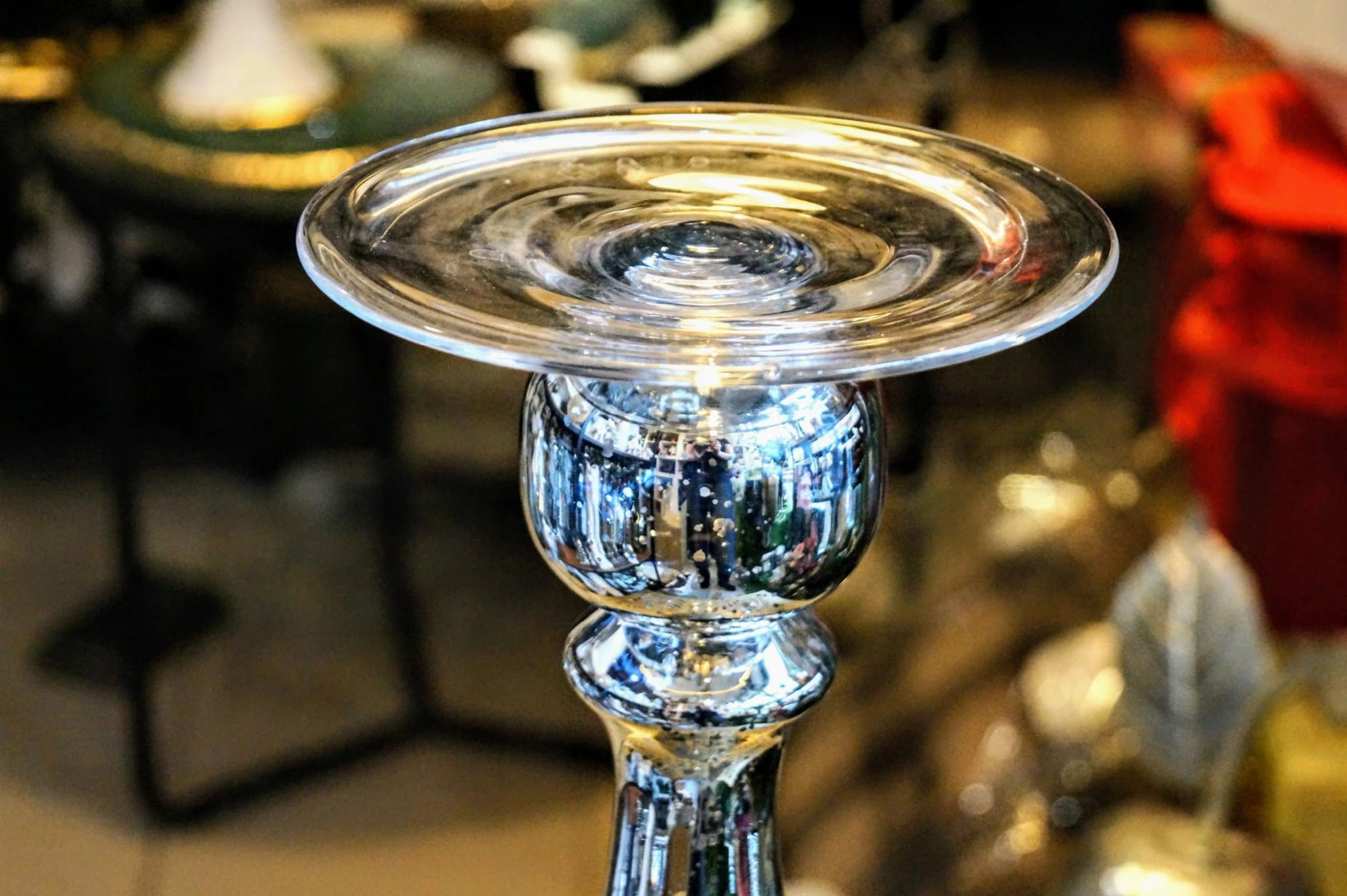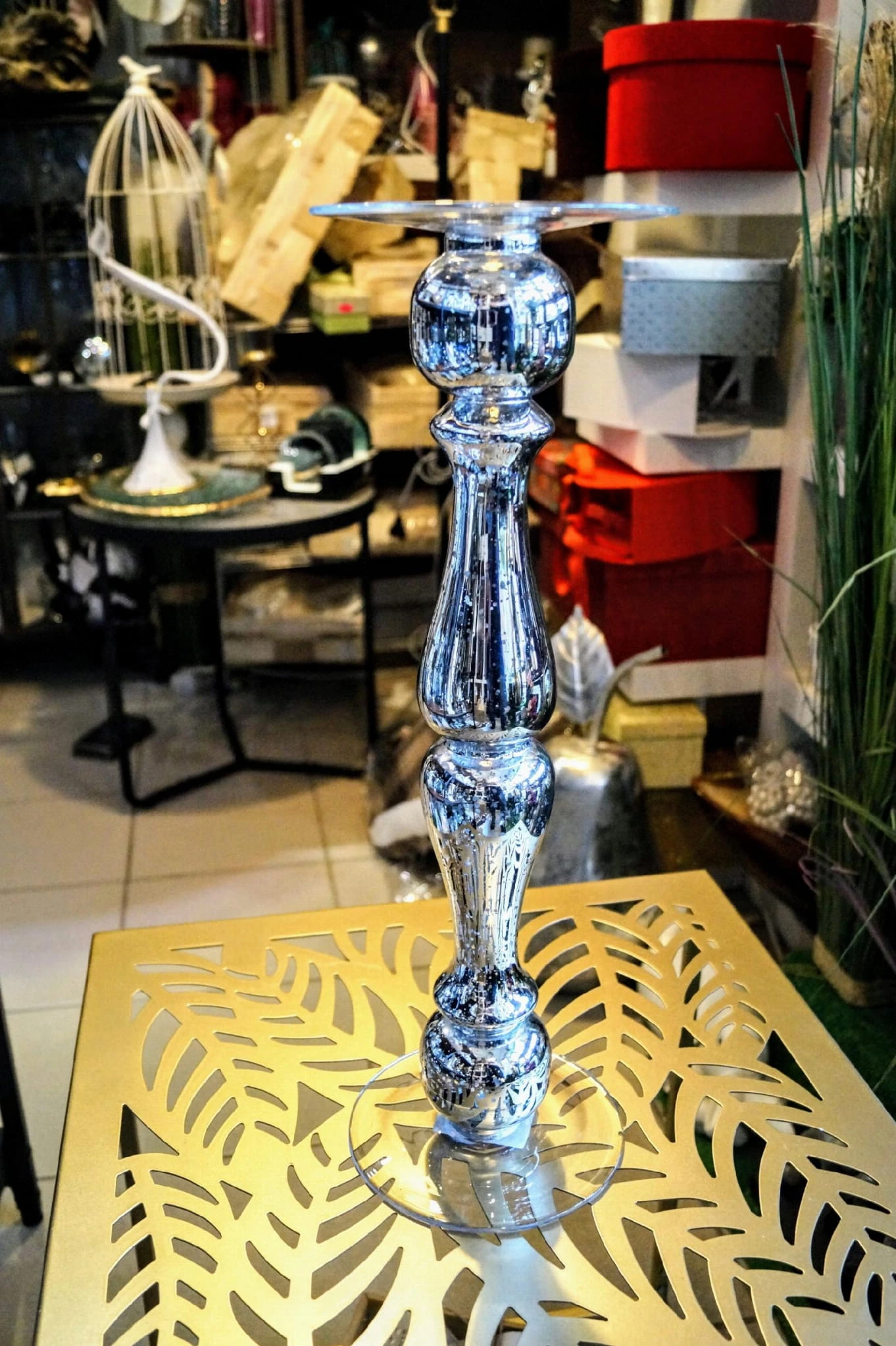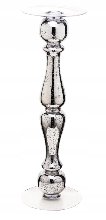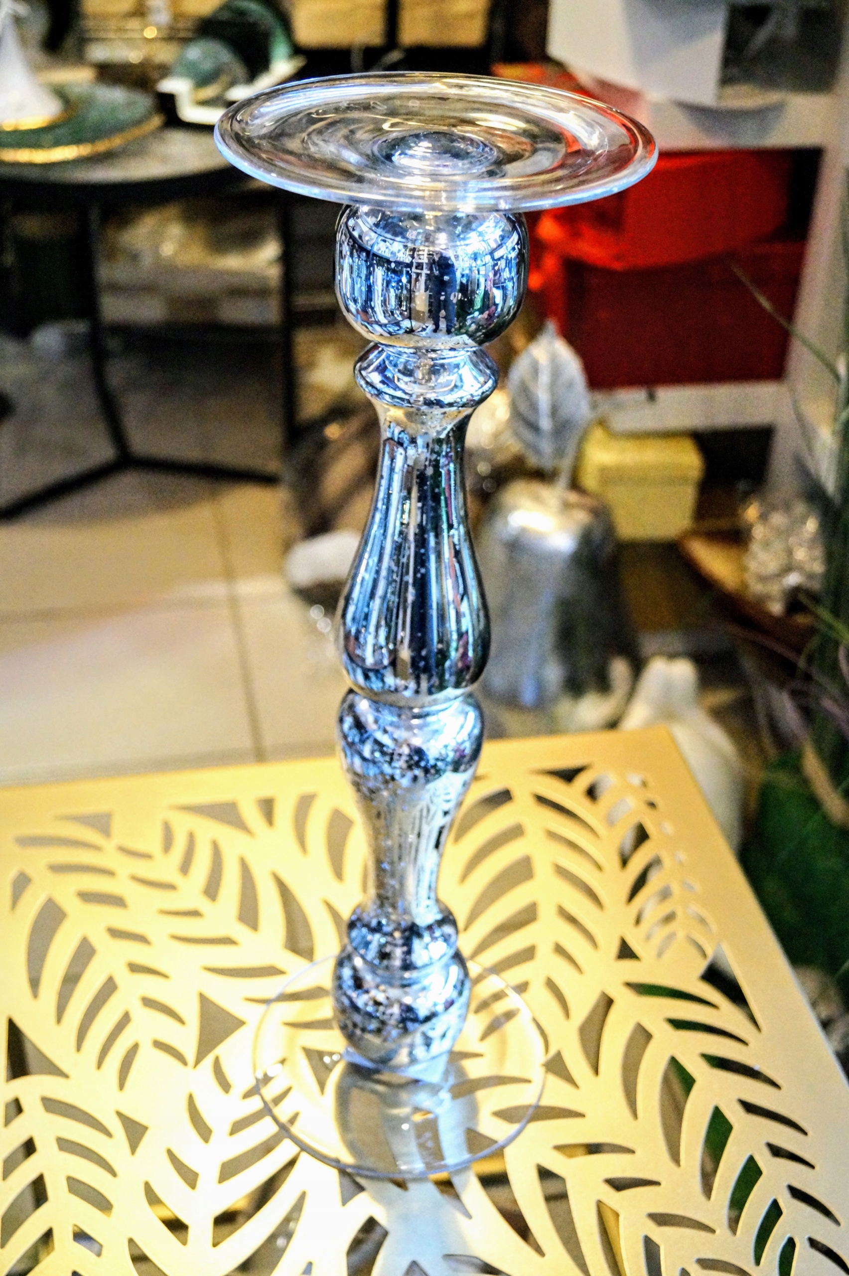 Szklany świecznik z nogą w kolorze srebra, przeznaczony na jedną świecę.