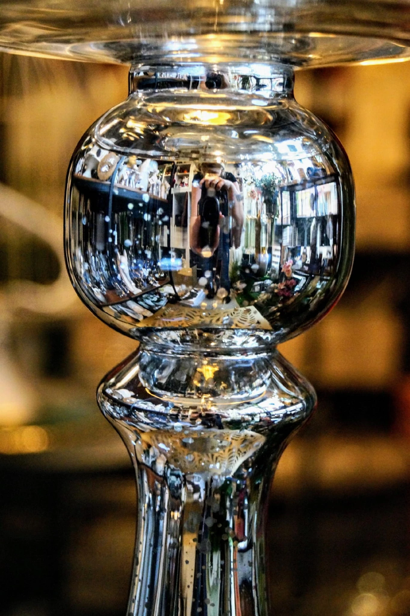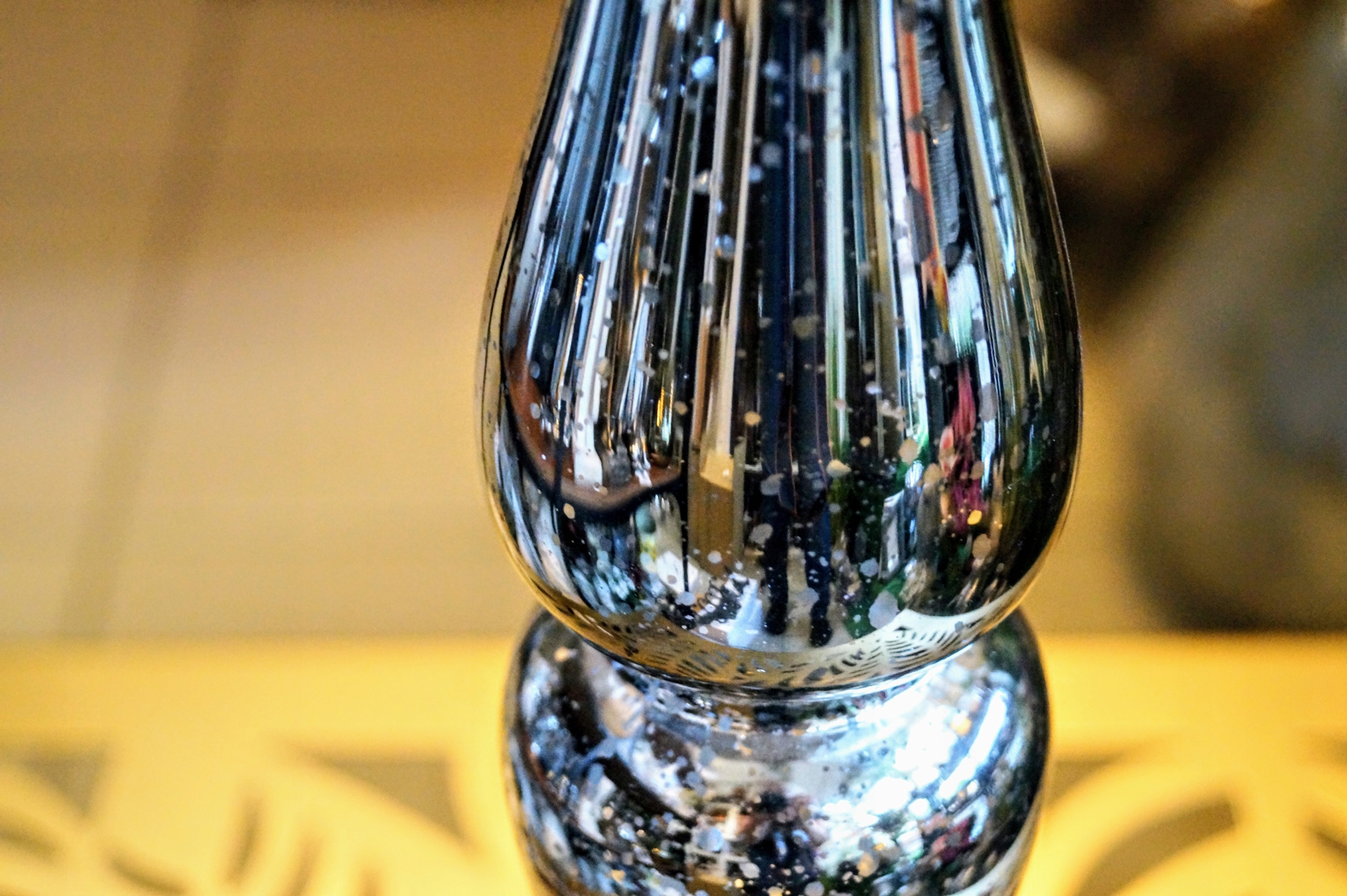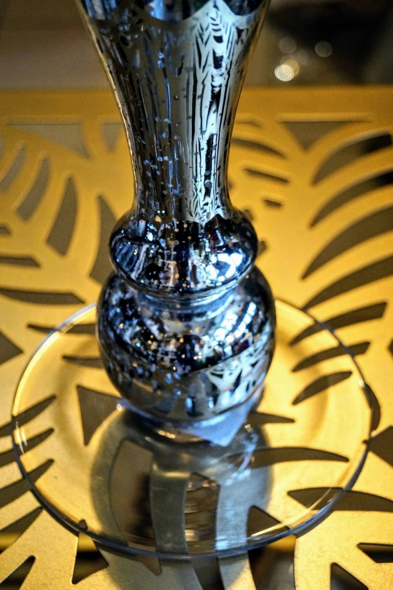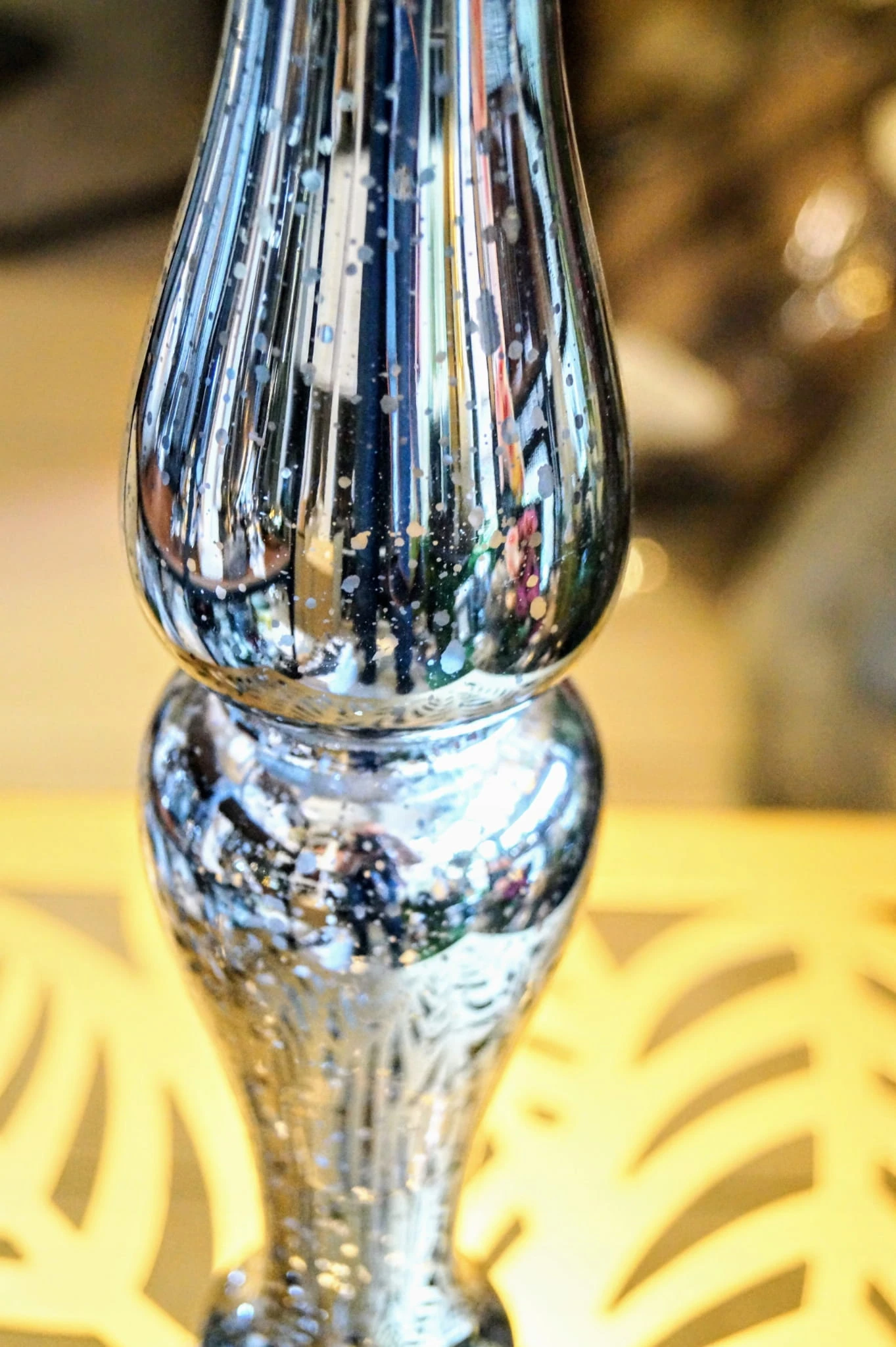 Szklany świecznik z nogą w kolorze srebra, przeznaczony na jedną świecę.