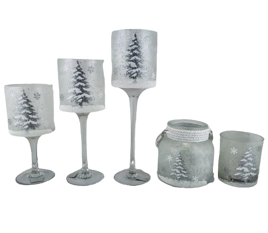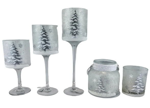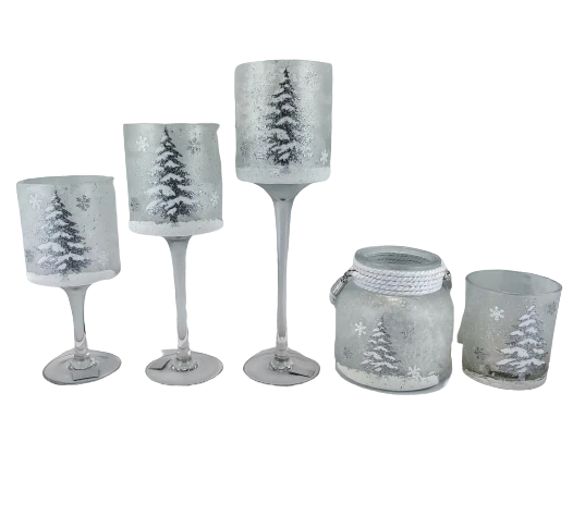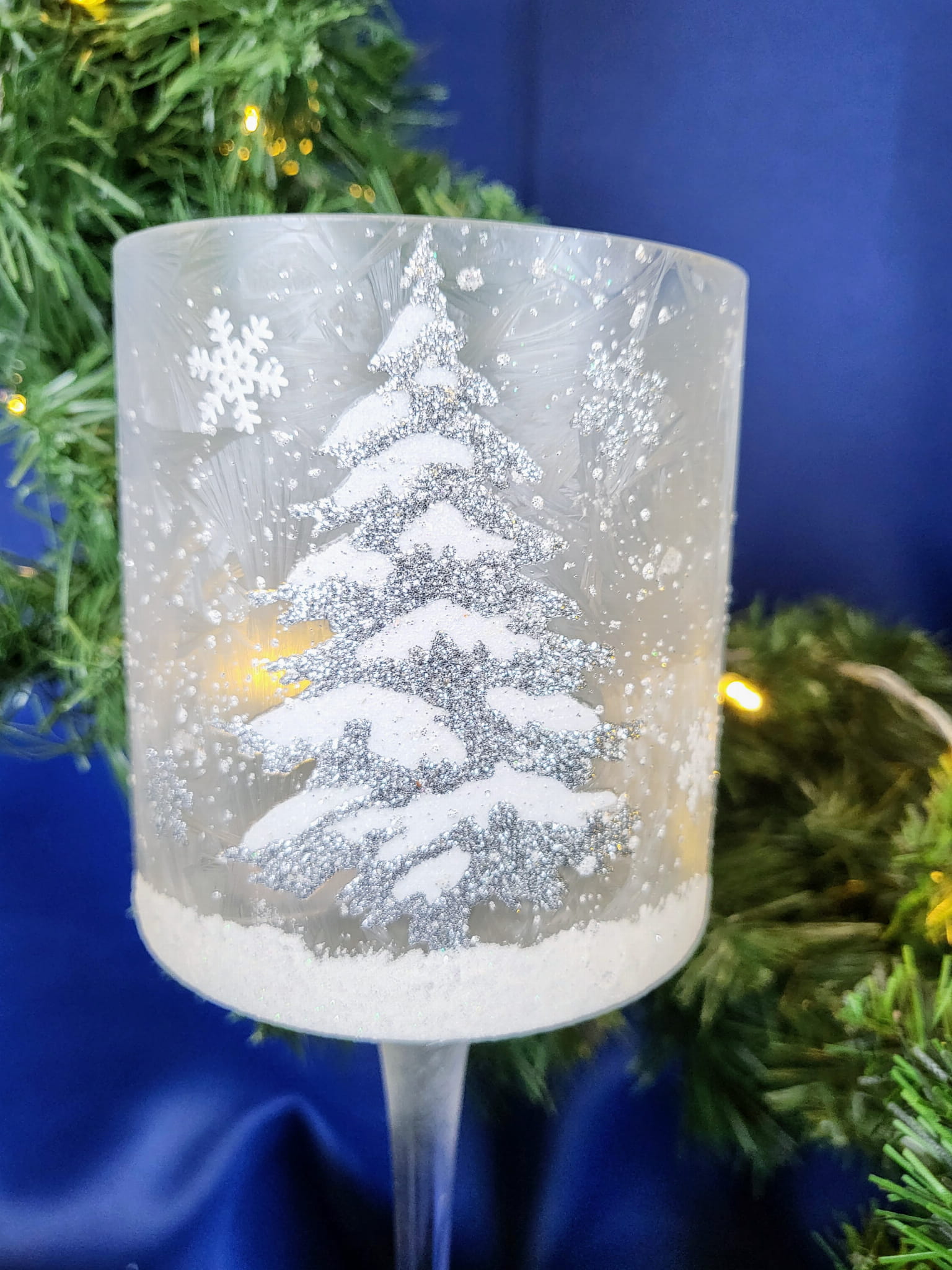 Świecznik kielich świąteczny z wzorem pięknej ośnieżonej choinki.