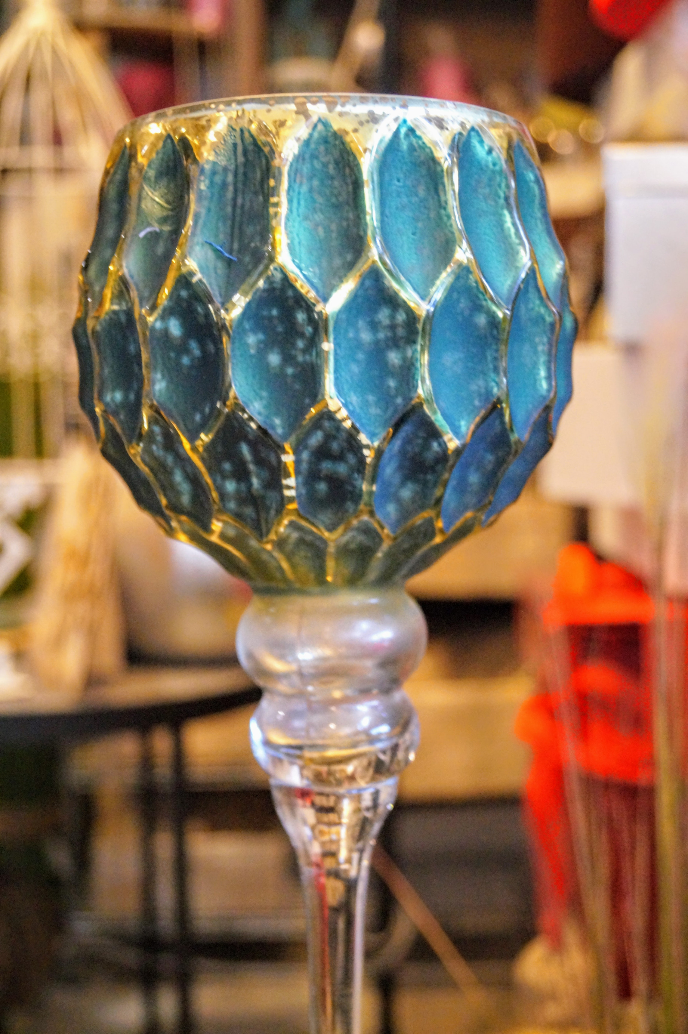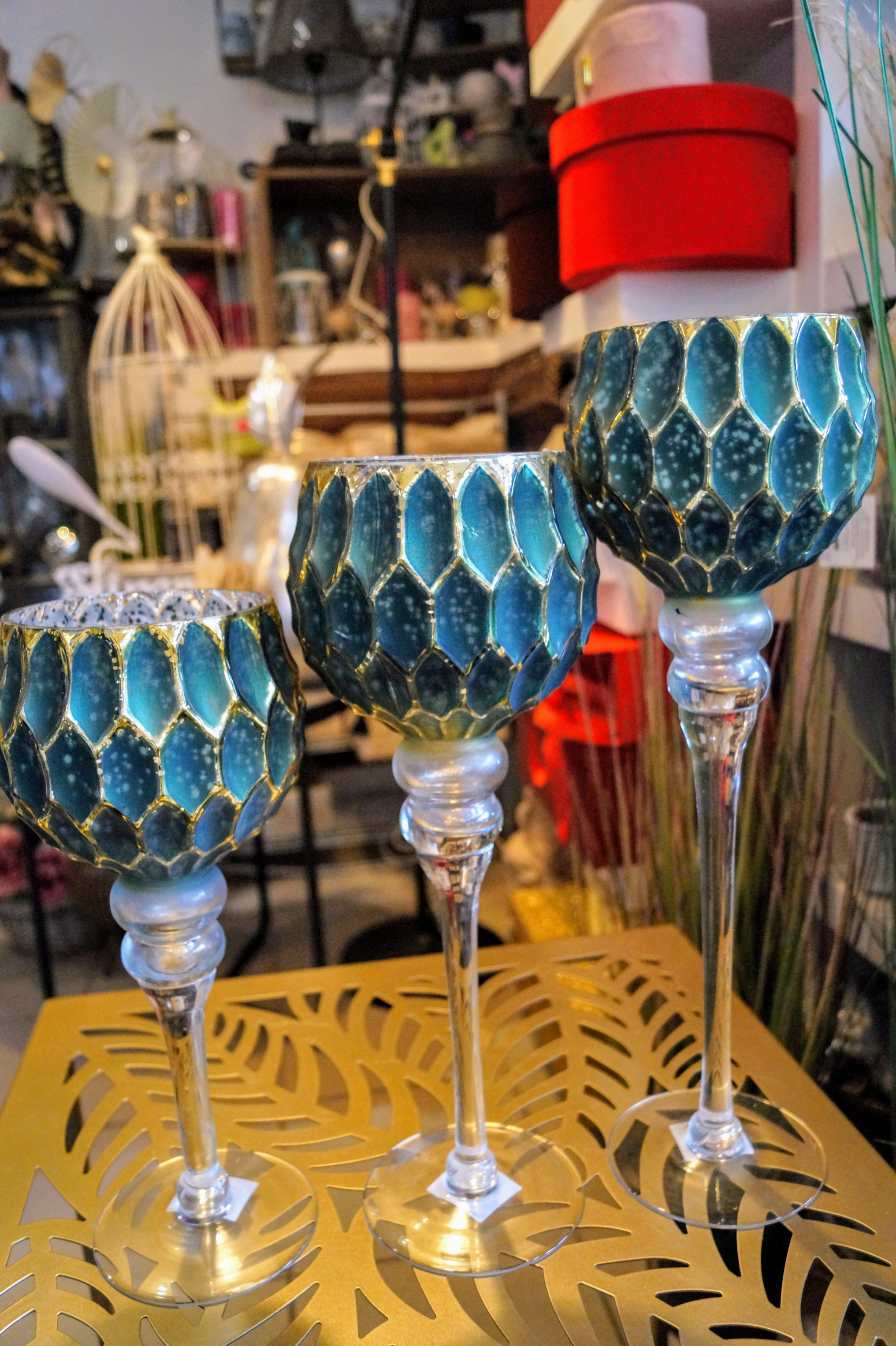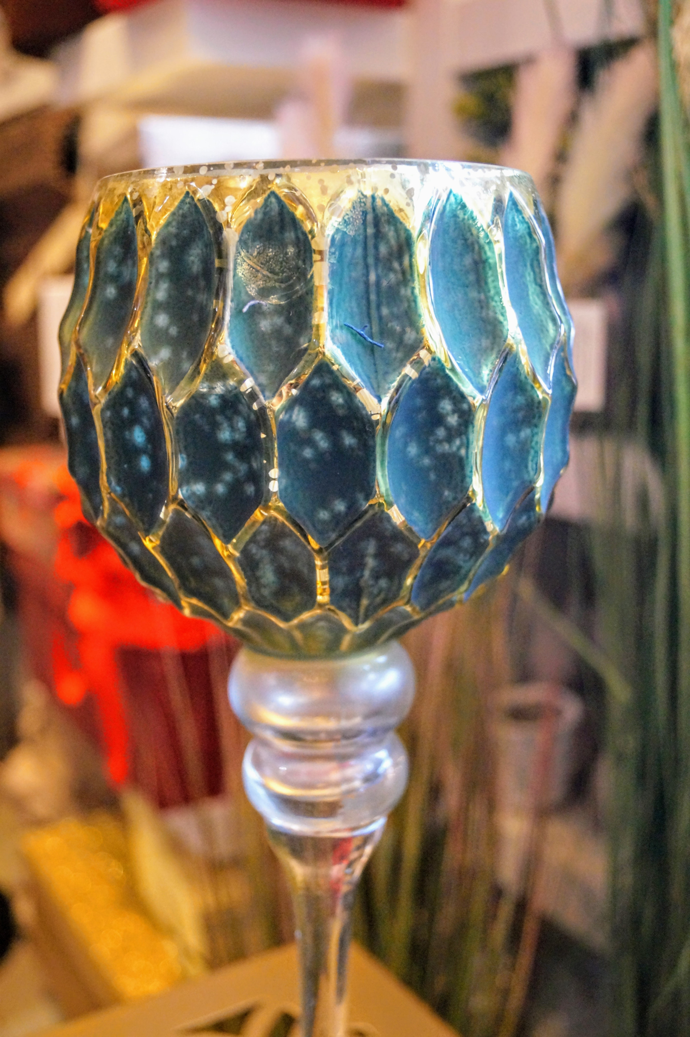 Zielony, szklany świecznik - kielich. Ozdobiony prążkami i nakrapianym wzorem, wnętzre kielicha srebrne. Doskonale sprawdzi się zarówno jako ozdoba do dekoracji sypialni, jaki i praktyczny, budujący ciepłą atmosferę dodatek w Twoim domu. Oryginalne szklane kielichy do świec są idealnym akcentem dekoracyjnym. Świecznik, na wysokiej nóżce pasuje idealnie do nowoczesnego wnętrza w stylistyce glamour oraz klasycznego wystroju salonu. Można go używać ze świeczkami - podgrzewaczami typu tealight.