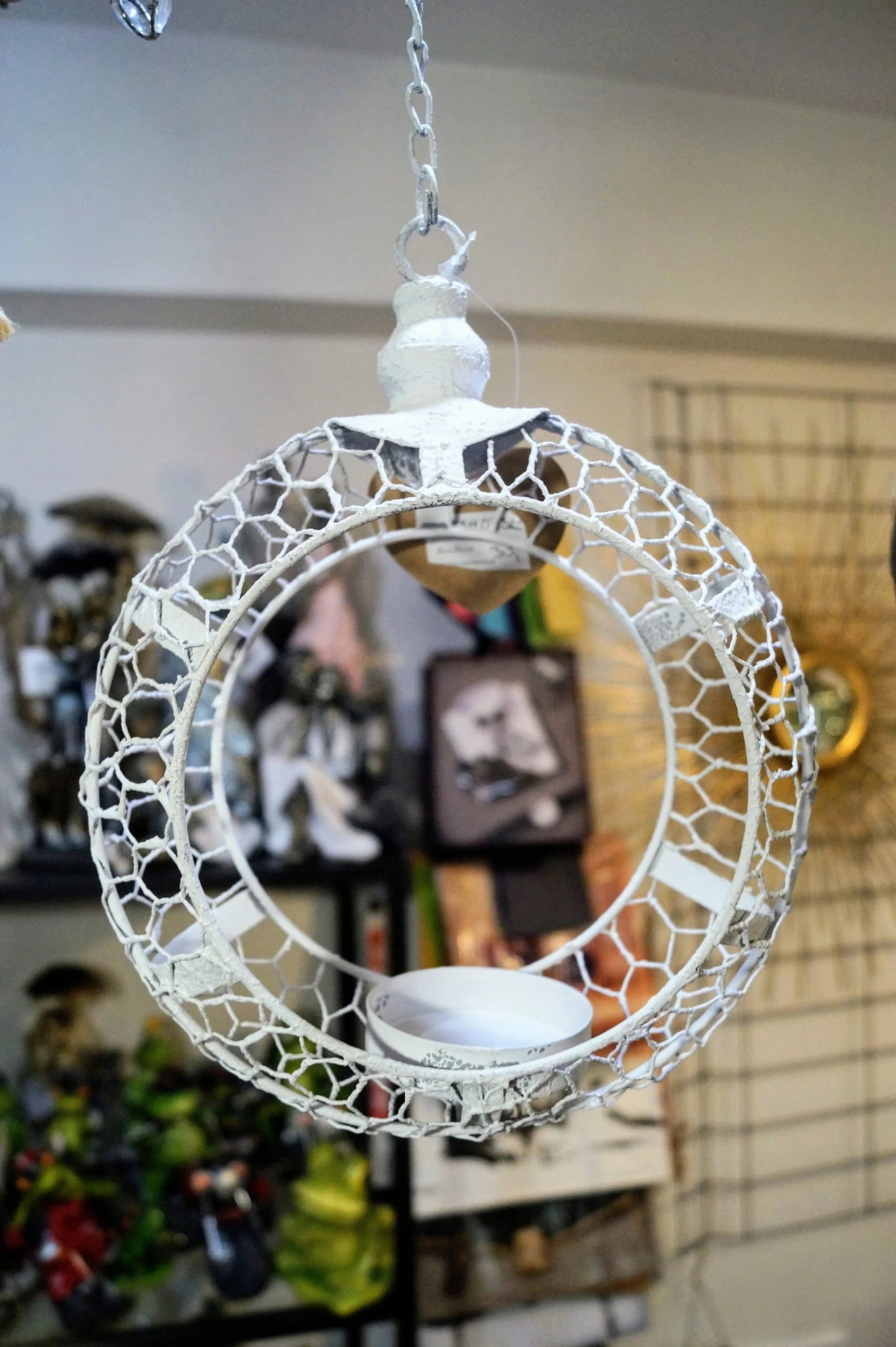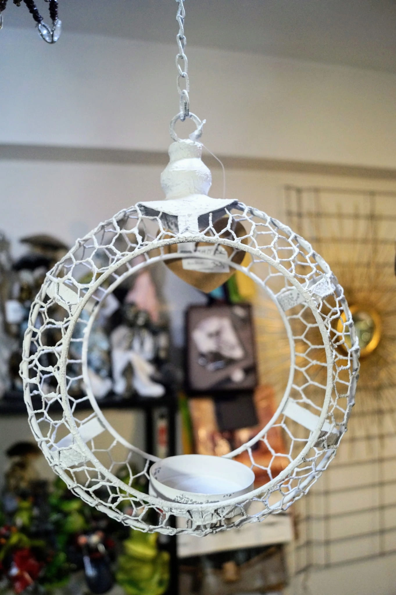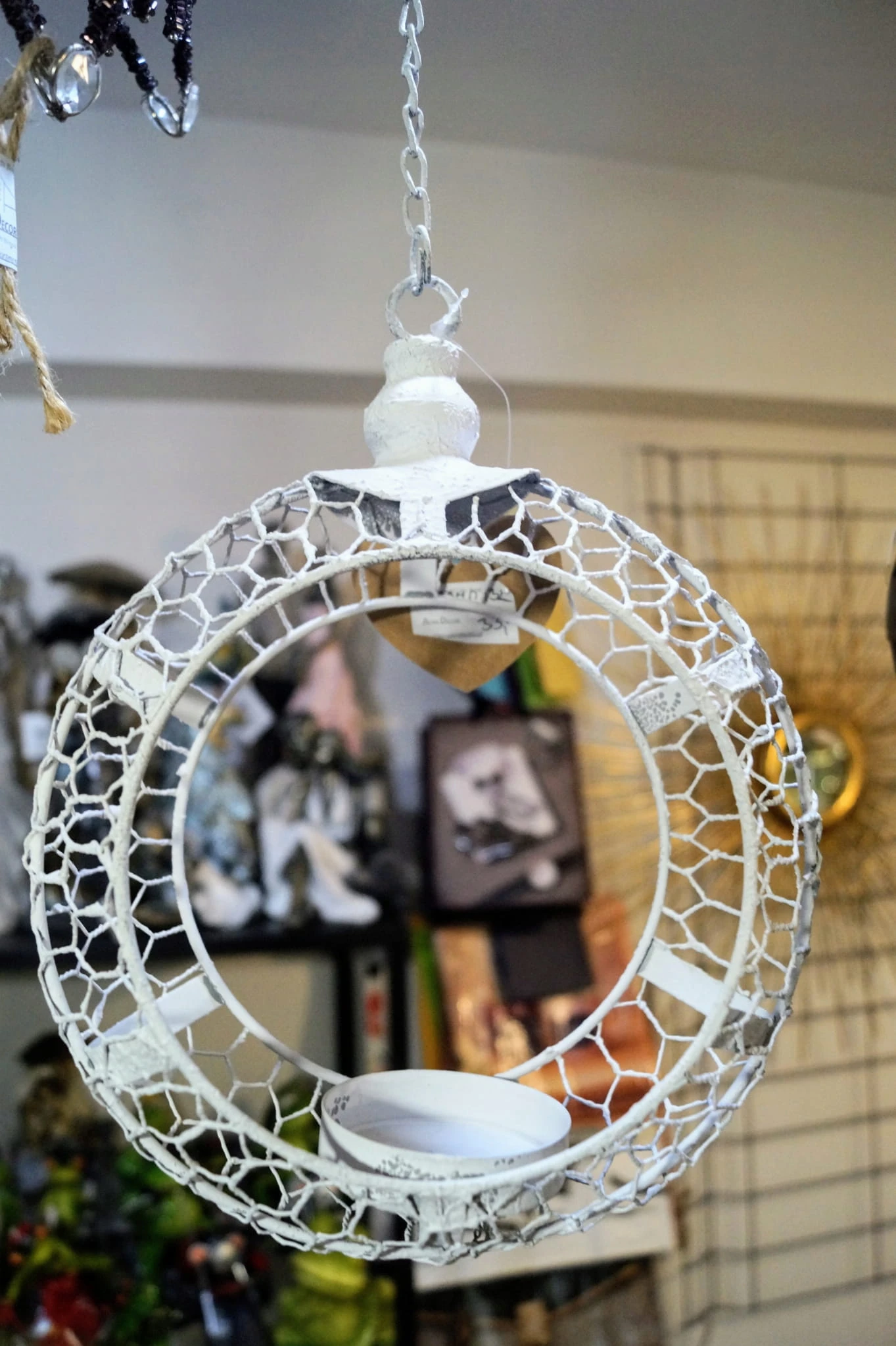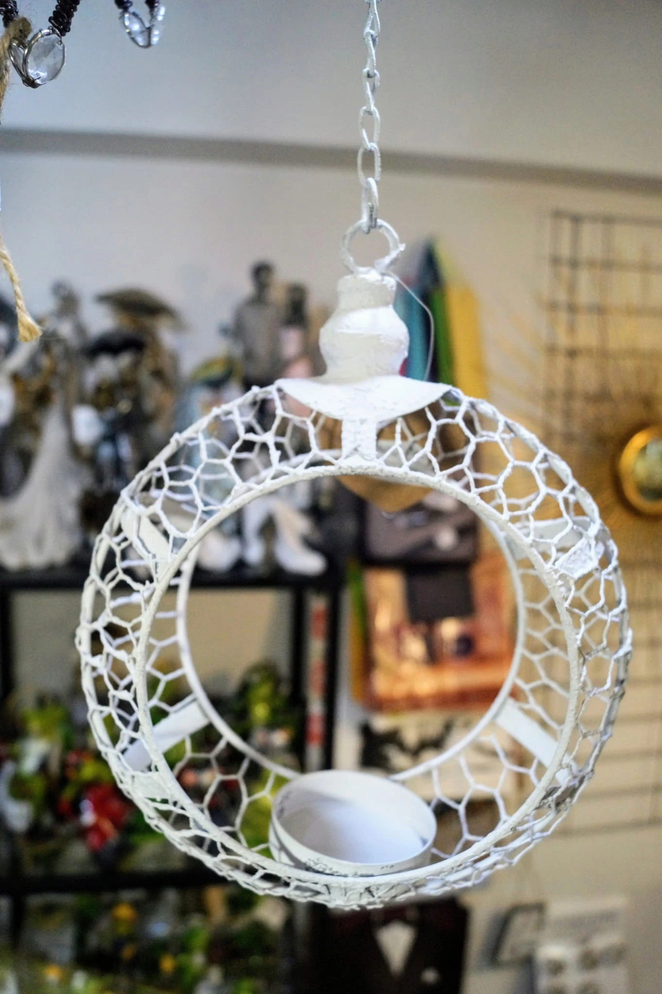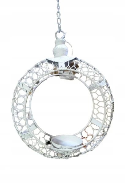 Przedmiotem oferty jest przepiękny świecznik do zawieszenia. W formie wiszącego na łańcuszku białego okręgu z miejscem na świecę.