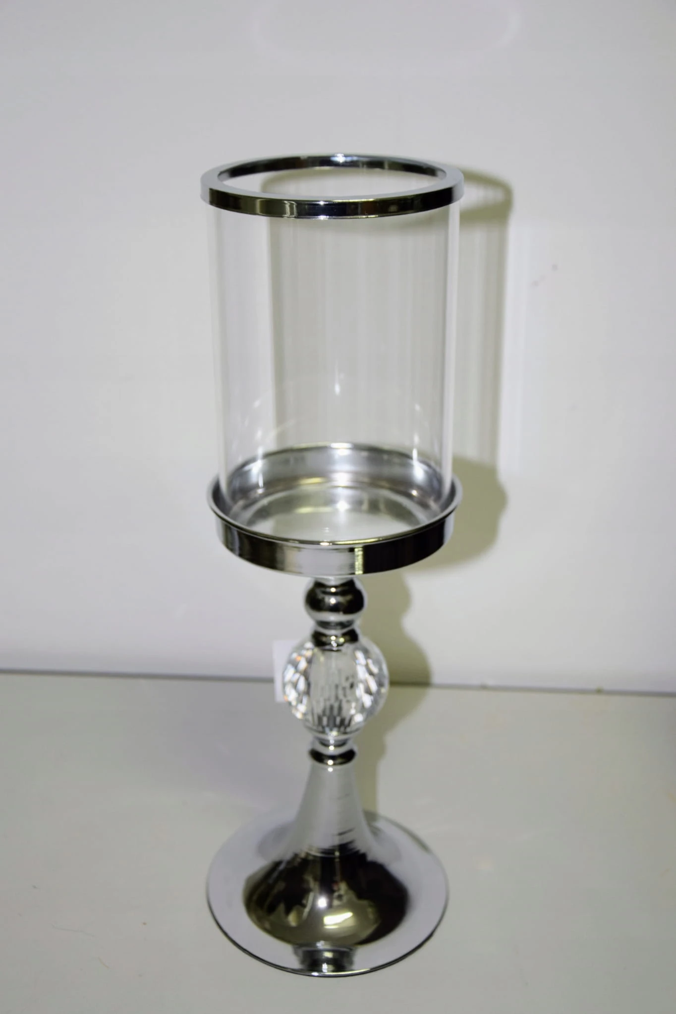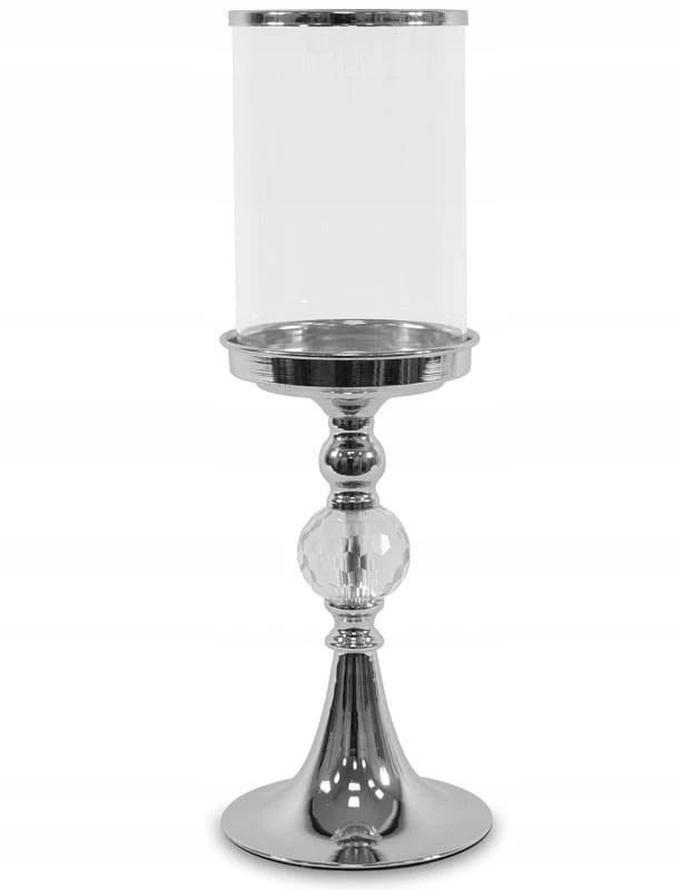 Szklany świecznik na metalowej podstawie w srebrnym kolorze, zdobiony przezroczystym krążkiem.