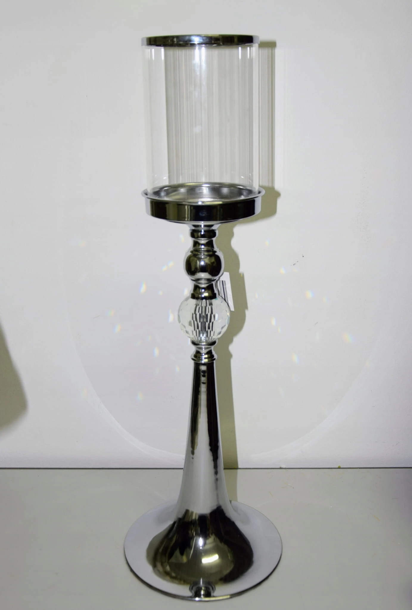 Szklany świecznik na metalowej podstawie w srebrnym kolorze, zdobiony przezroczystym krążkiem.