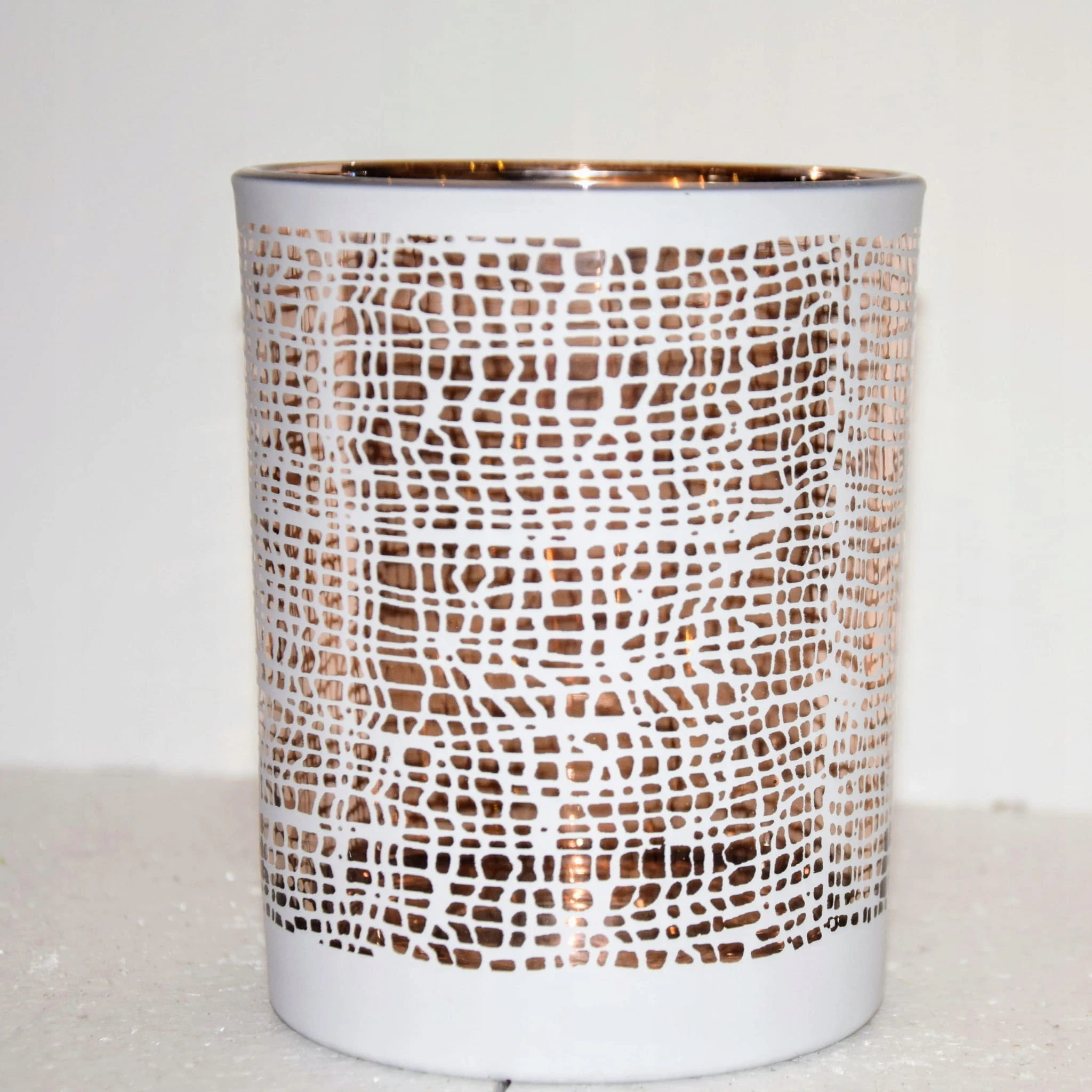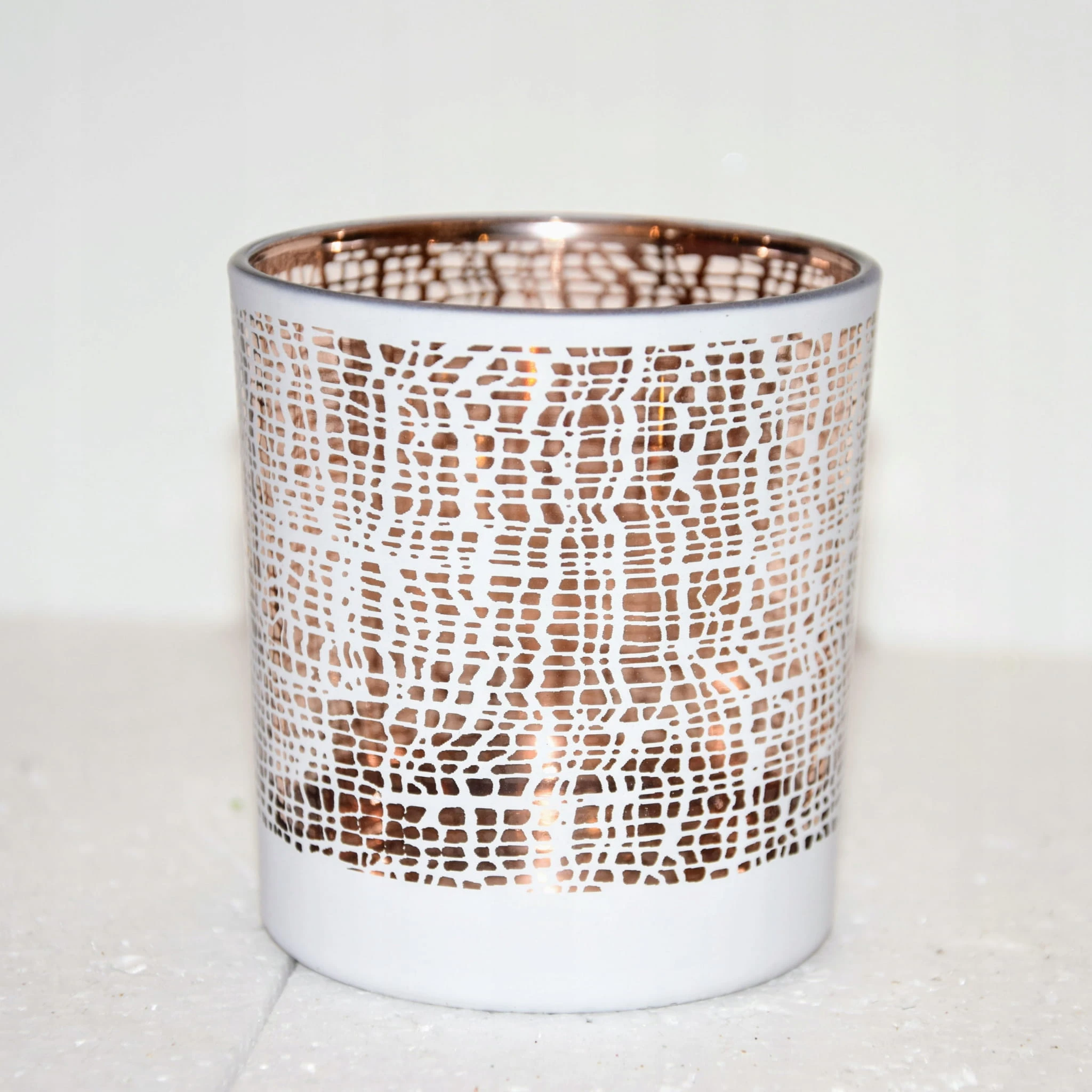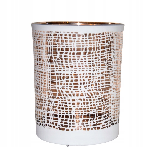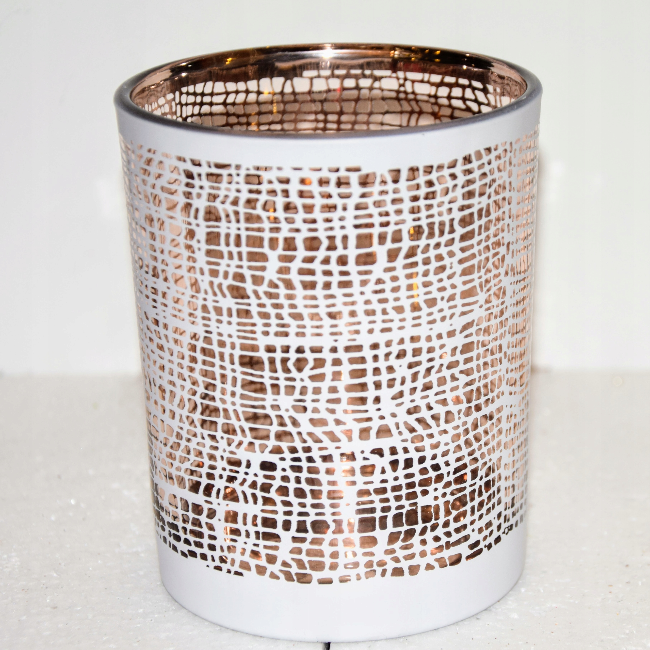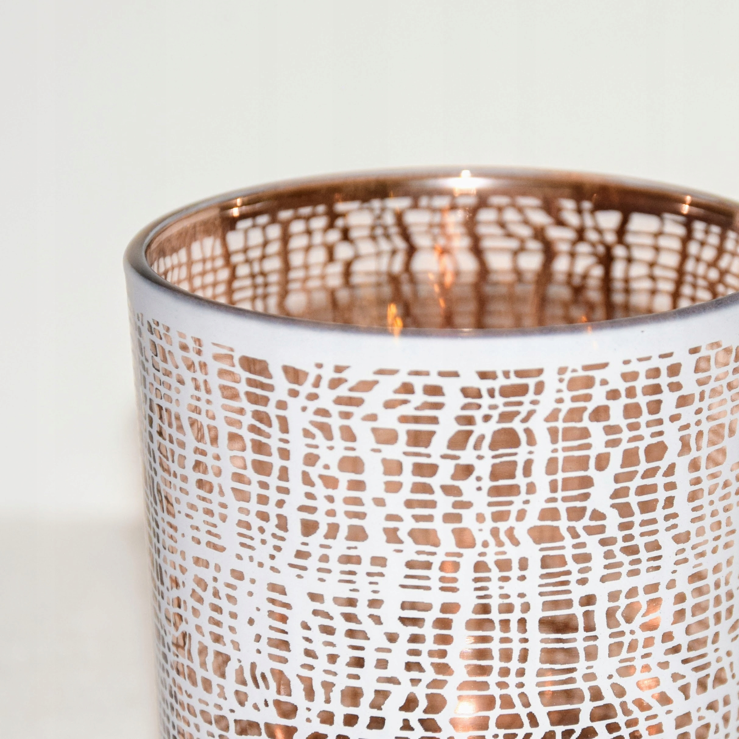 Szklany, biały snake z złoto-różowym wnętrzem. Polecany do małych świeczek typu tealight. Idealnie wkomponuje się w nowoczesne, skandynawskie jak i loftowe wnętrze.