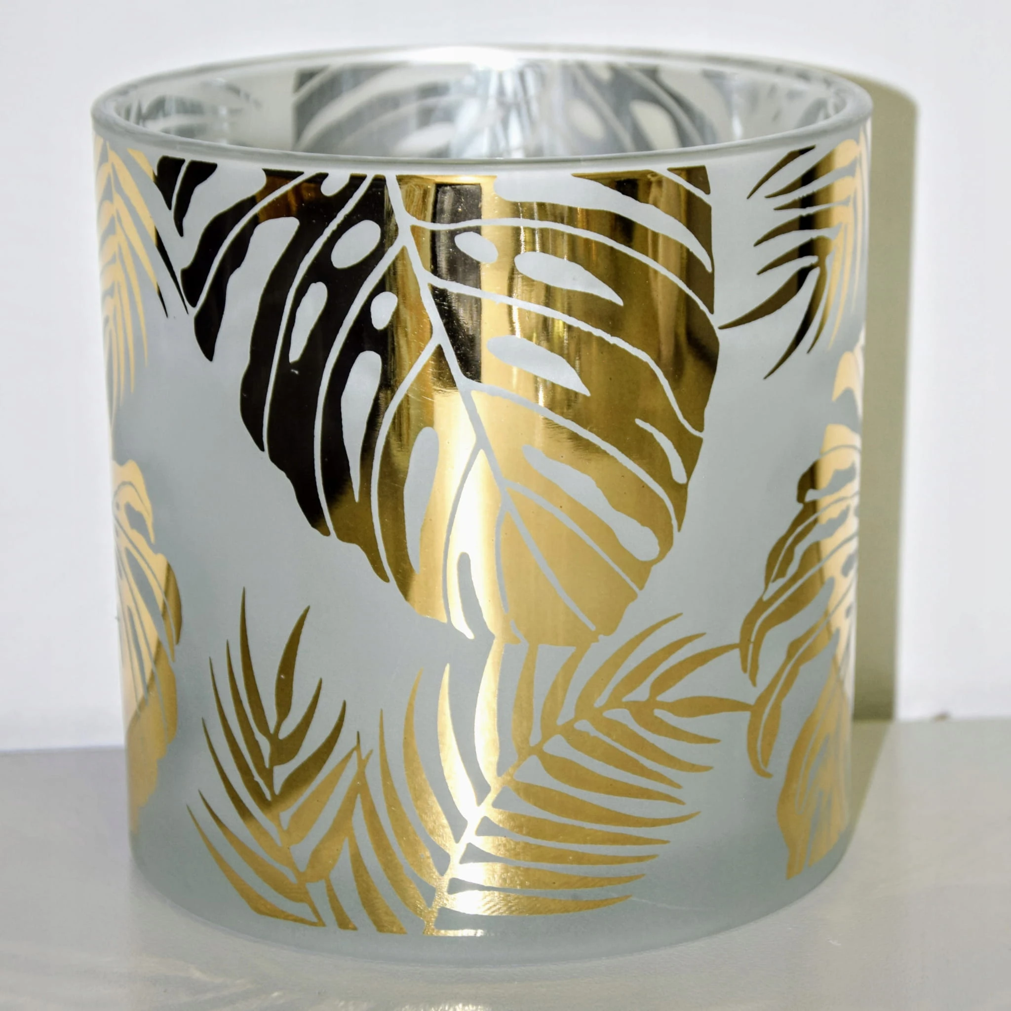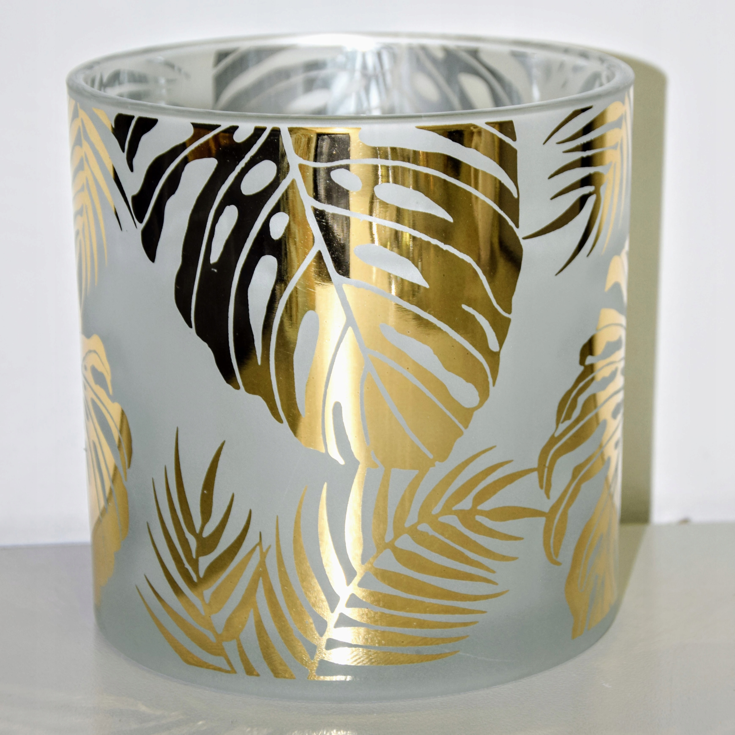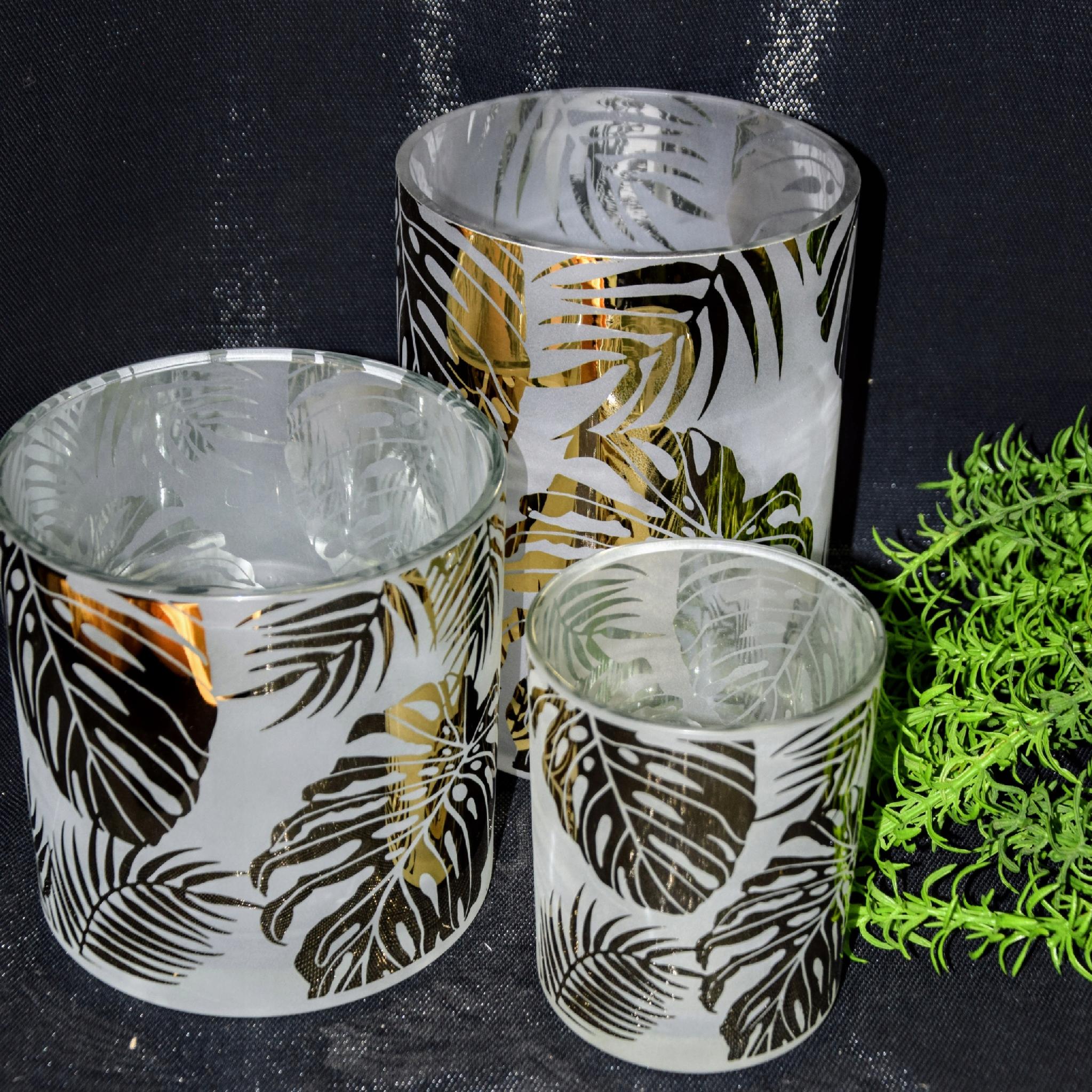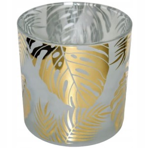 ŚWIECZNIK SZKLANY W LIŚCIE ZŁOTY ŚREDNI 15X15X15