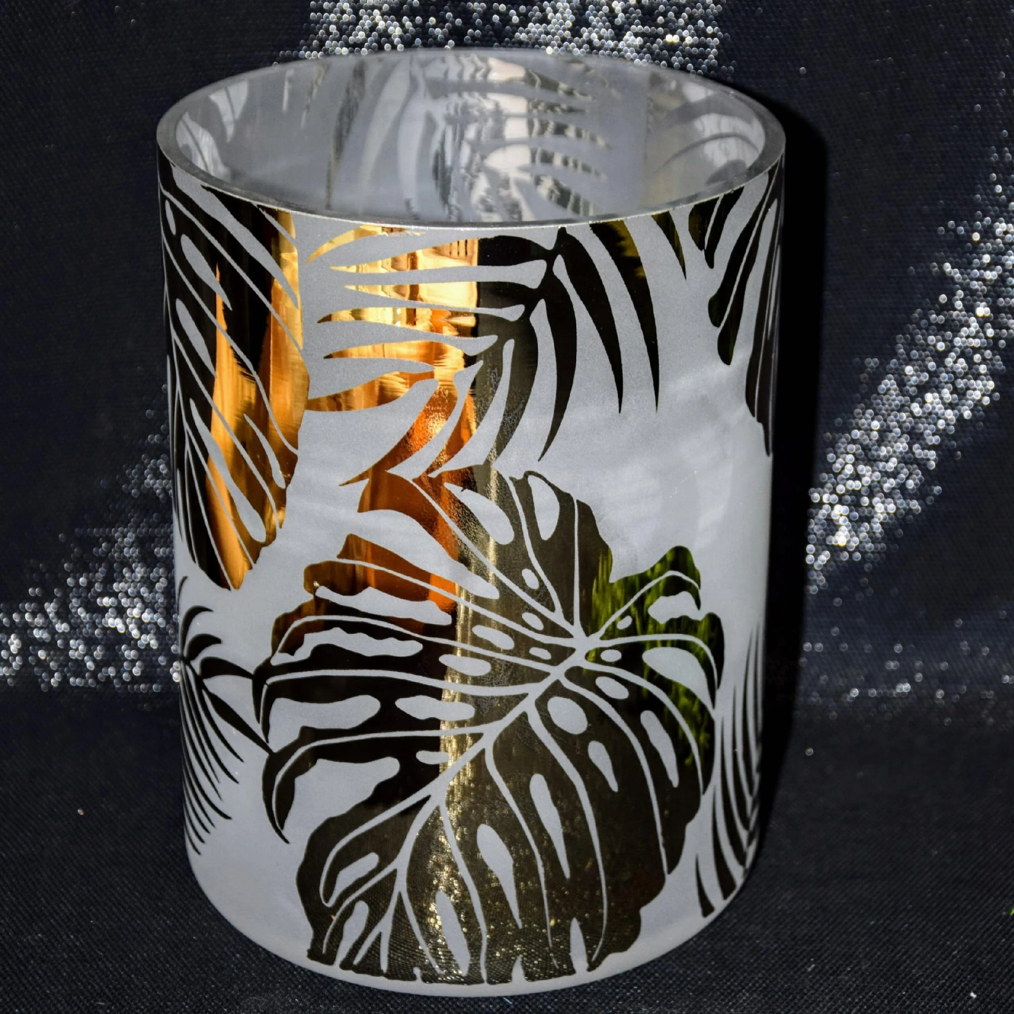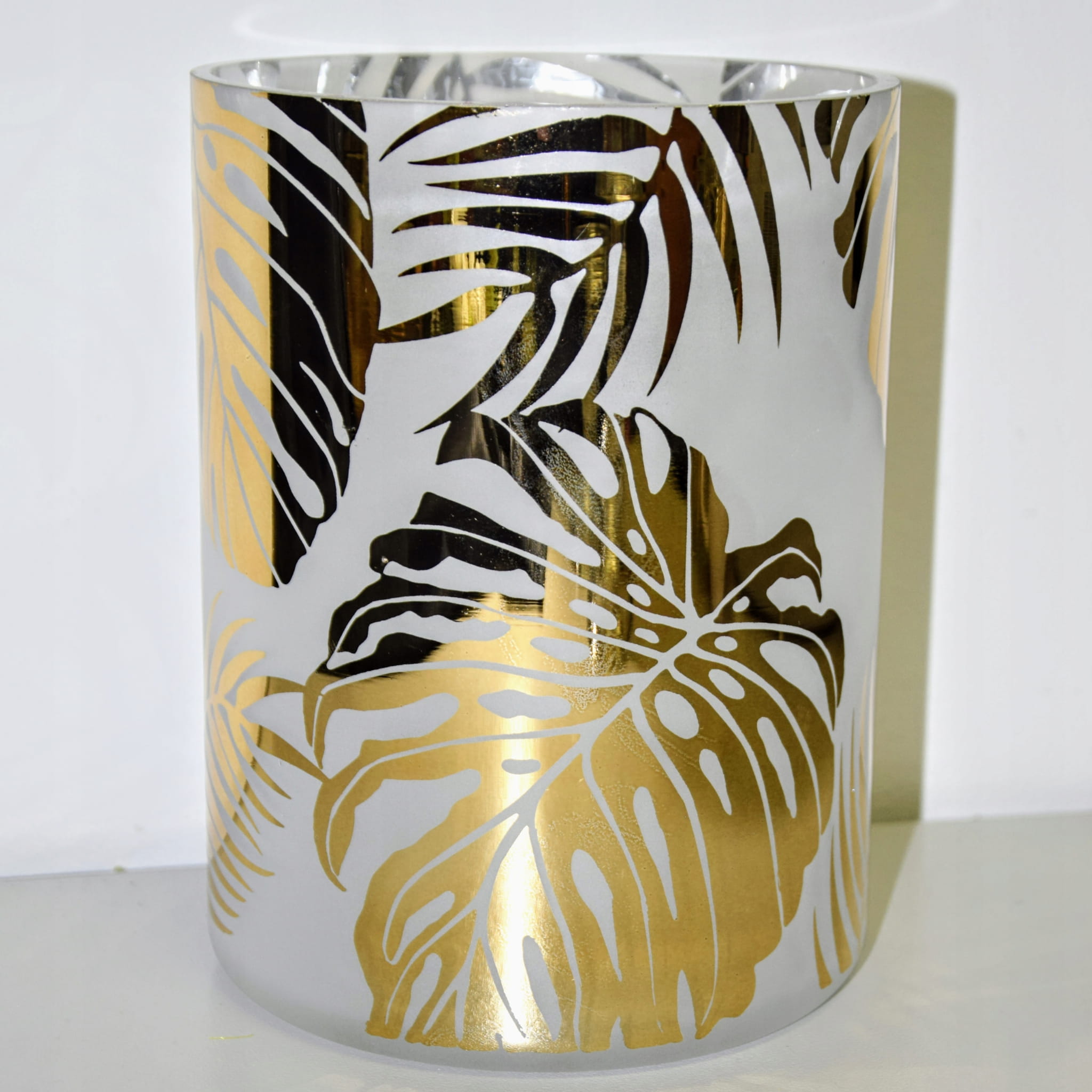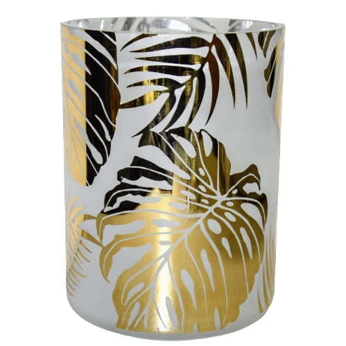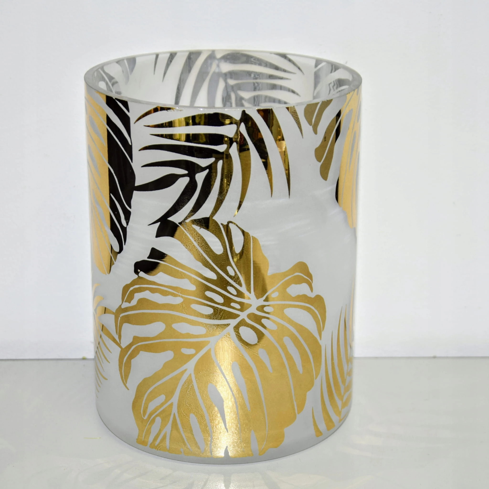 ŚWIECZNIK SZKLANY W LIŚCIE ZŁOTY ŚREDNI 15X15X20