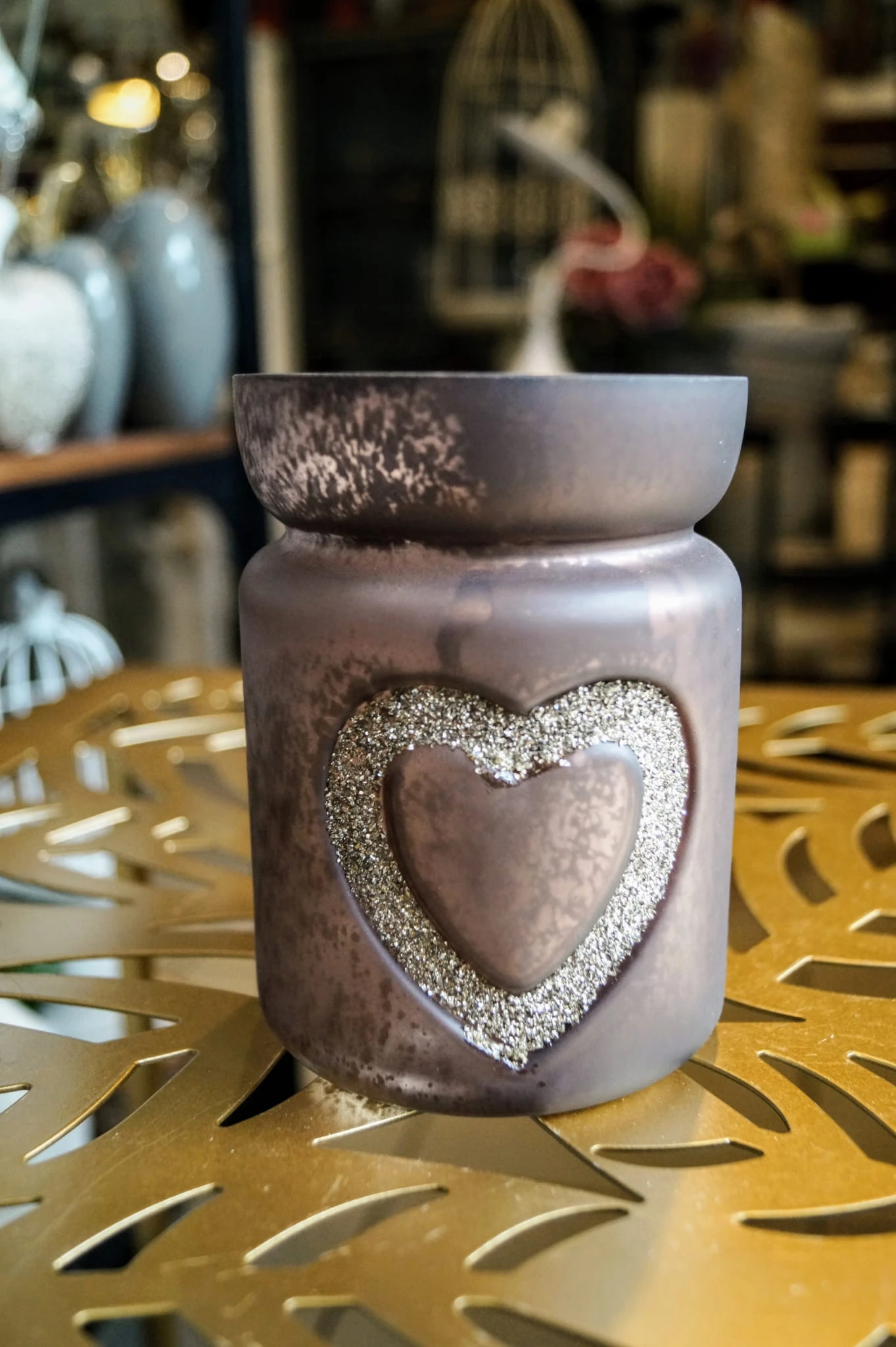 Szklany świecznik ozdobiony brokatowym sercem, przeznaczony na jeden podgrzewacz typu tealight.