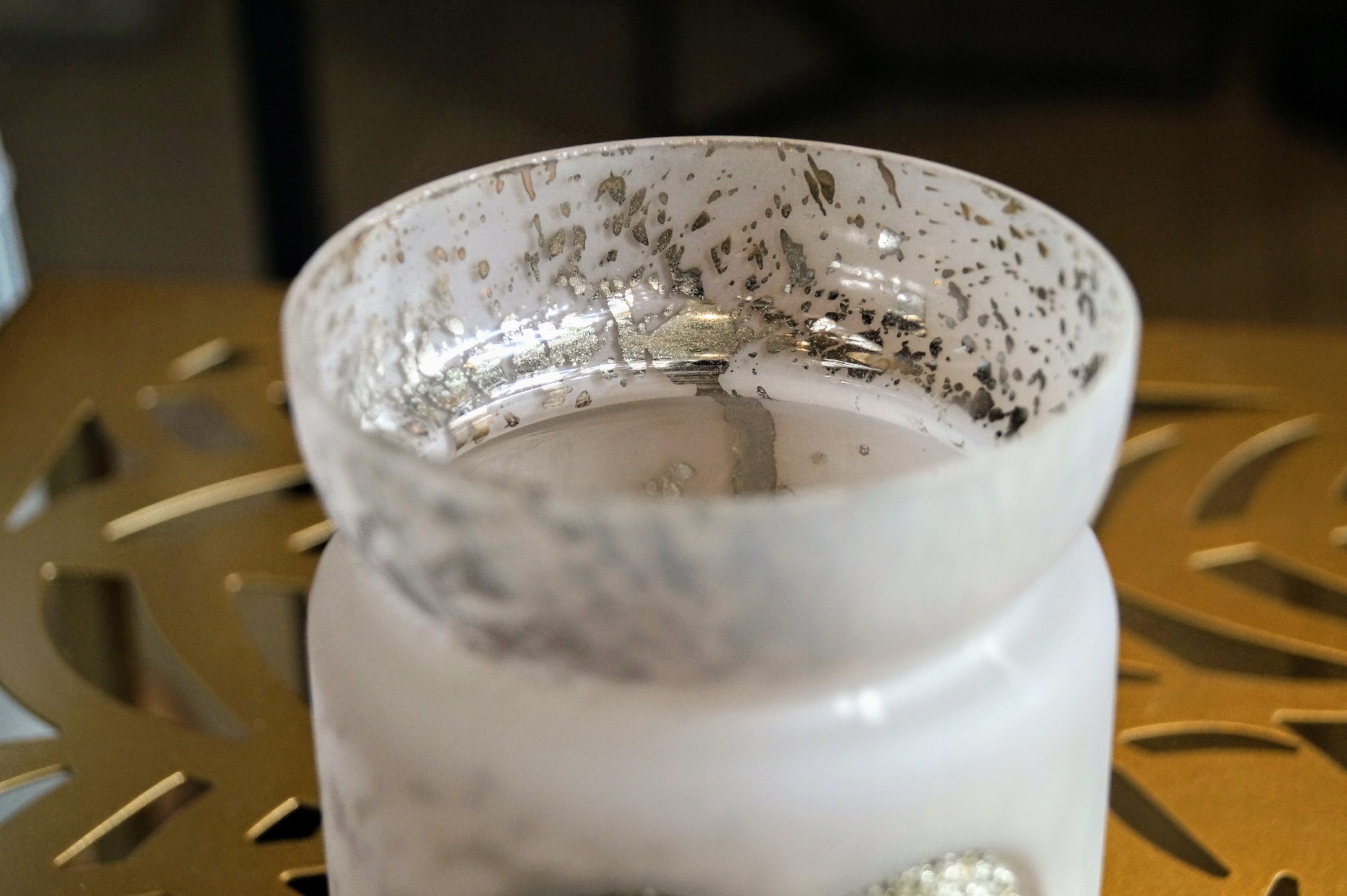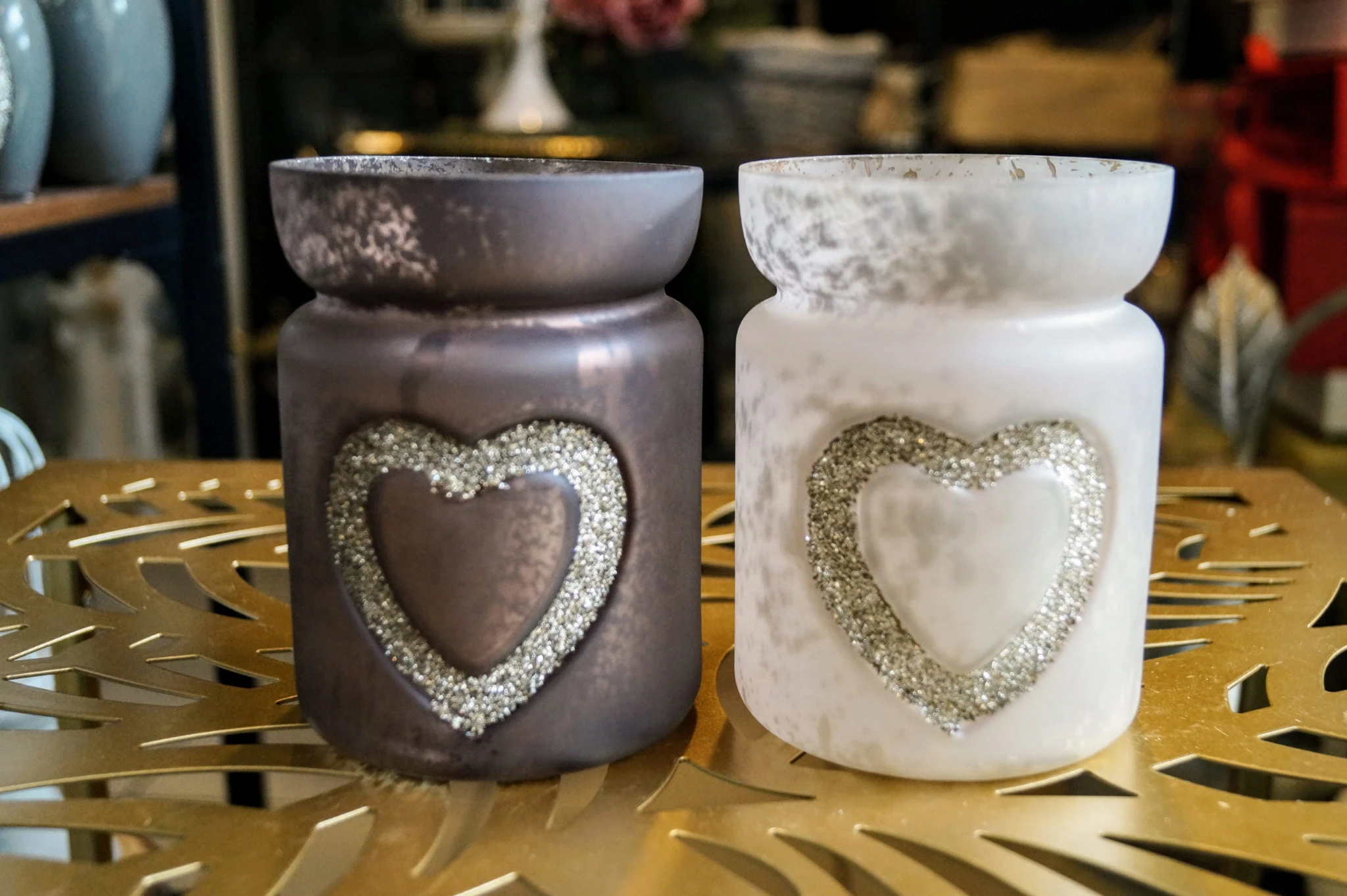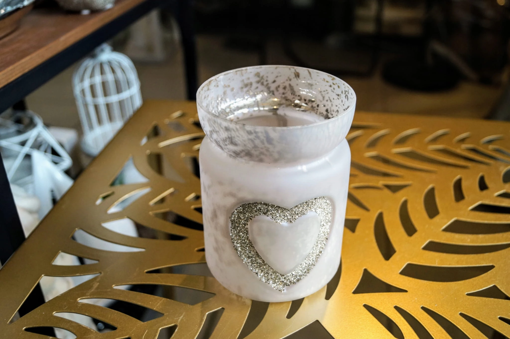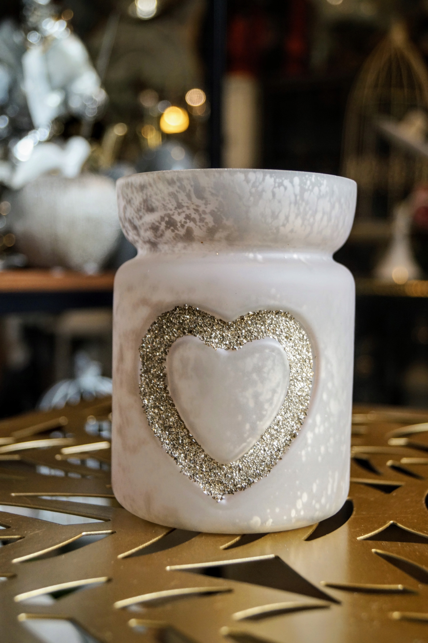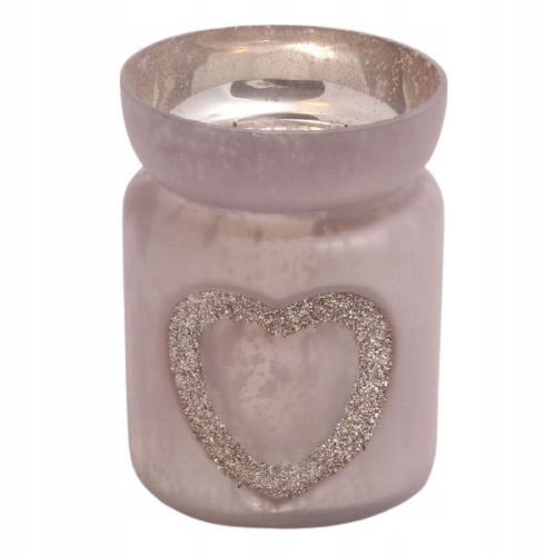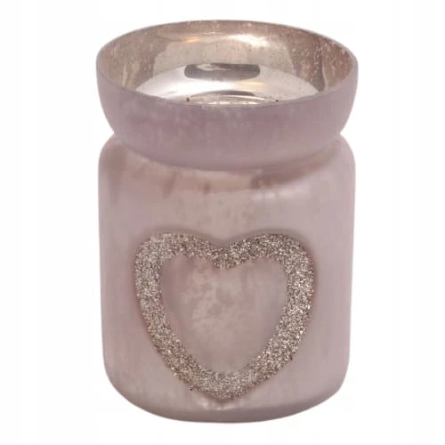 Szklany świecznik ozdobiony brokatowym sercem, przeznaczony na jeden podgrzewacz typu tealight.