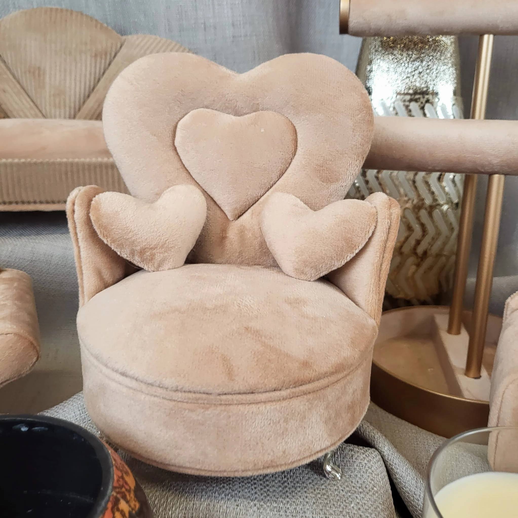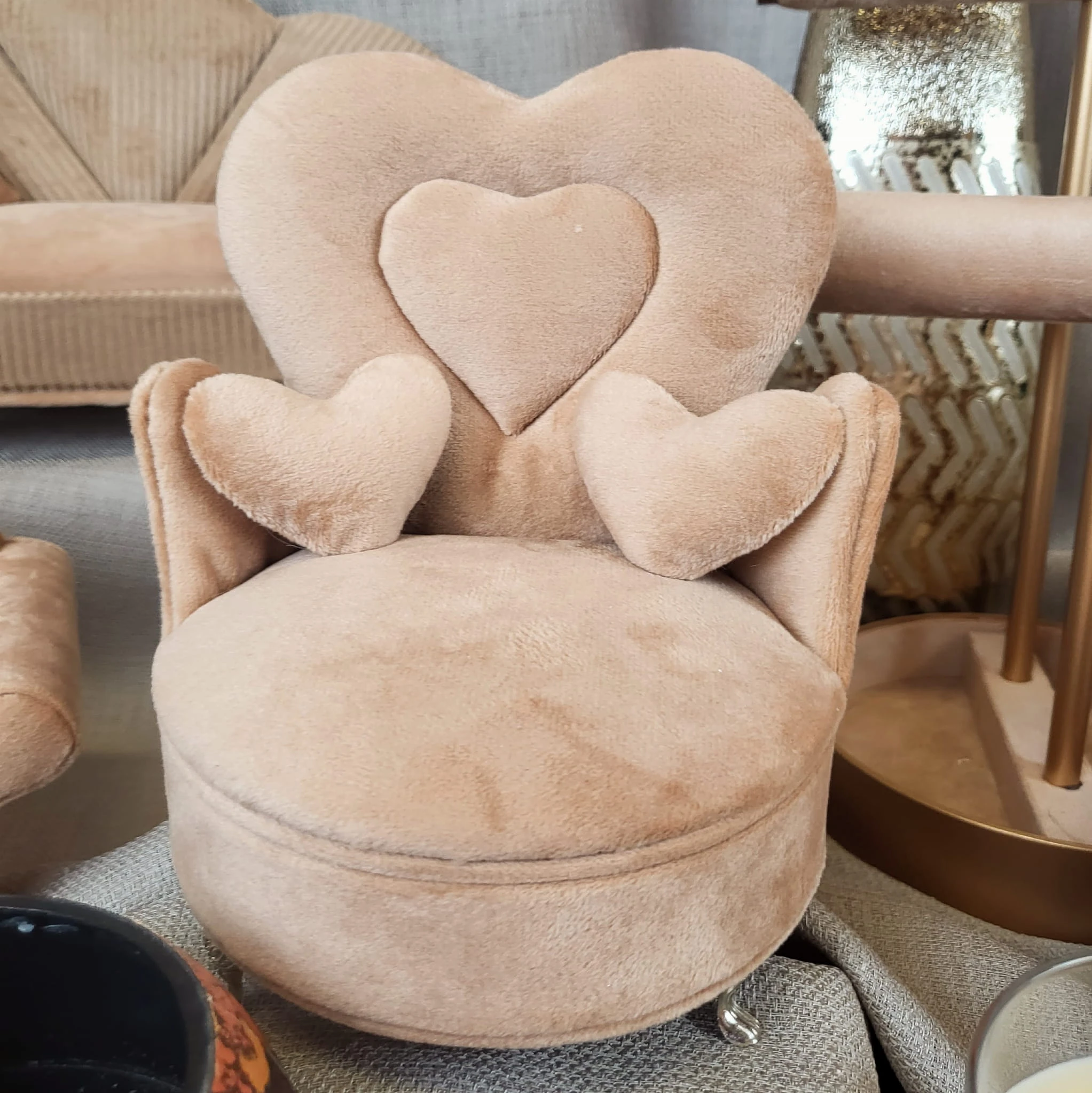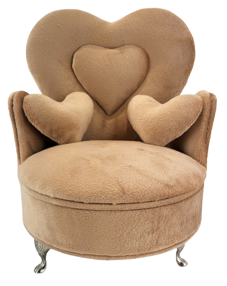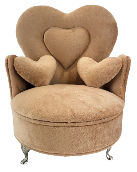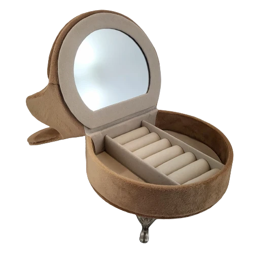 Welurowa szkatułka w kształcie fotela, wyściełana jasnym materiałem, wyposażona w lusterko.