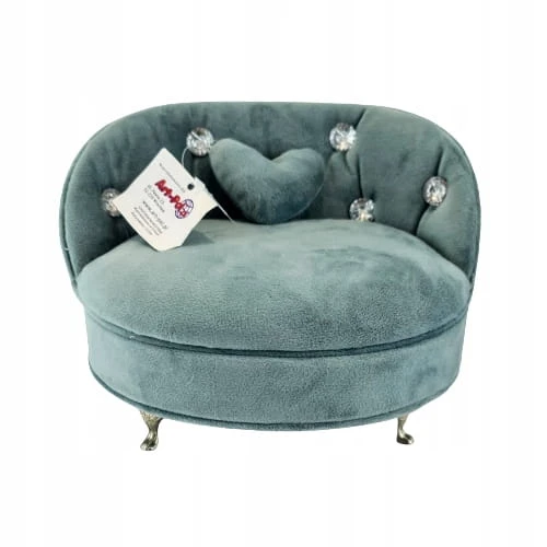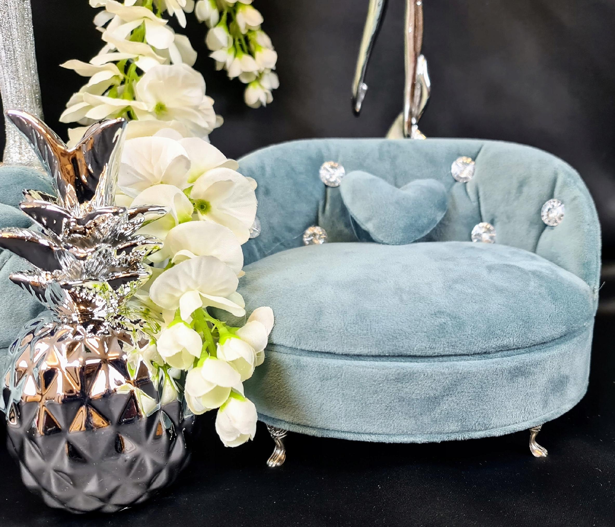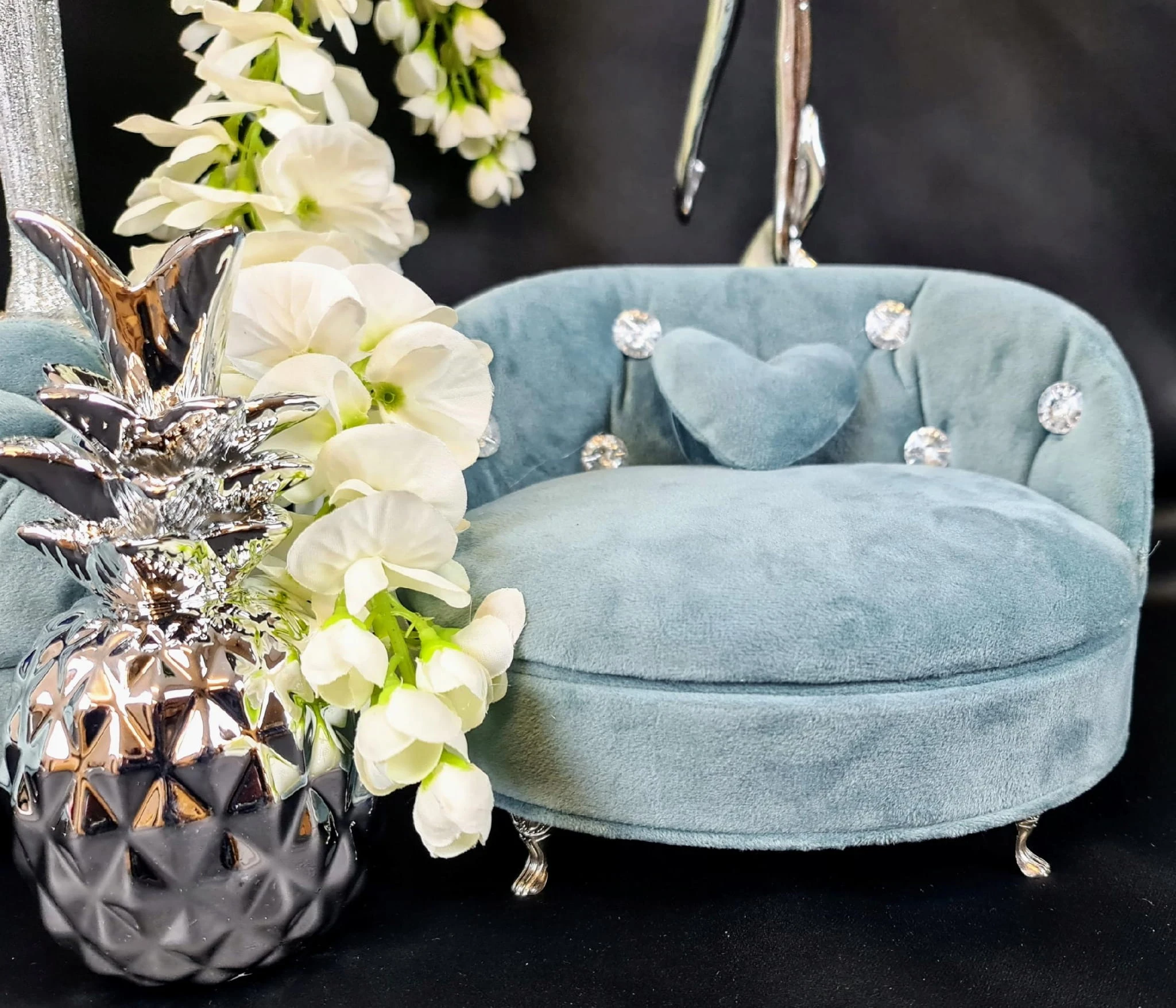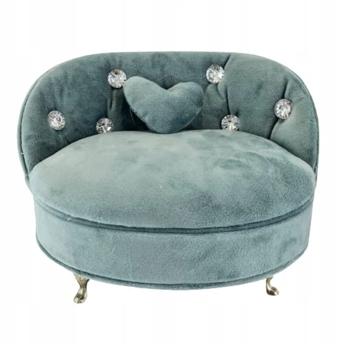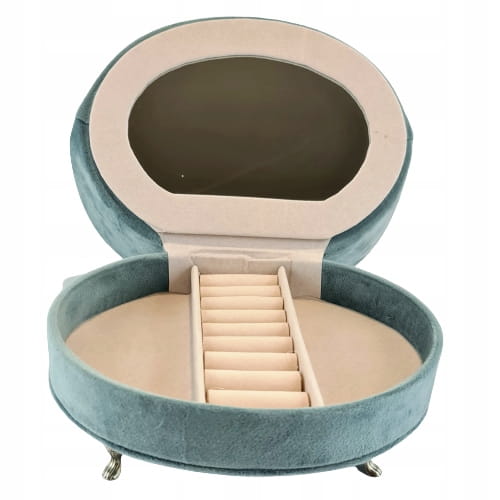 Welurowa szkatułka w kolorze jasno niebieskim, ozdobiona kryształkami, wyściełana jasnym materiałem, wyposażona w lusterko.