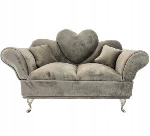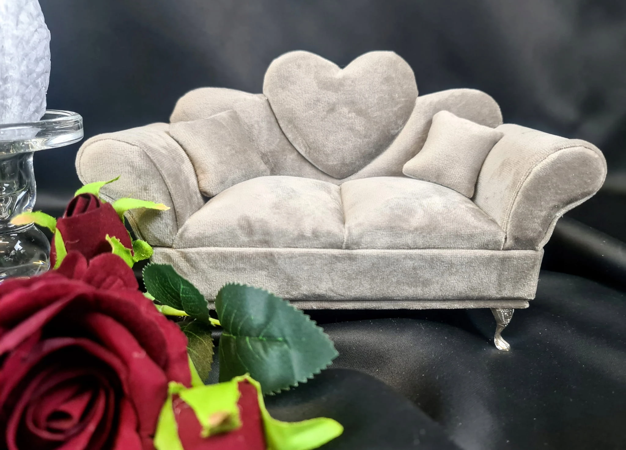 Beżowa, welurowa szkatułka w kształcie sofy, wyściełana jasnym materiałem, wyposażona w lusterko.