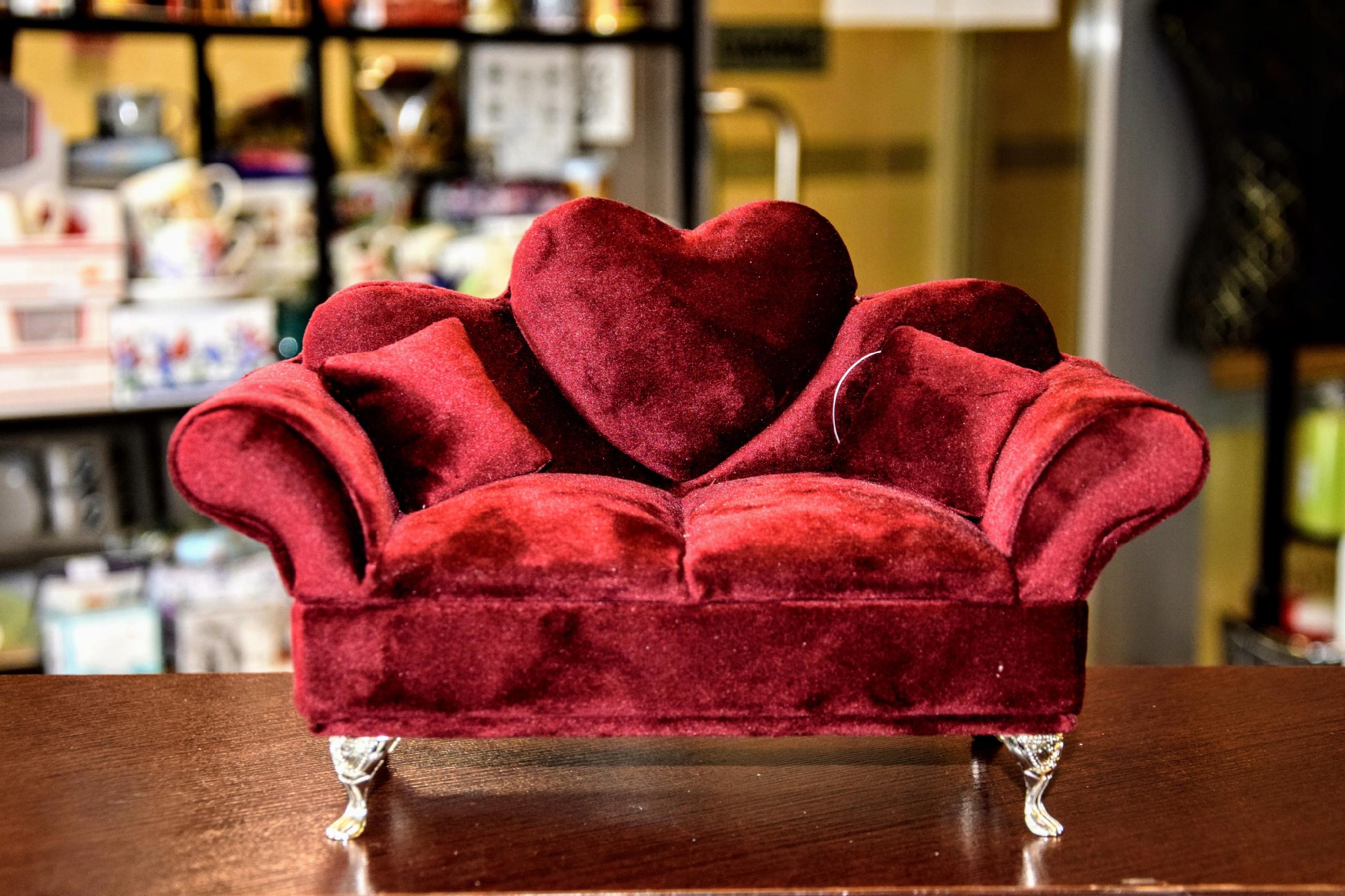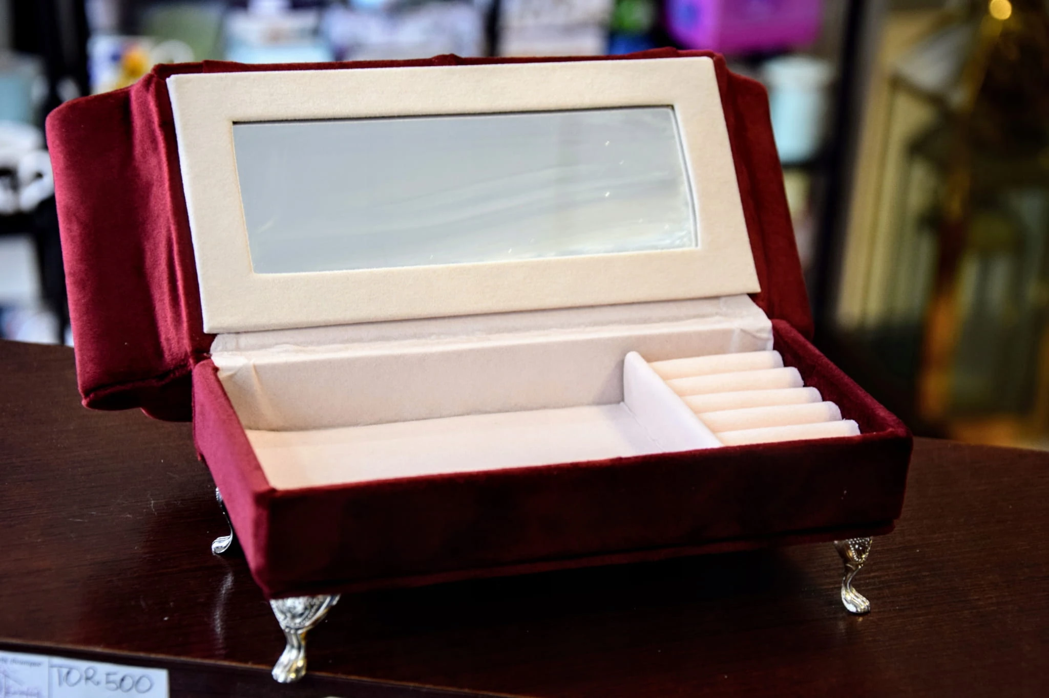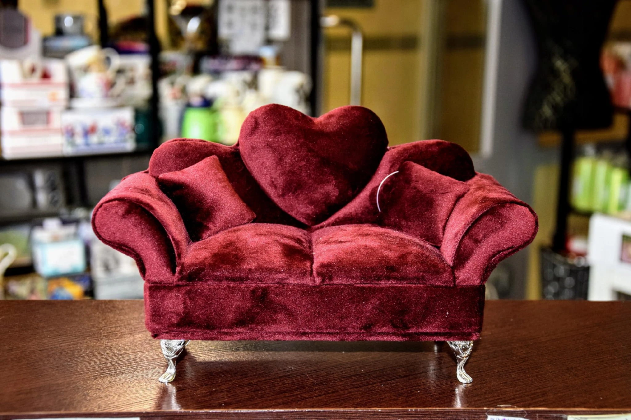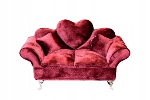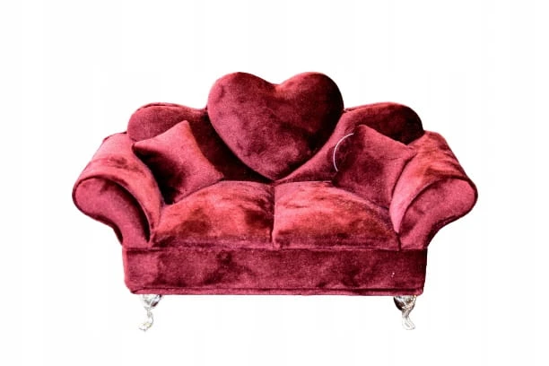 Bordowa, welurowa szkatułka w kształcie sofy, wyściełana jasnym materiałem, wyposażona w lusterko.