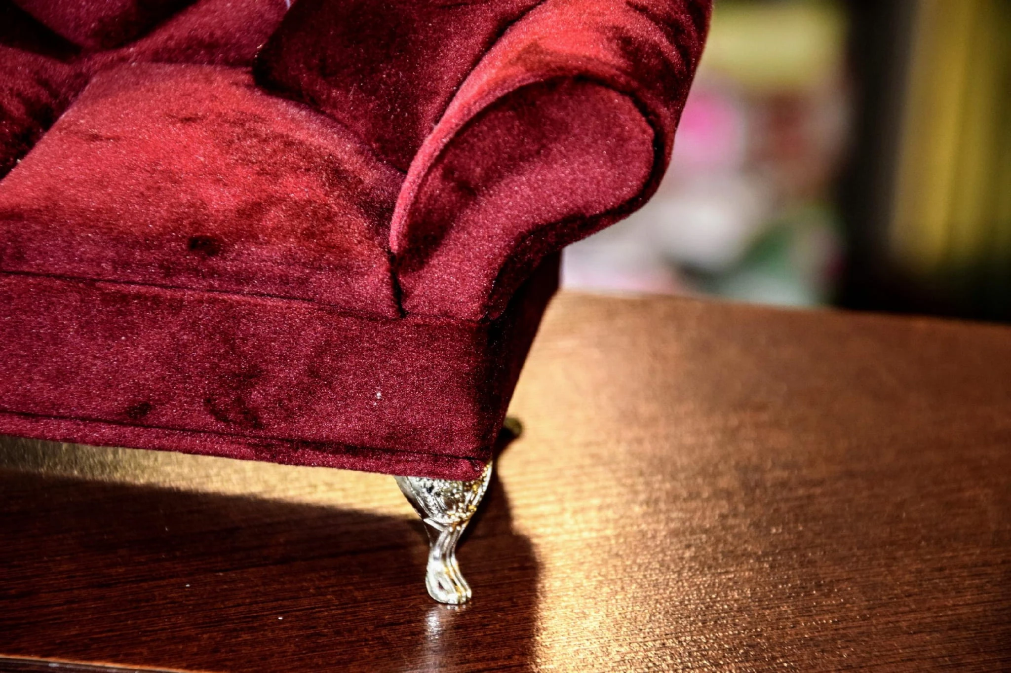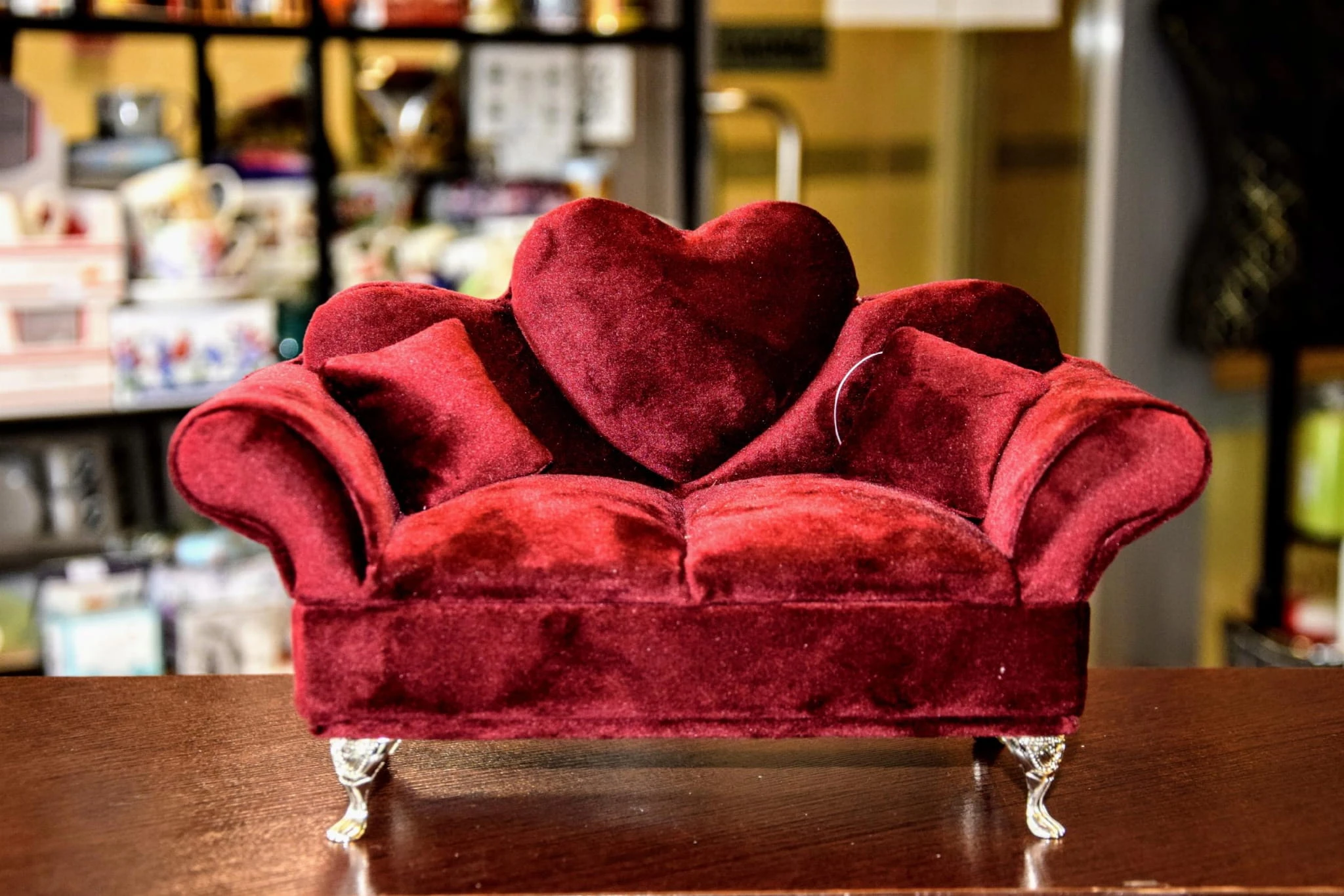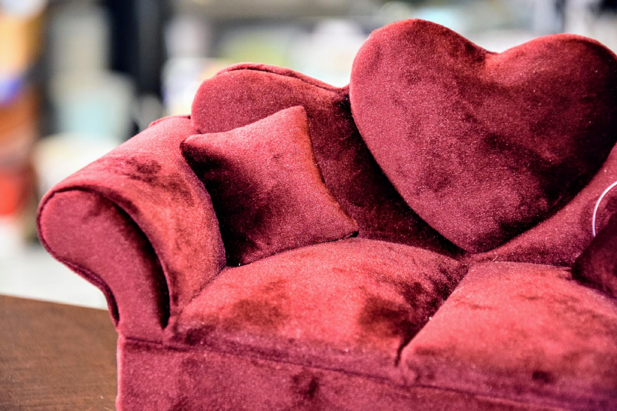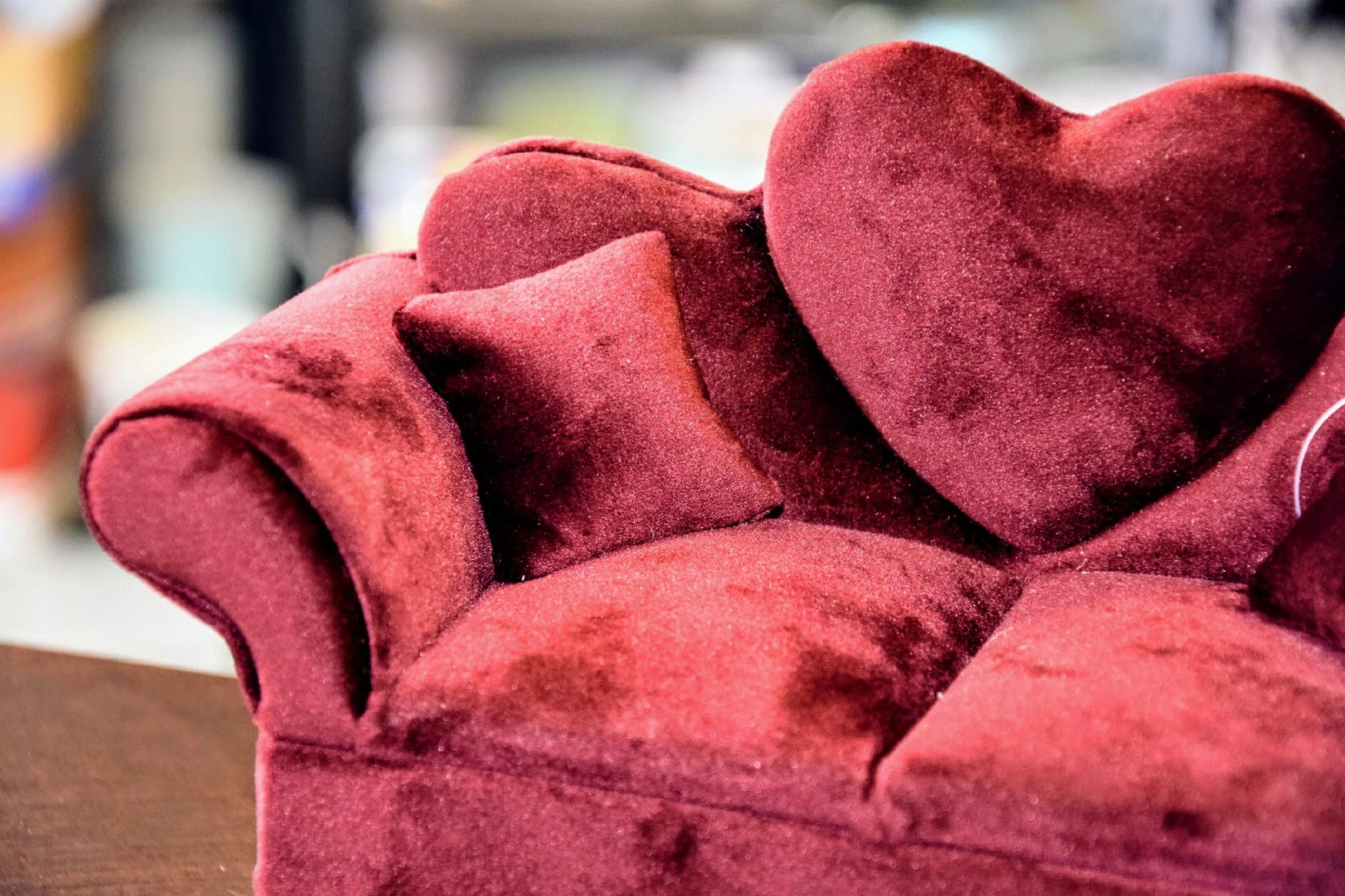 Bordowa, welurowa szkatułka w kształcie sofy, wyściełana jasnym materiałem, wyposażona w lusterko.