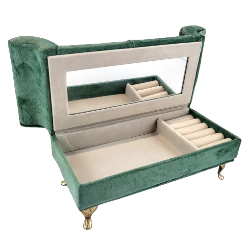 Welurowa szkatułka w kształcie sofy, wyściełana jasnym materiałem, wyposażona w lusterko.
