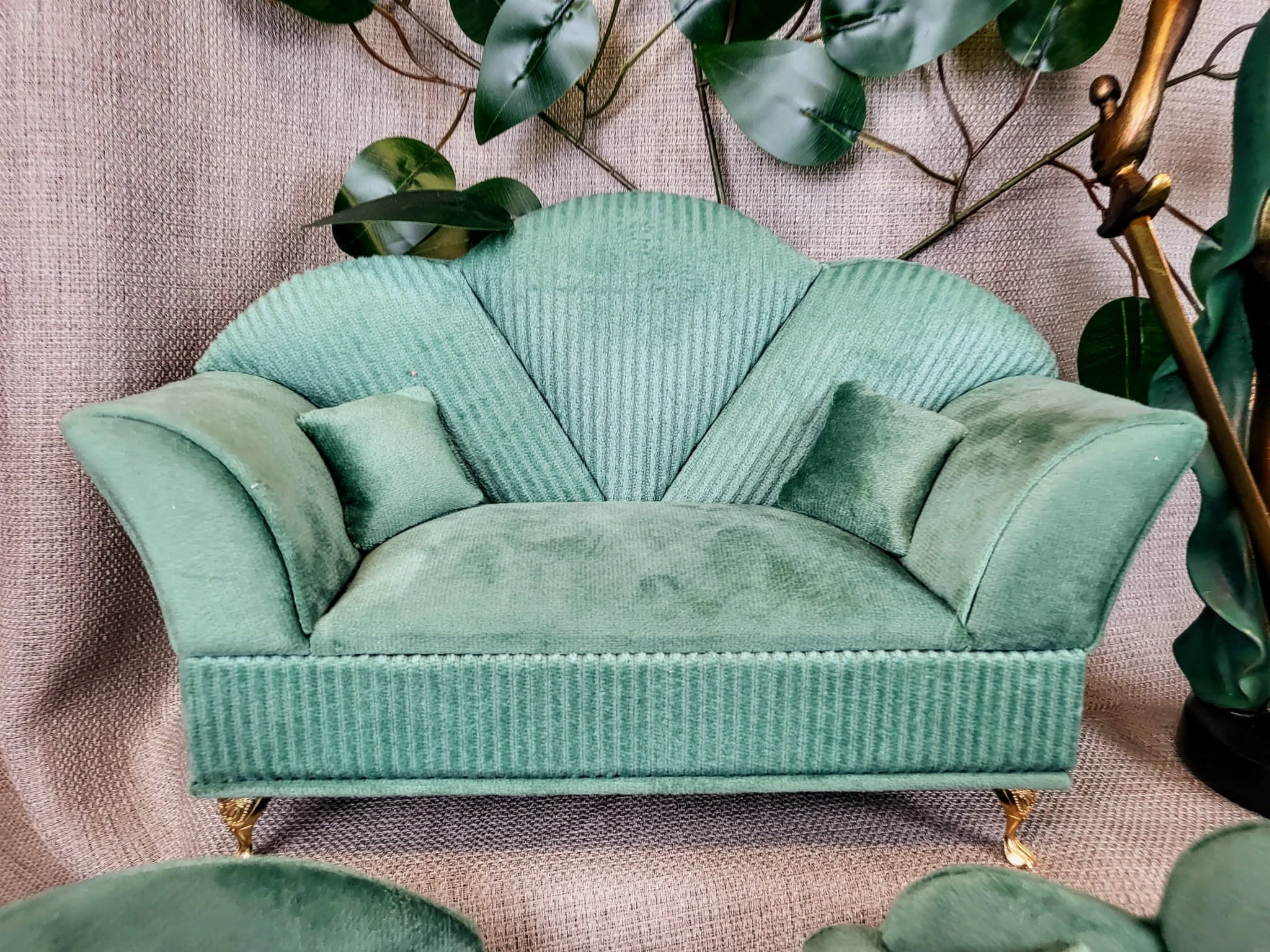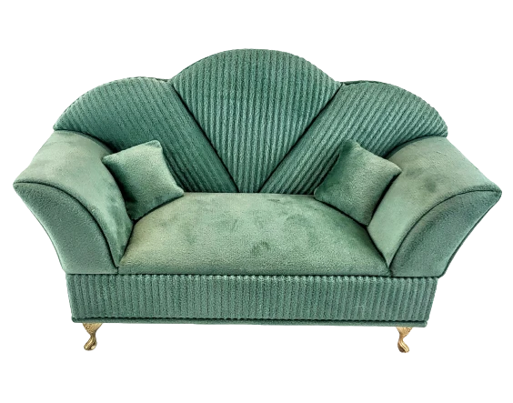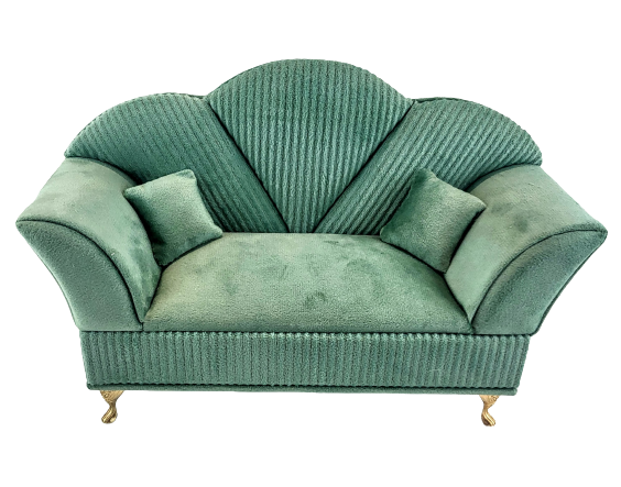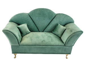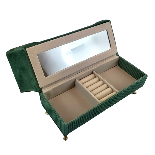 Welurowa szkatułka w kształcie sofy, wyściełana jasnym materiałem, wyposażona w lusterko.
