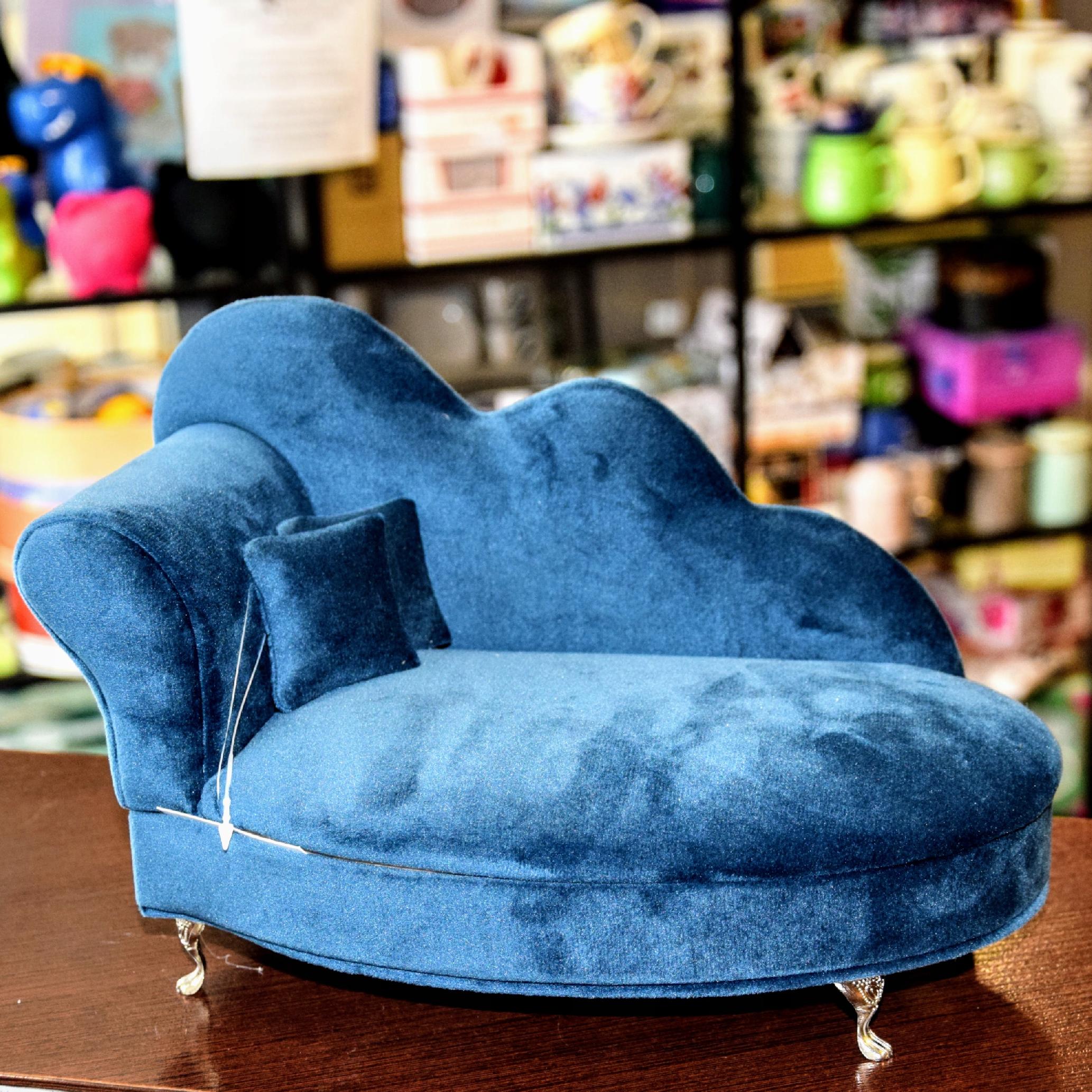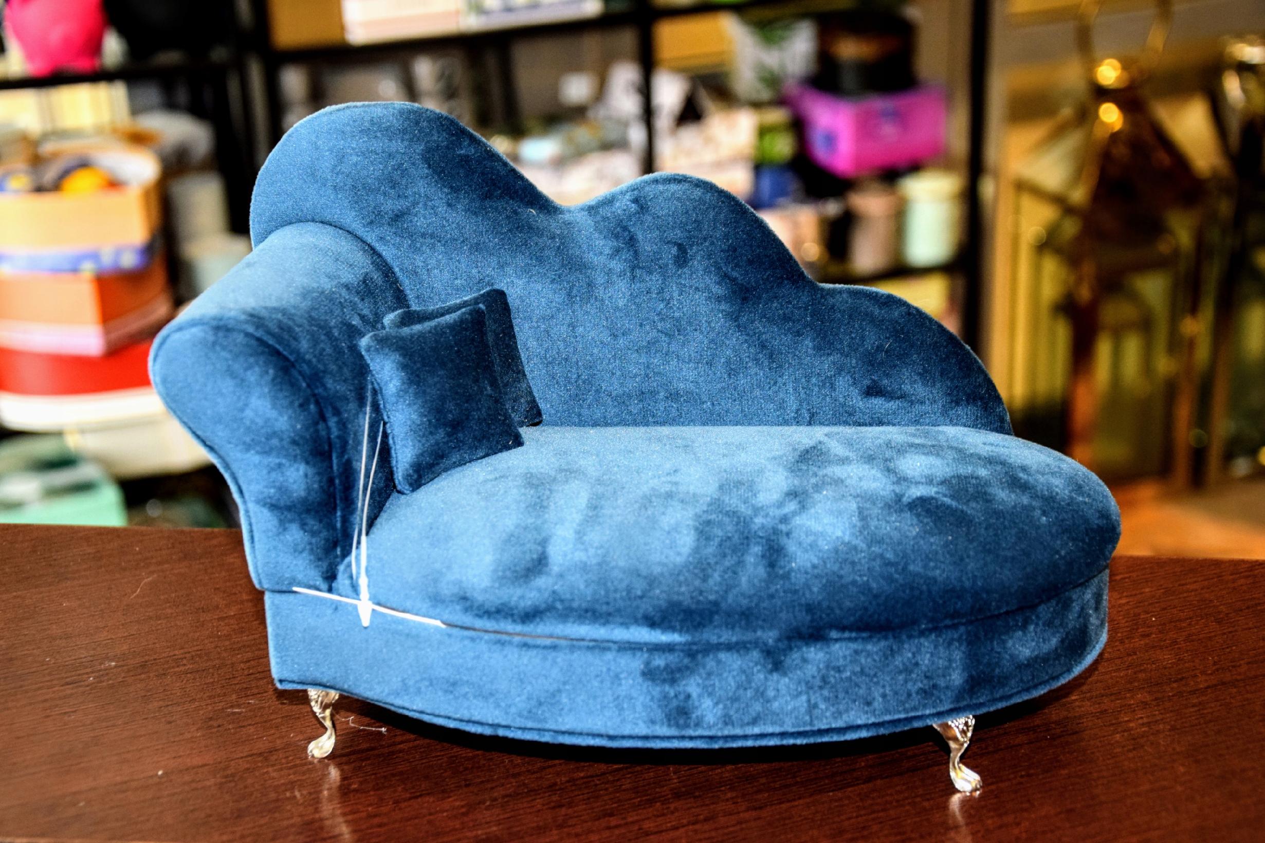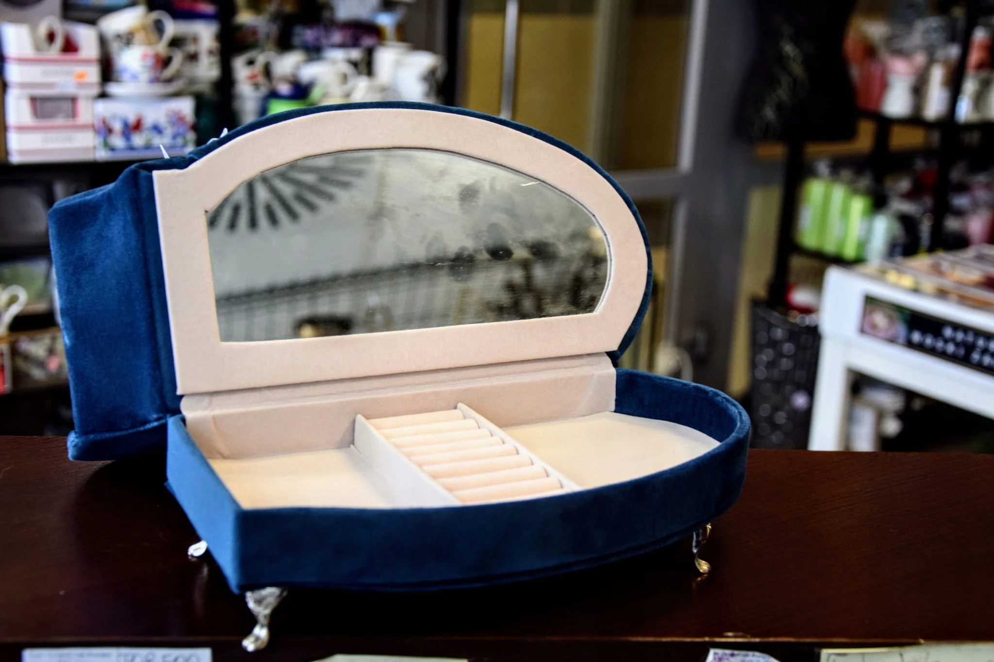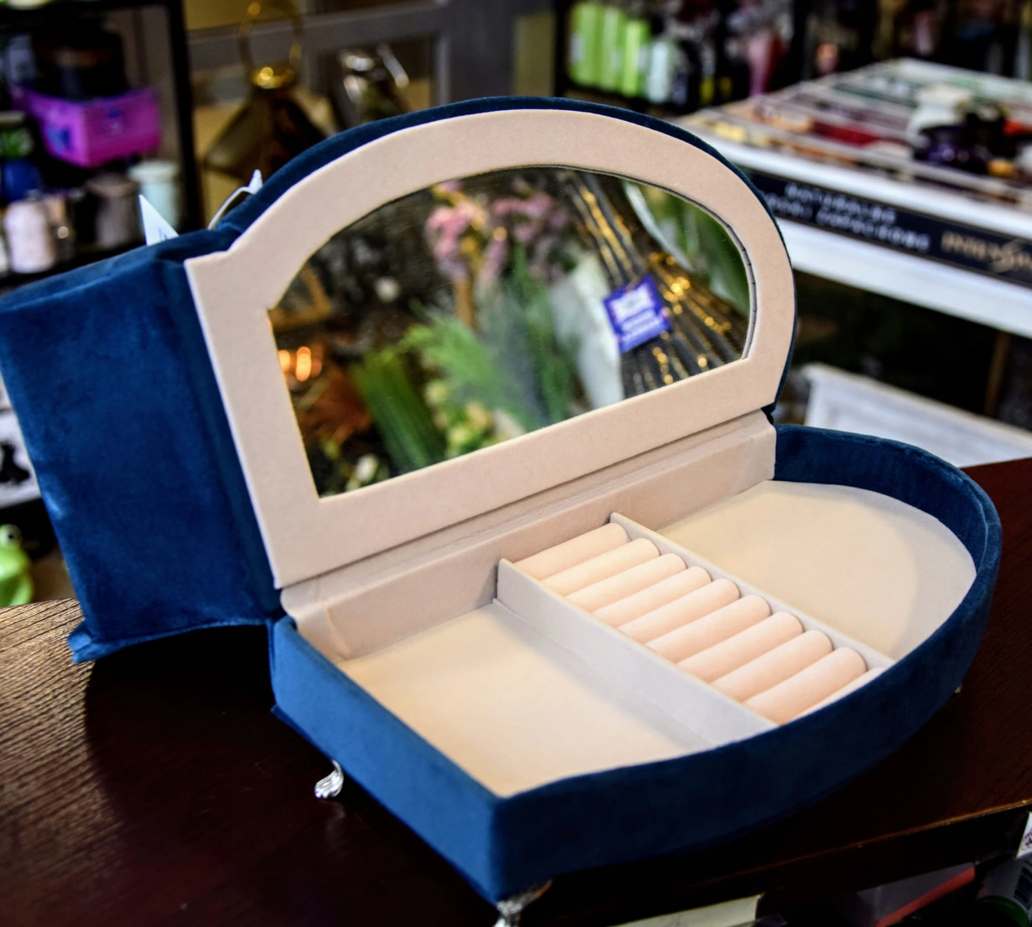 Granatowa, welurowa szkatułka w kształcie szezlonga, wyściełana jasnym materiałem, wyposażona w lusterko.