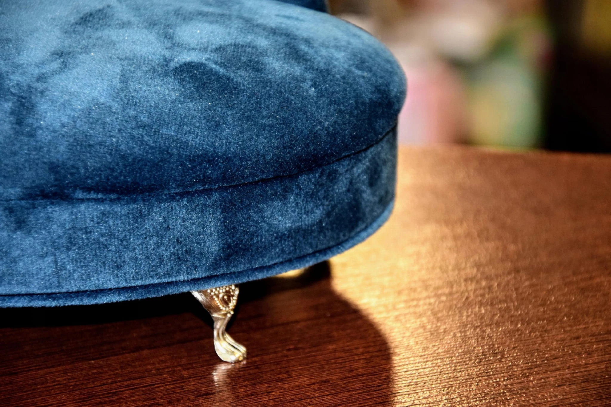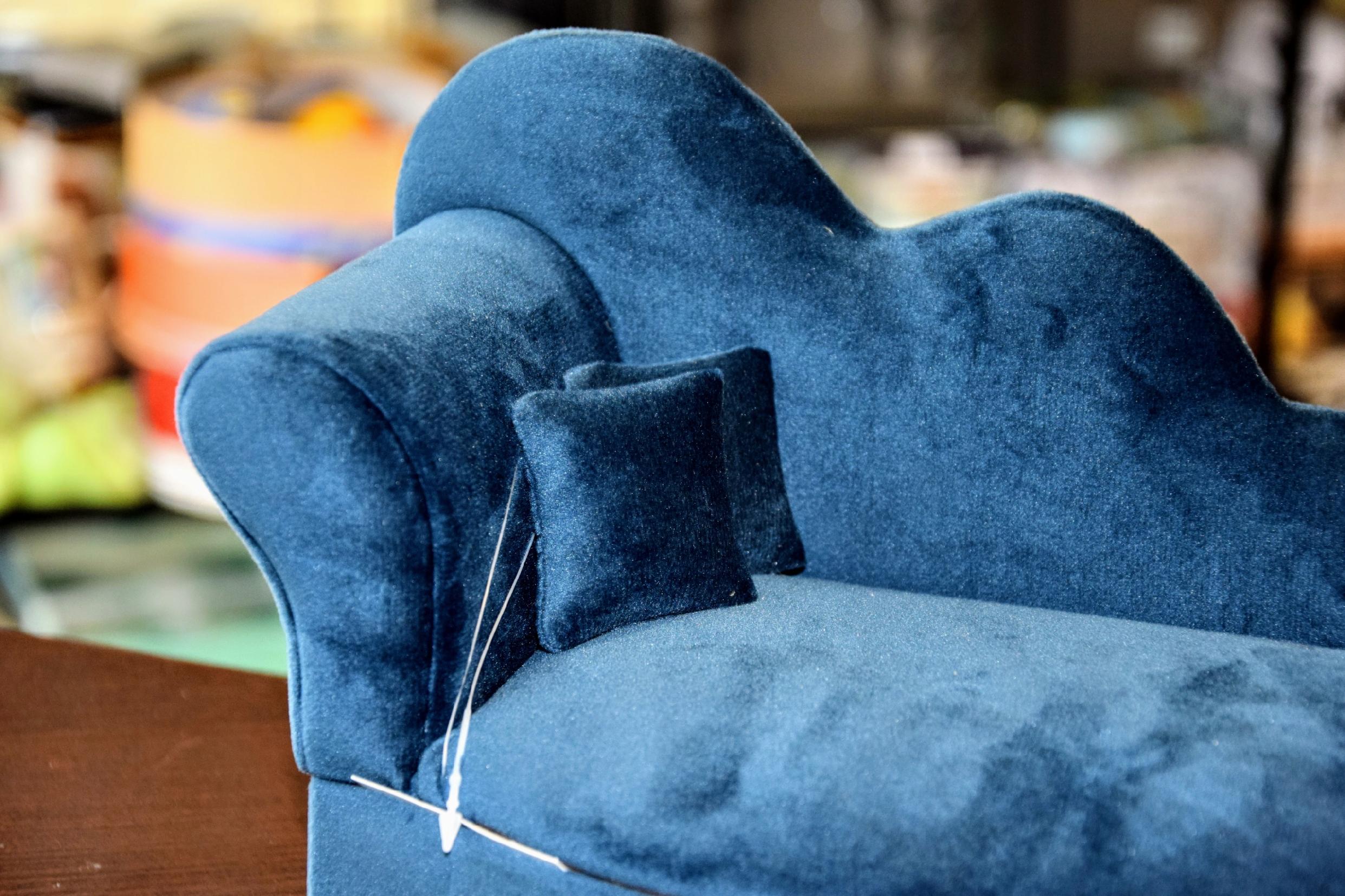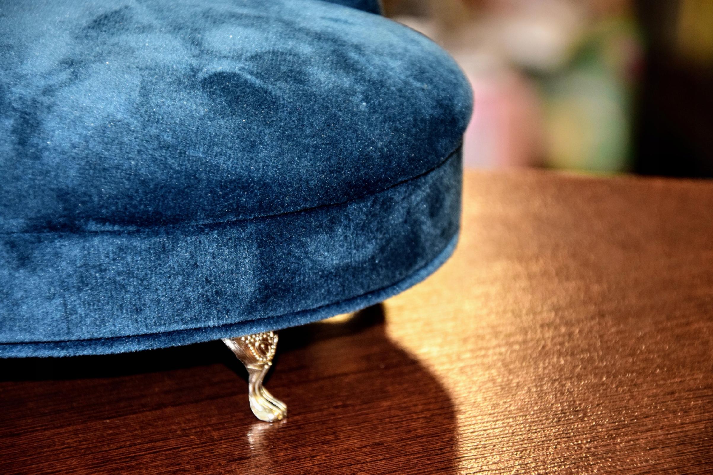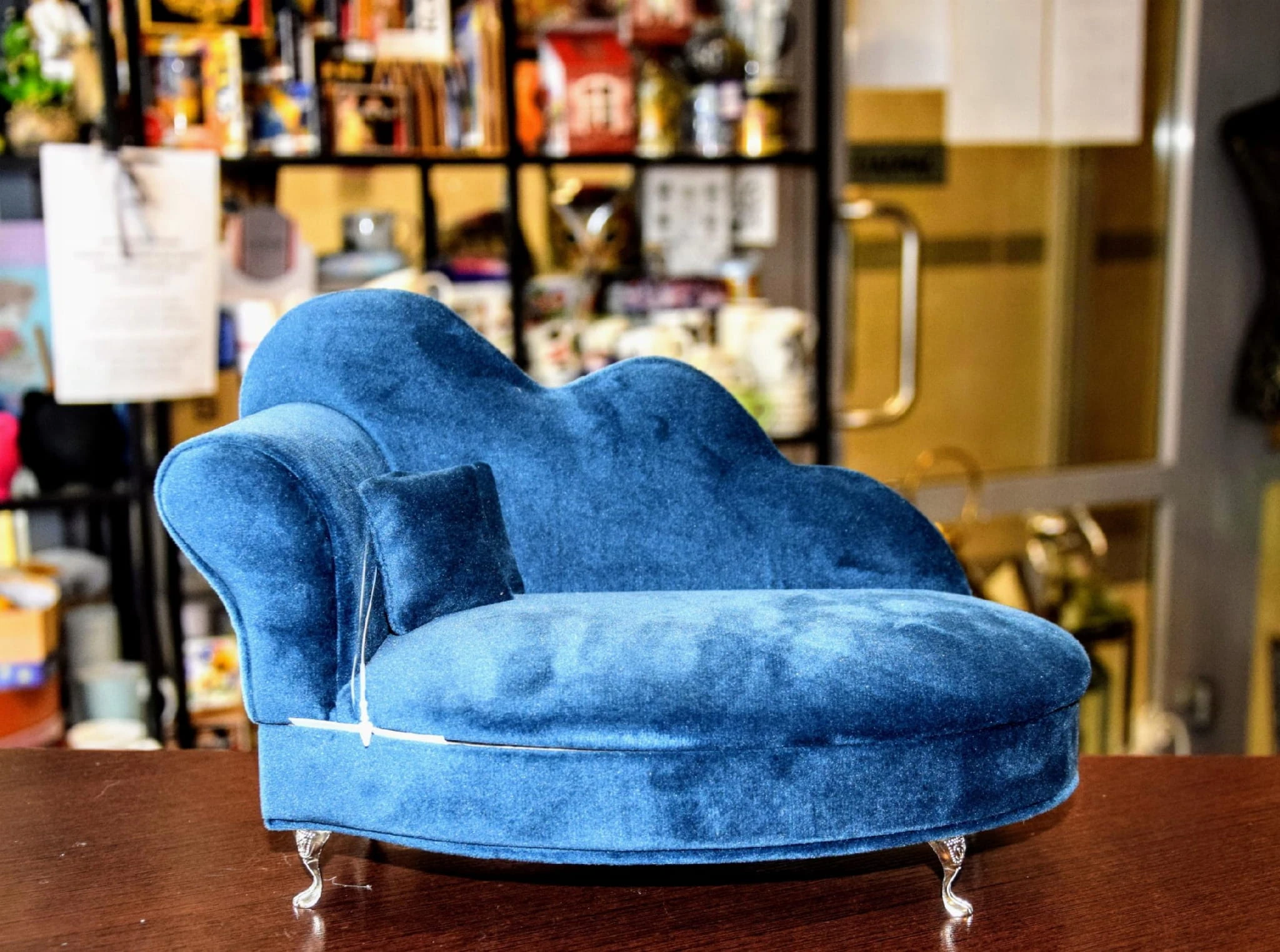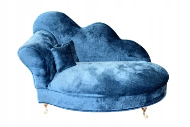 Granatowa, welurowa szkatułka w kształcie szezlonga, wyściełana jasnym materiałem, wyposażona w lusterko.