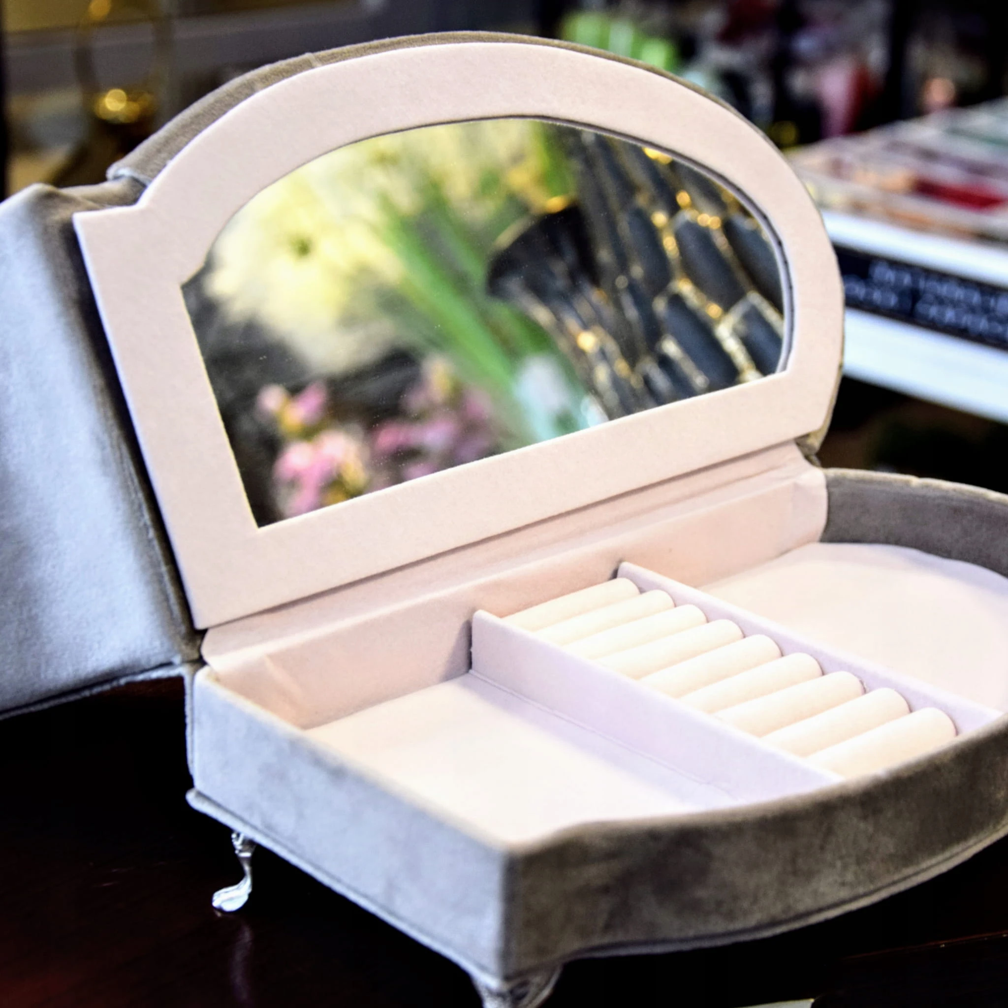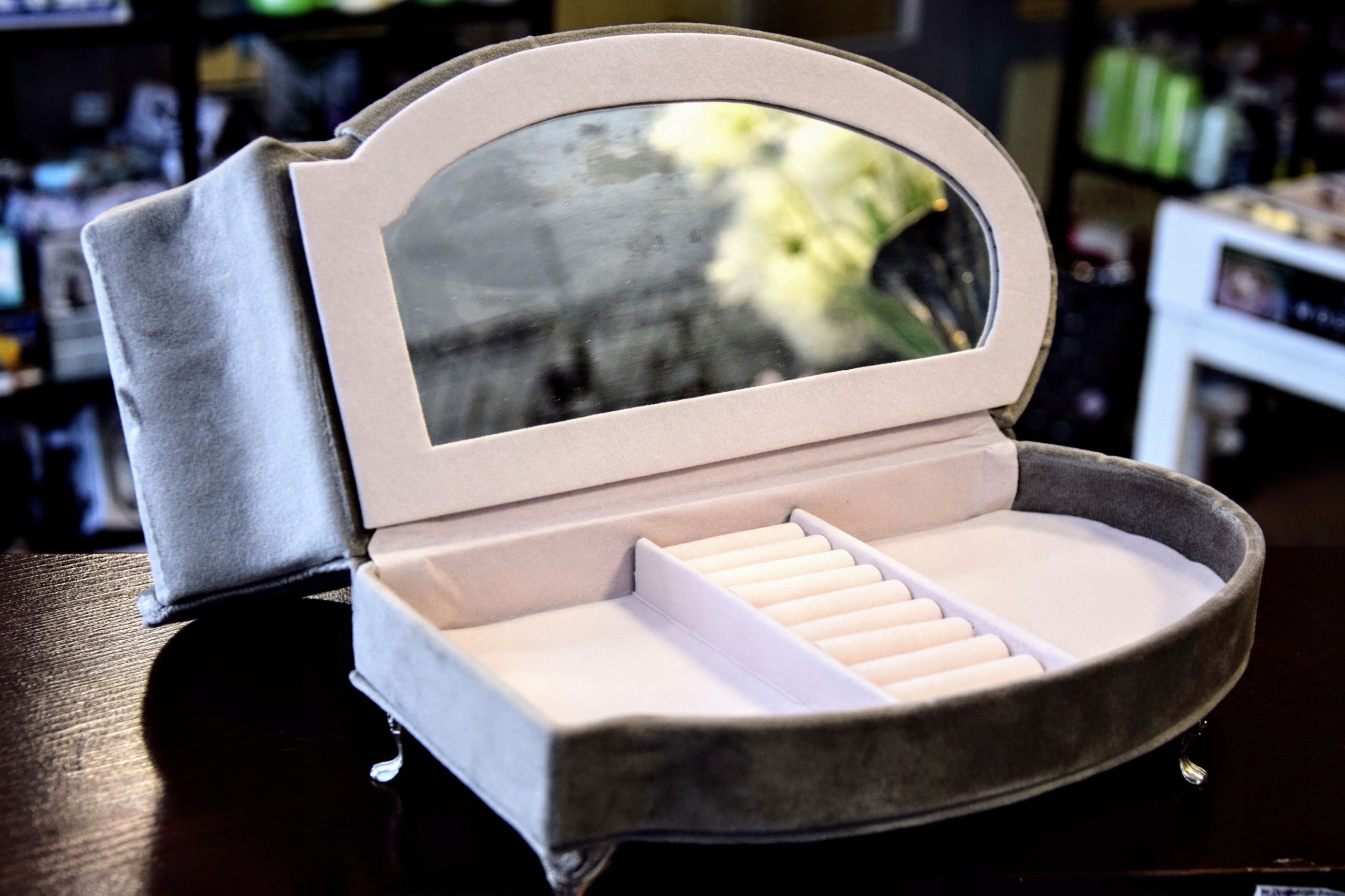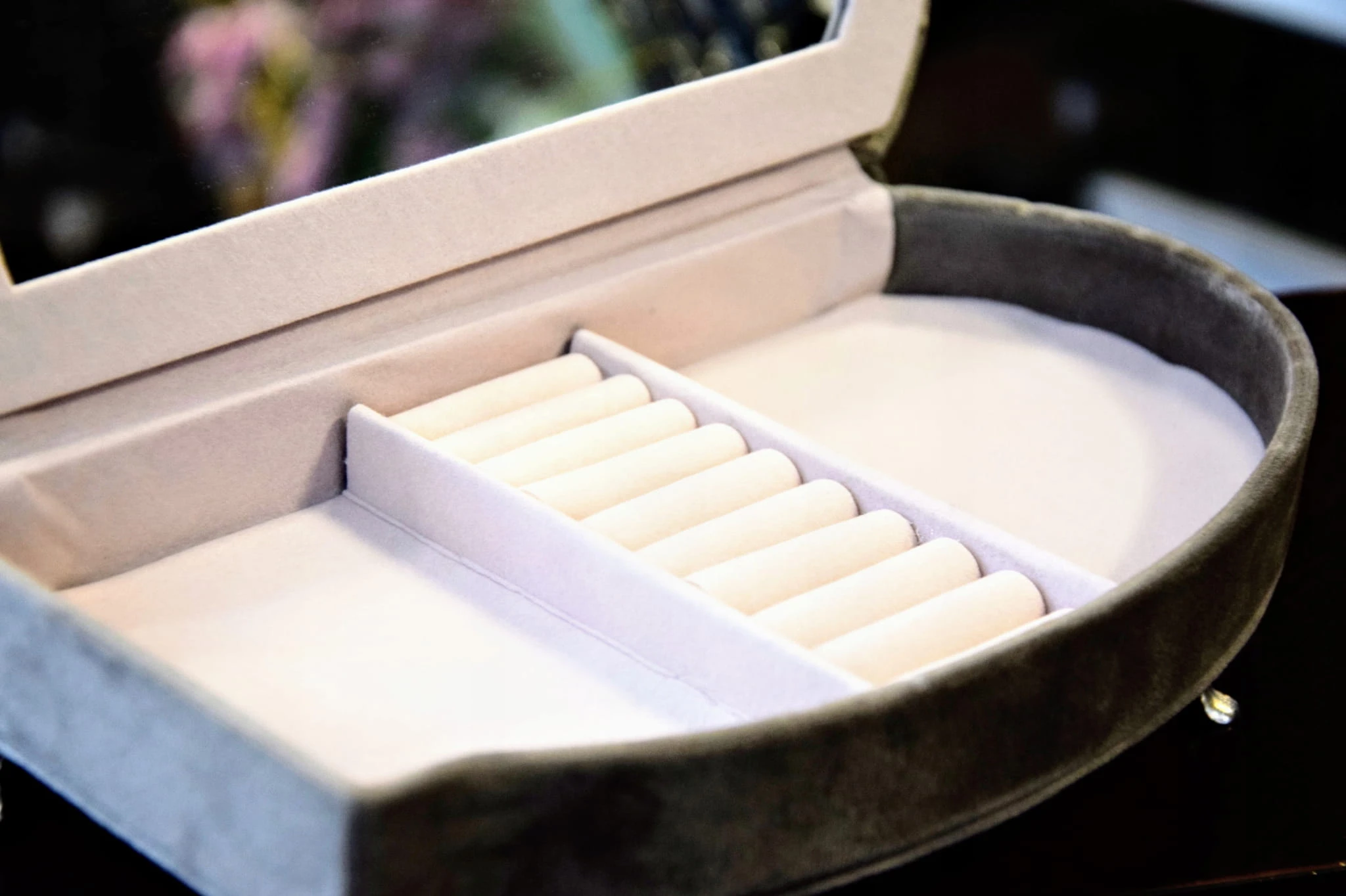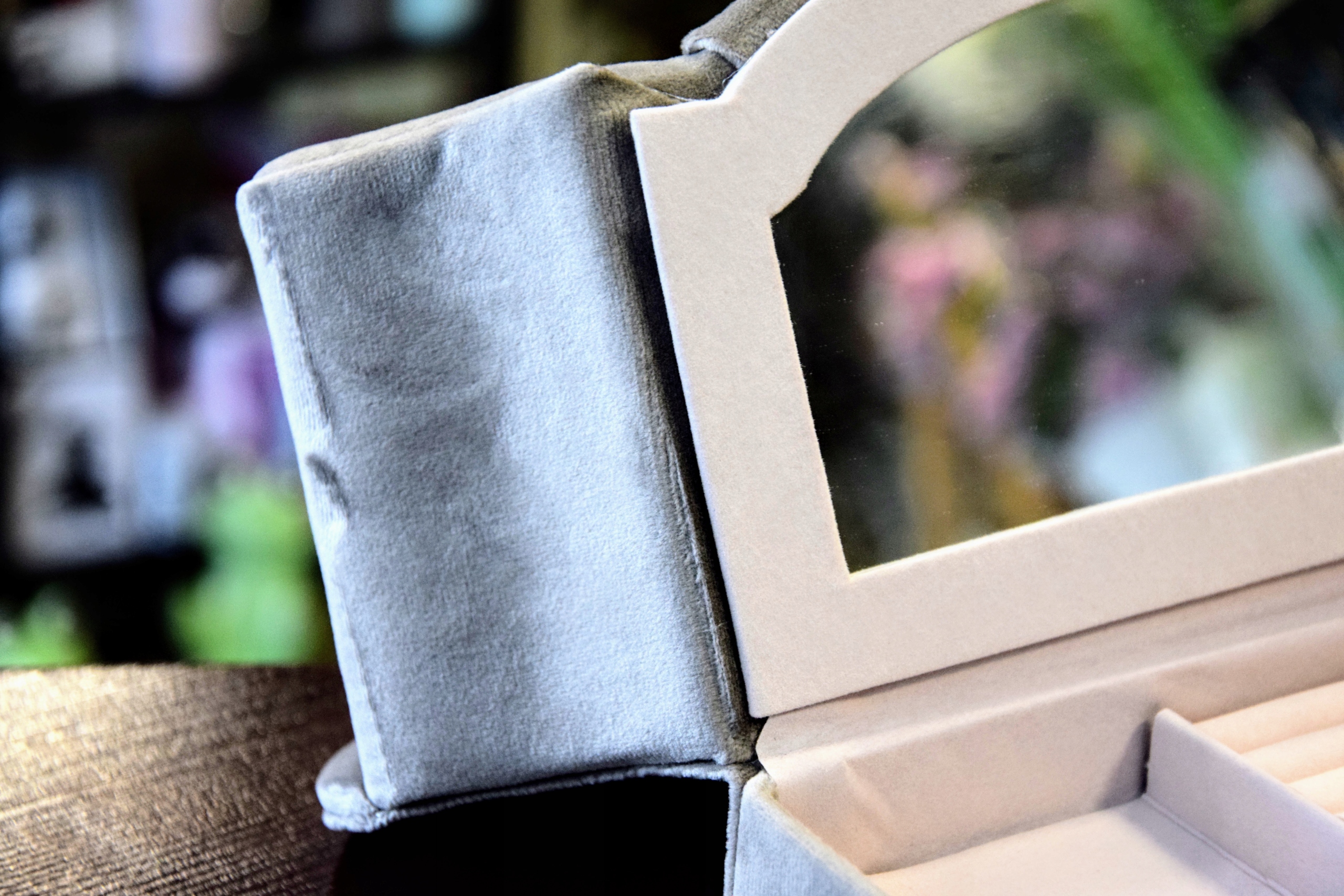 Szara, welurowa szkatułka w kształcie szezlonga, wyściełana jasnym materiałem, wyposażona w lusterko.