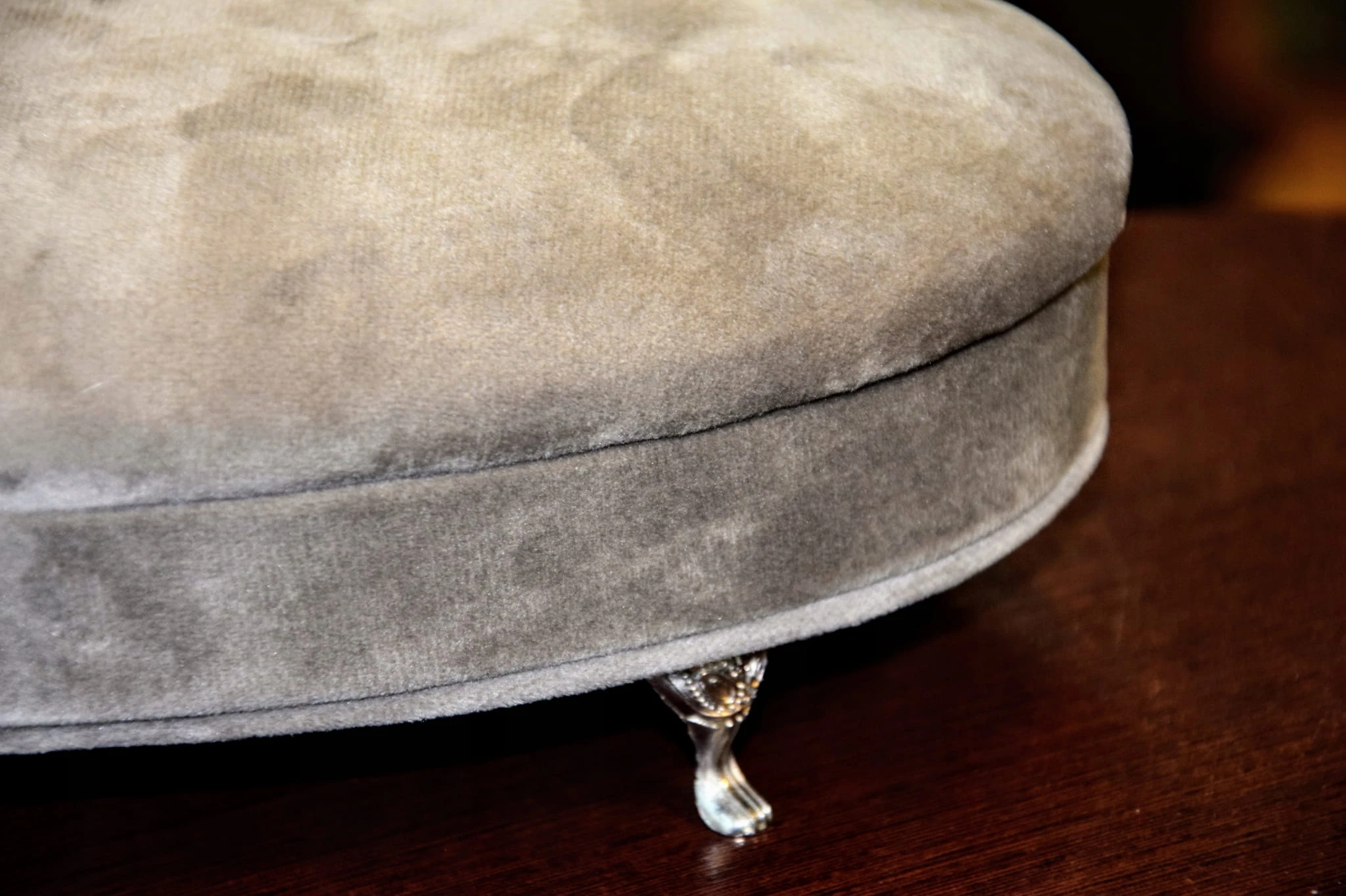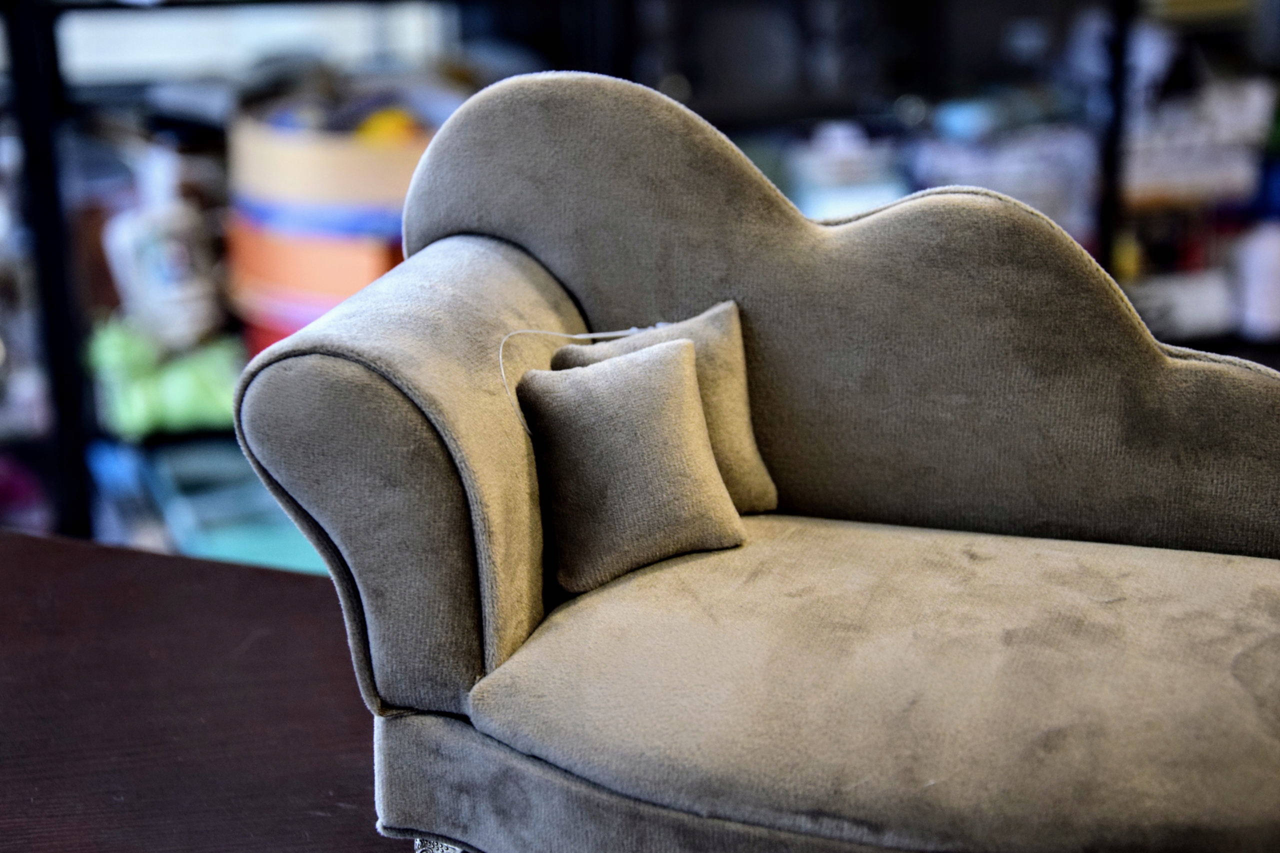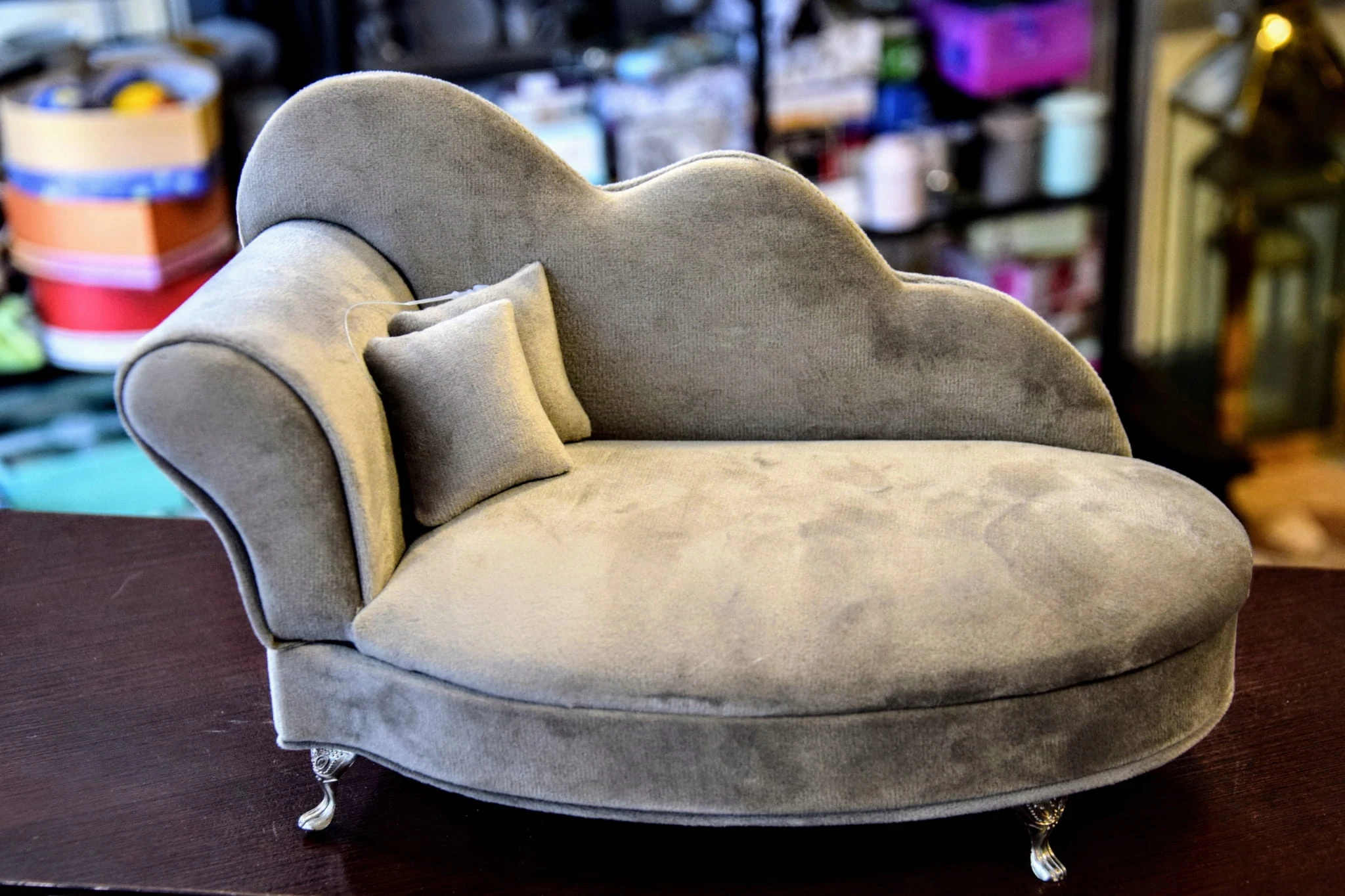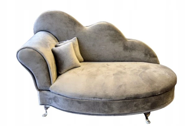 Szara, welurowa szkatułka w kształcie szezlonga, wyściełana jasnym materiałem, wyposażona w lusterko.