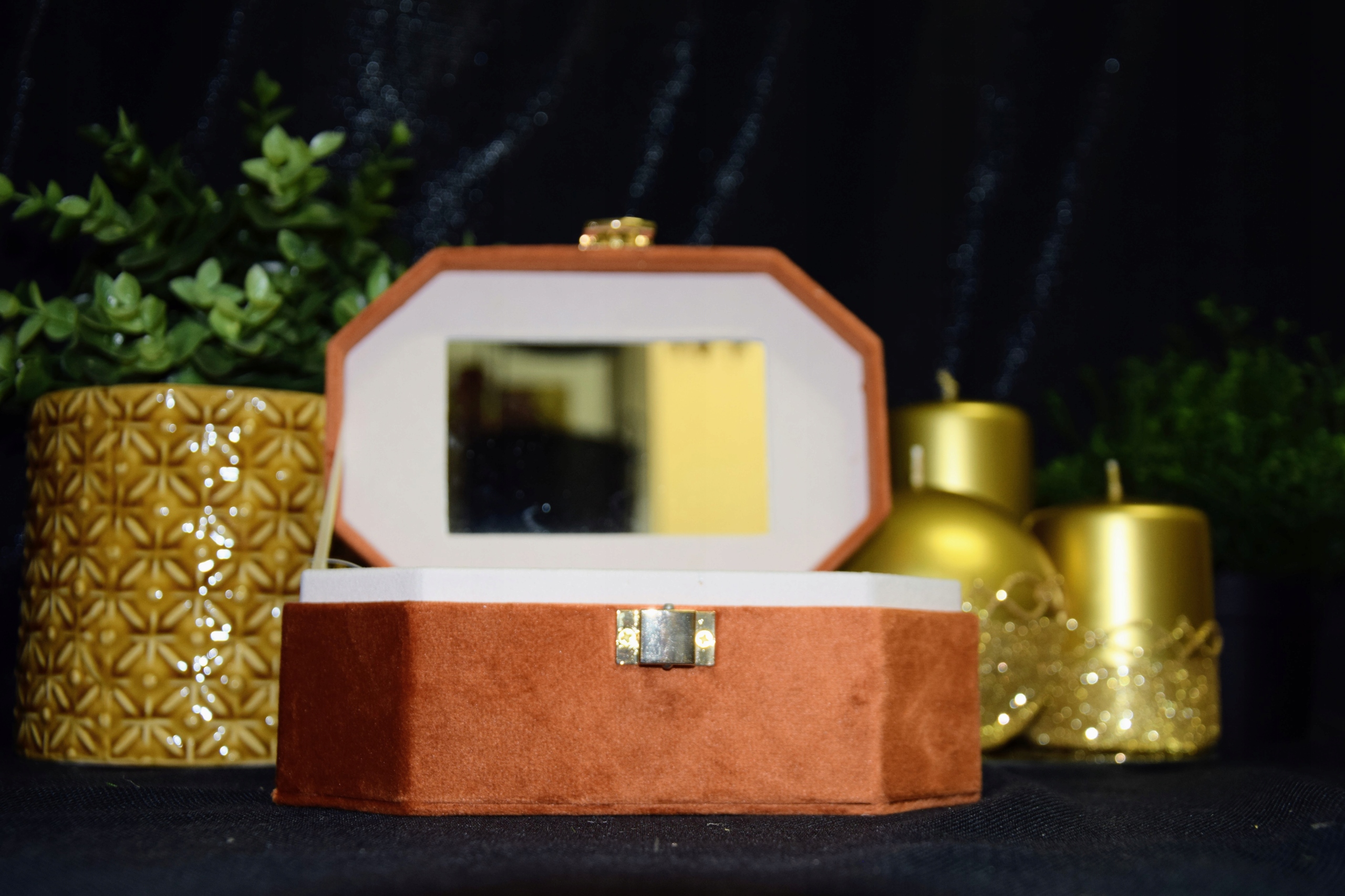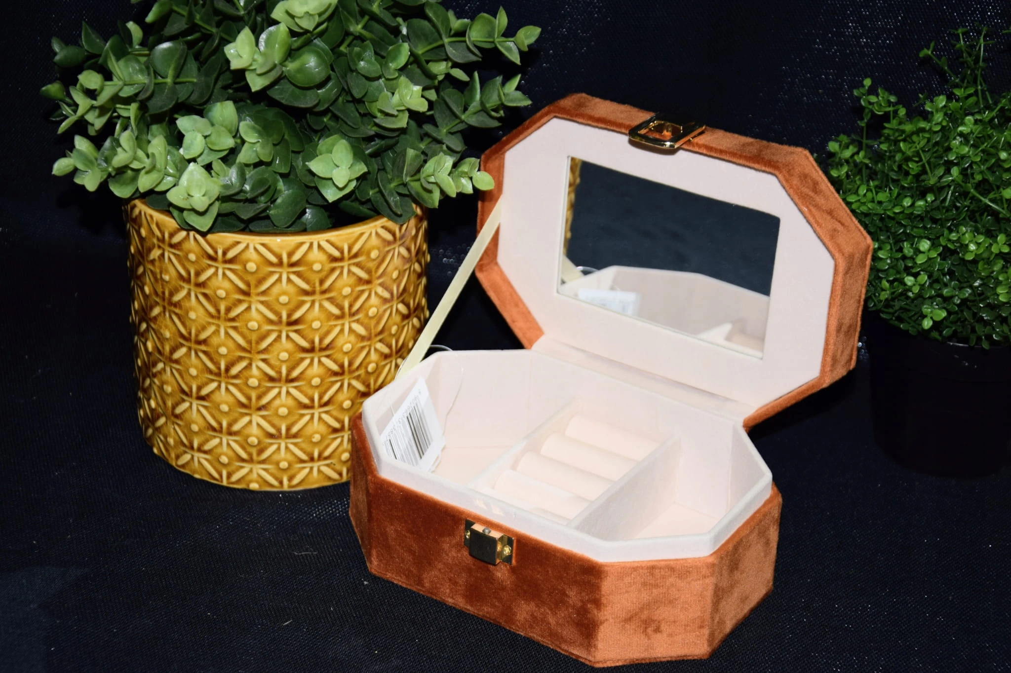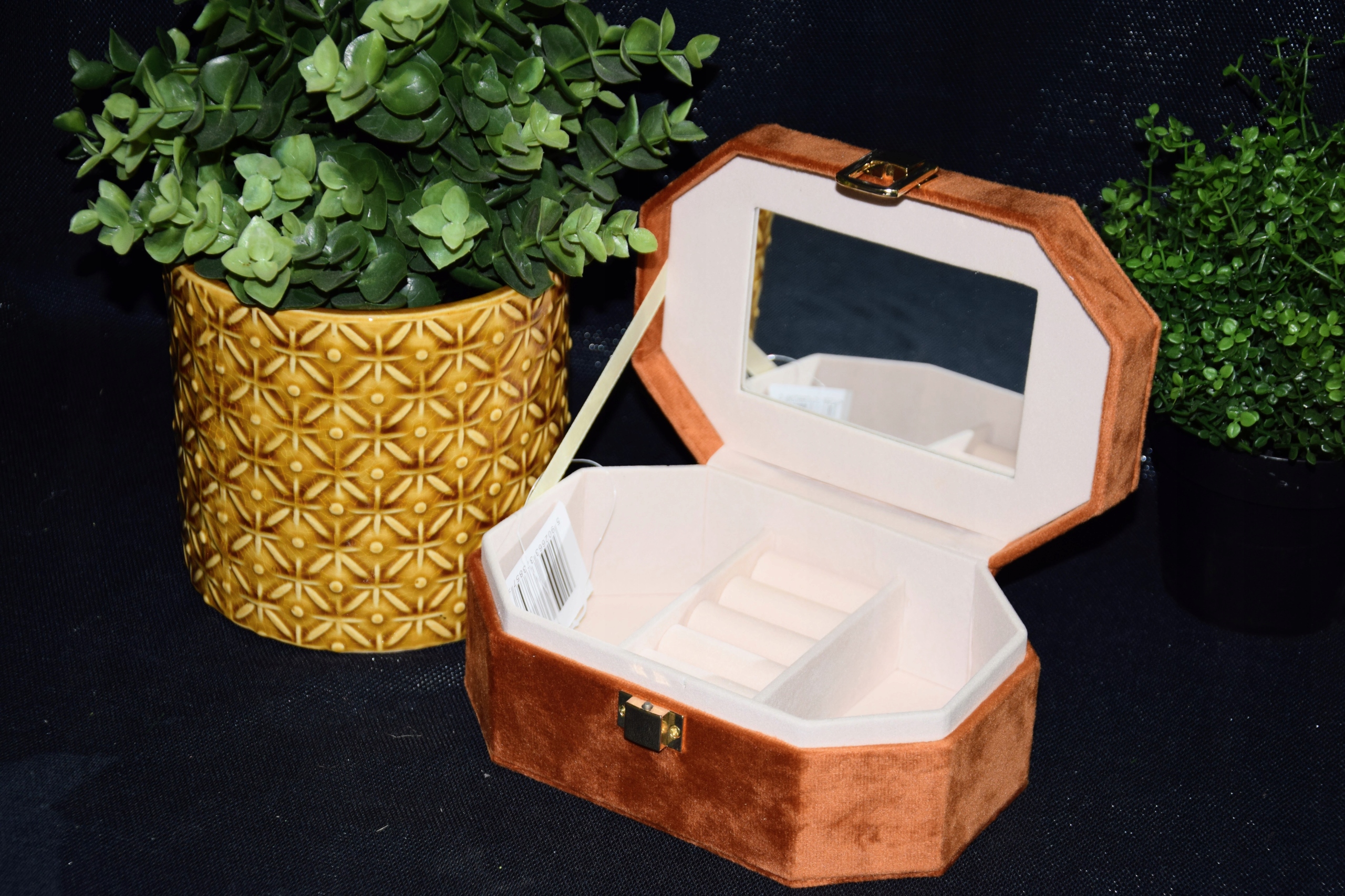 Welurowa szkatułka w kolorze musztardowym, wyściełana jasnym materiałem, wyposażona w lusterko.