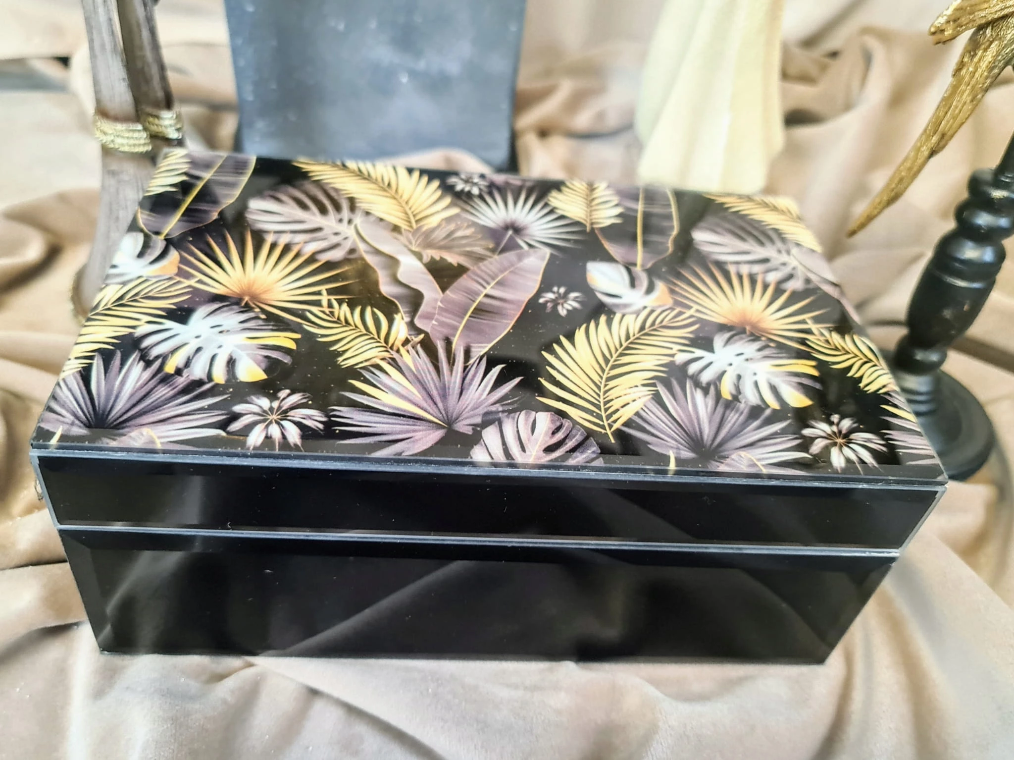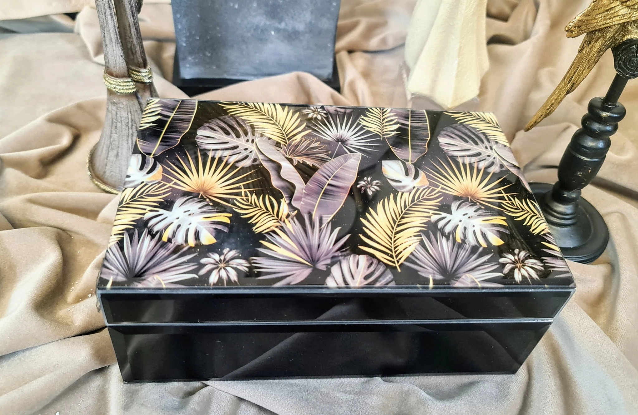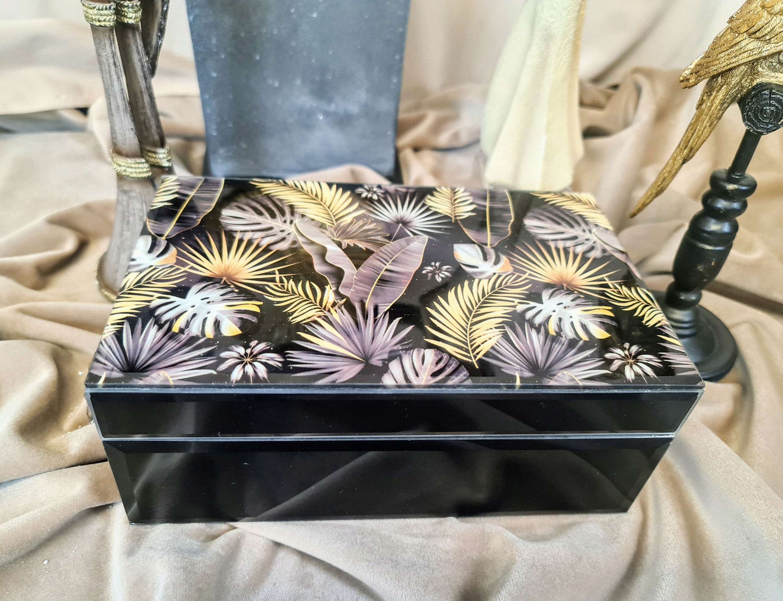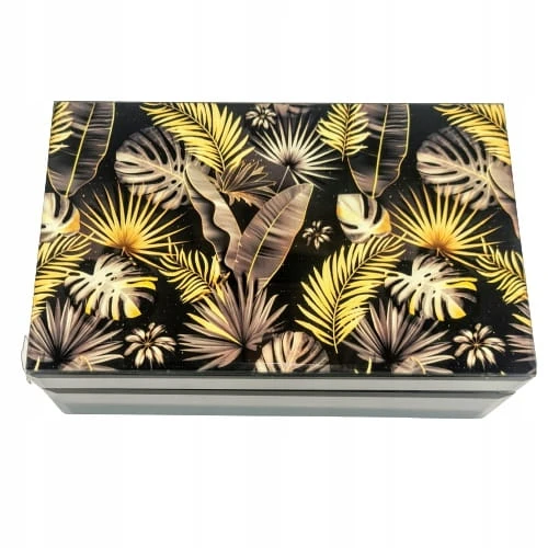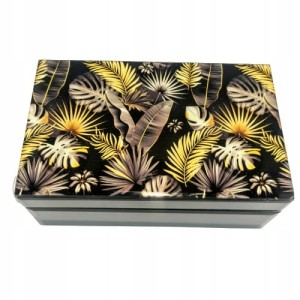 Szkatułka na biżuterię z najmodniejszym motywem liści monstery. Sprawdzi się jako elegancki dodatek do każdego wnętrza. Będzie idealnym pomysłem na prezent. Kasetka doskonała na małe drobiazgi lub na biżuterię.