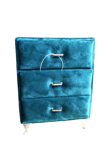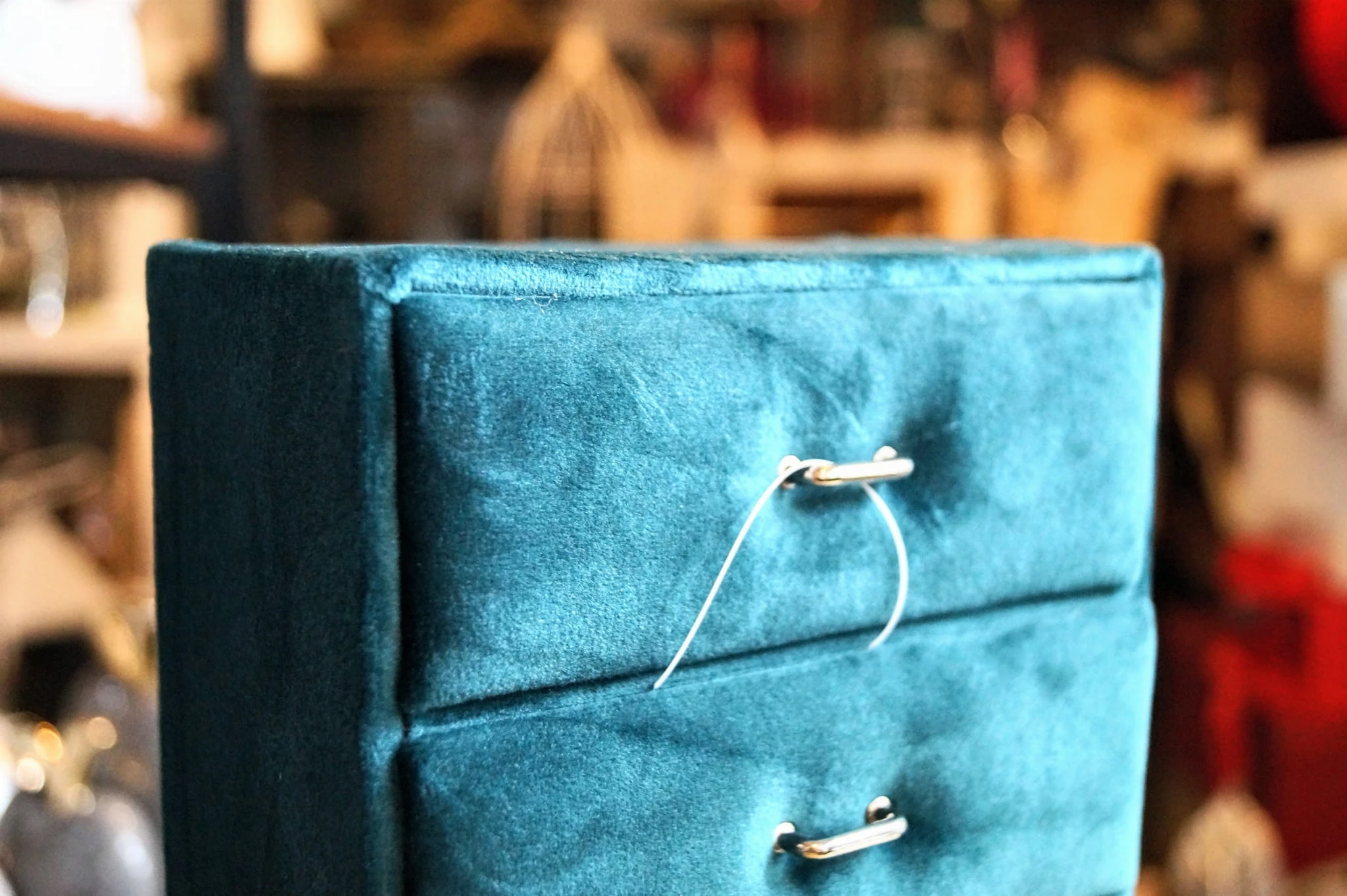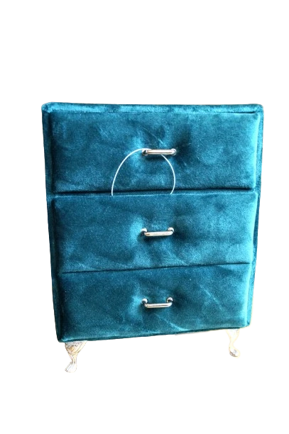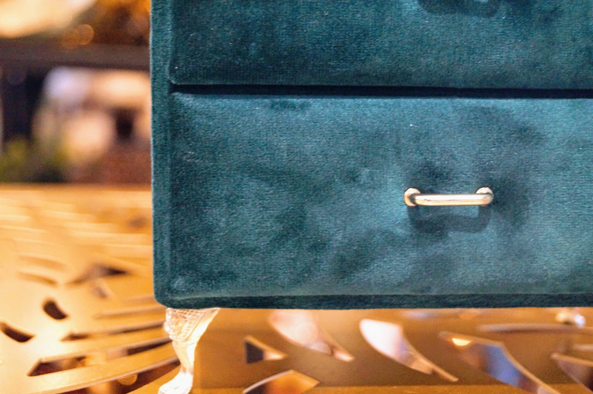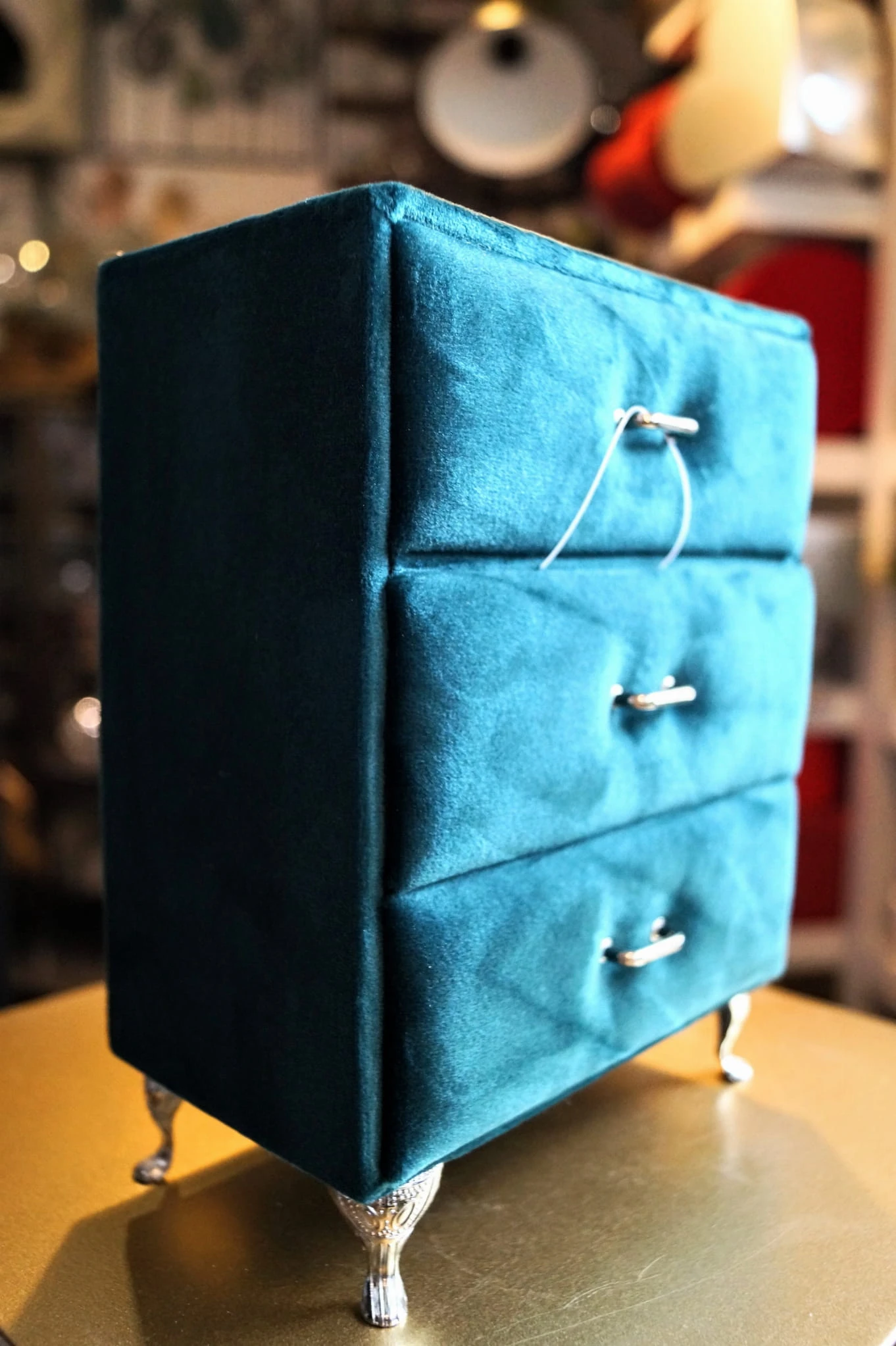 Estetyczna szkatułka na biżuterię i drobiazgi w kształcie małej komody. Wykonana z bardzo dobrej jakości weluru, z dbałością o szczegóły.