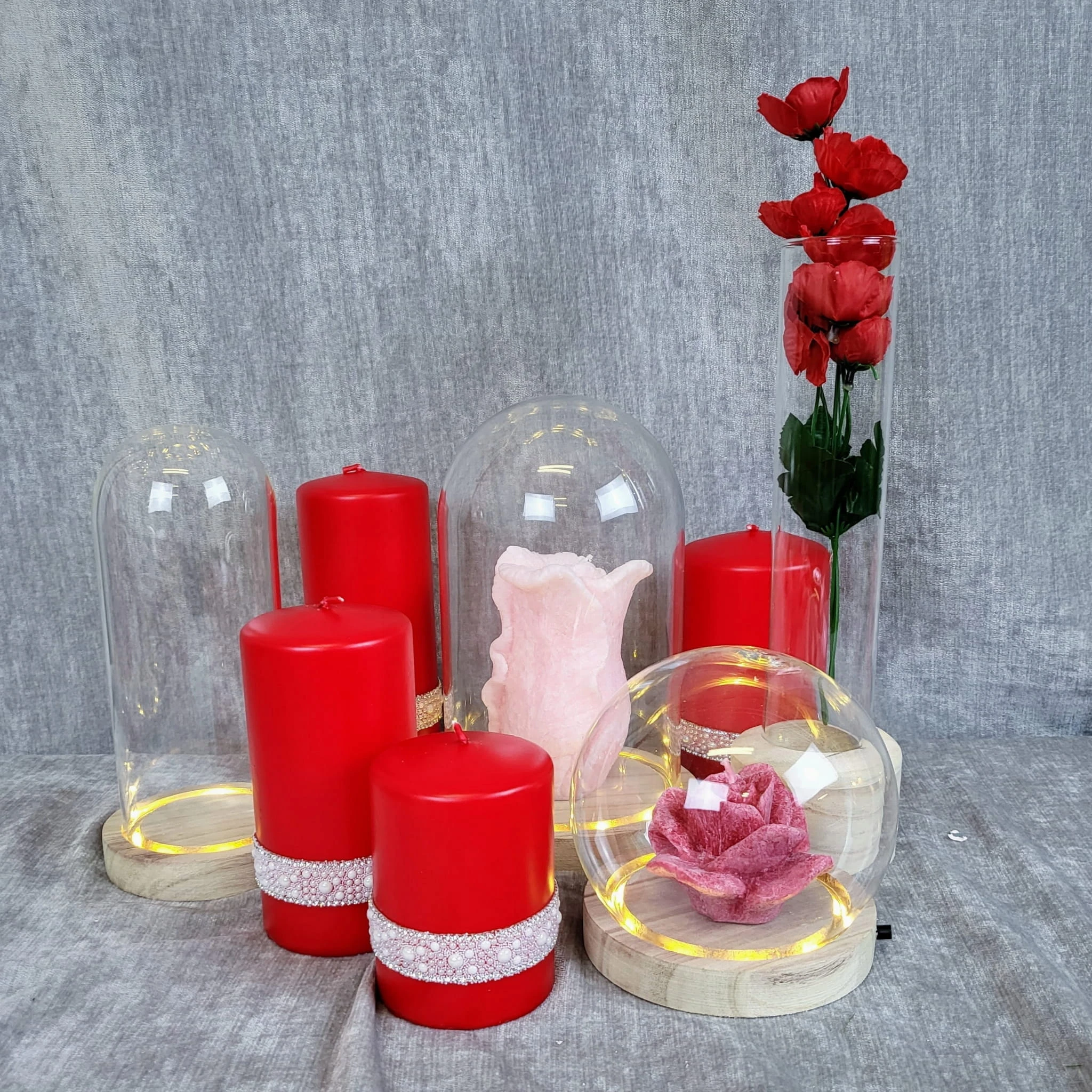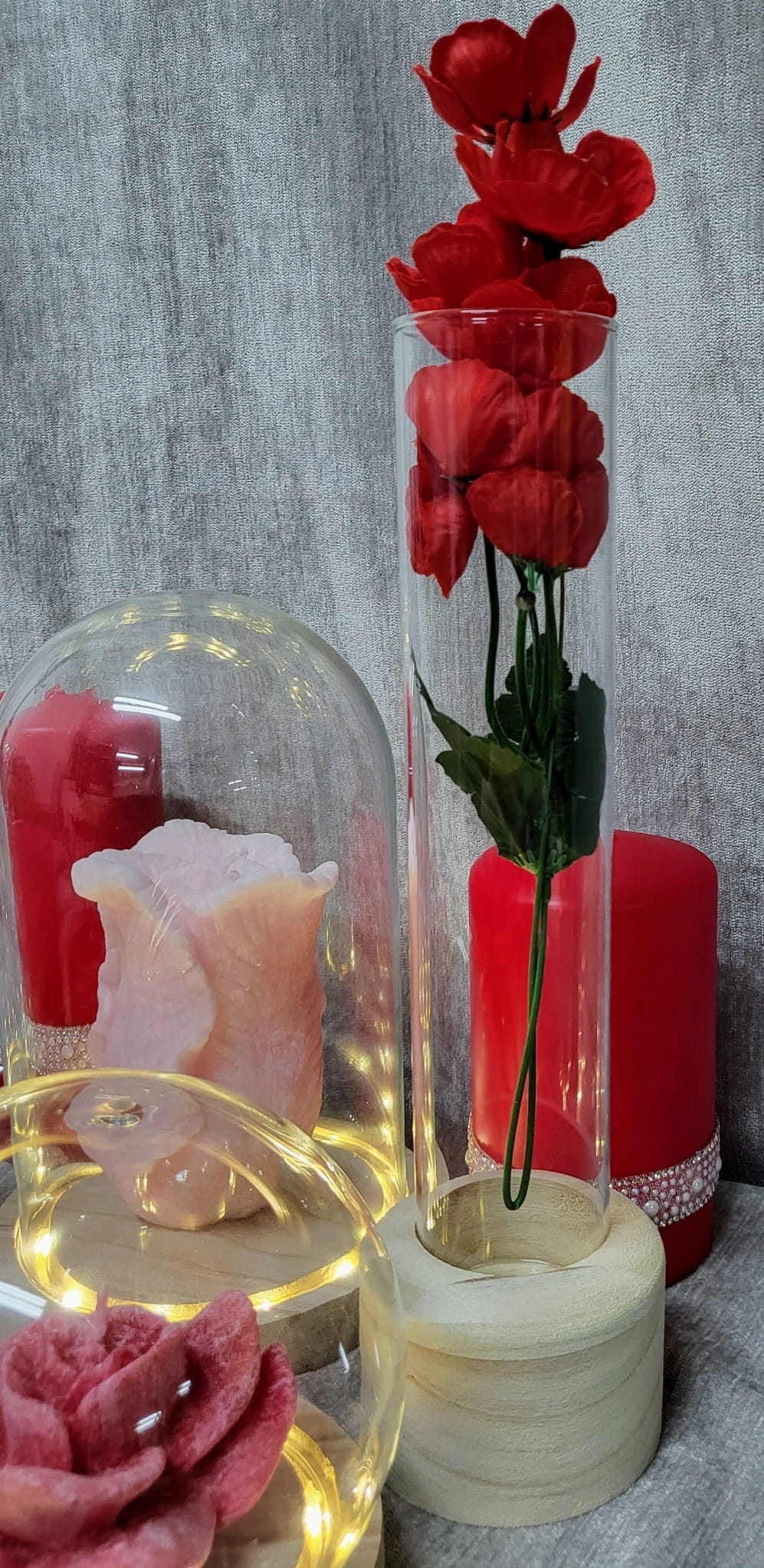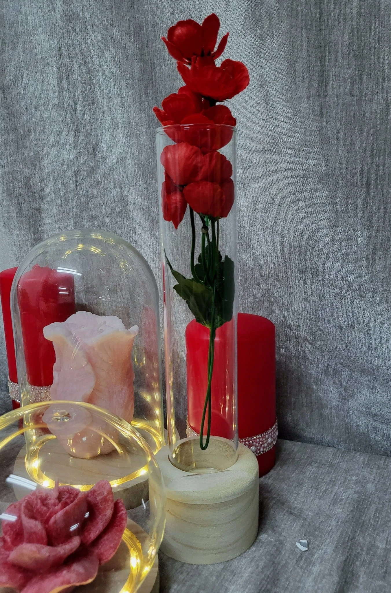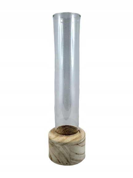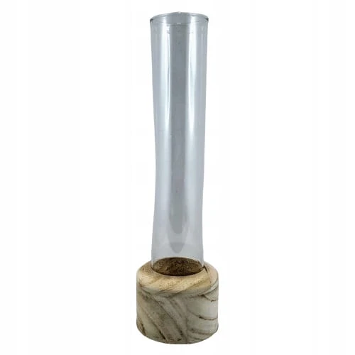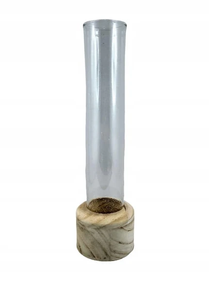 Szklany pojemnik na drewnianej podstawce w surowym stylu. Idealnie wkomponuje się we wnętrza loft, eklektyczne czy te industrialne. Można go wykorzystać jako wazonik na sztuczną roślinę, czy jako pojemnik dekoracyjny.