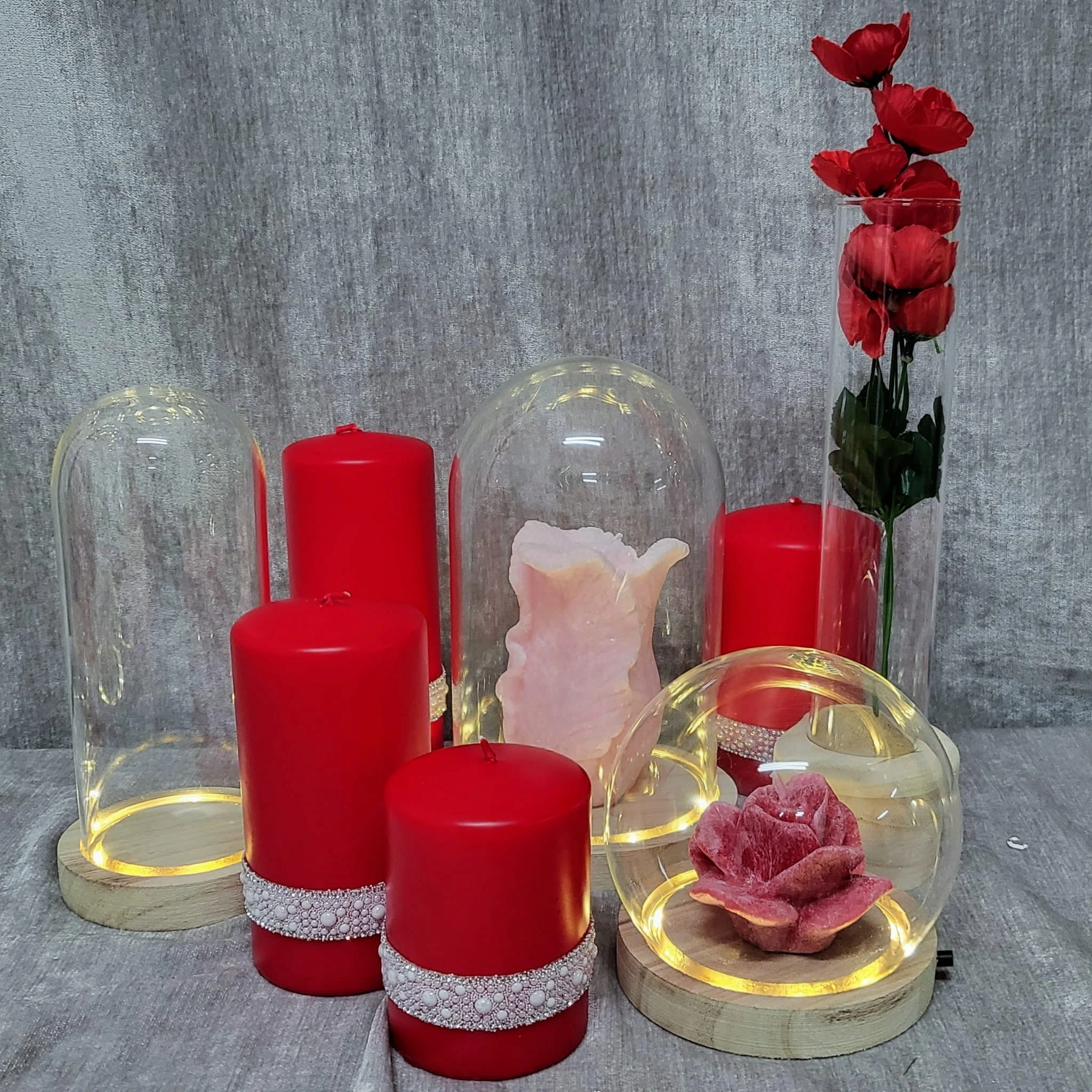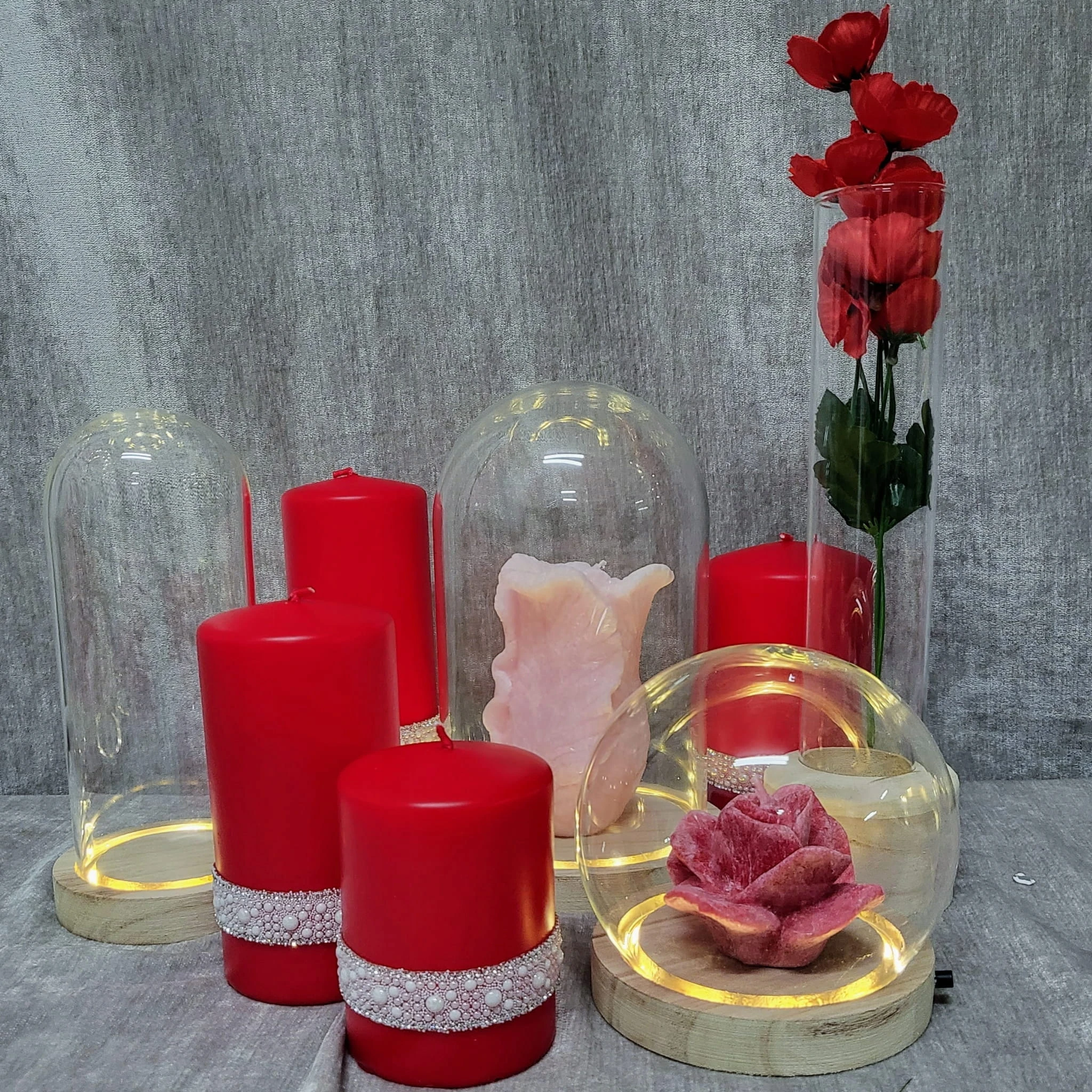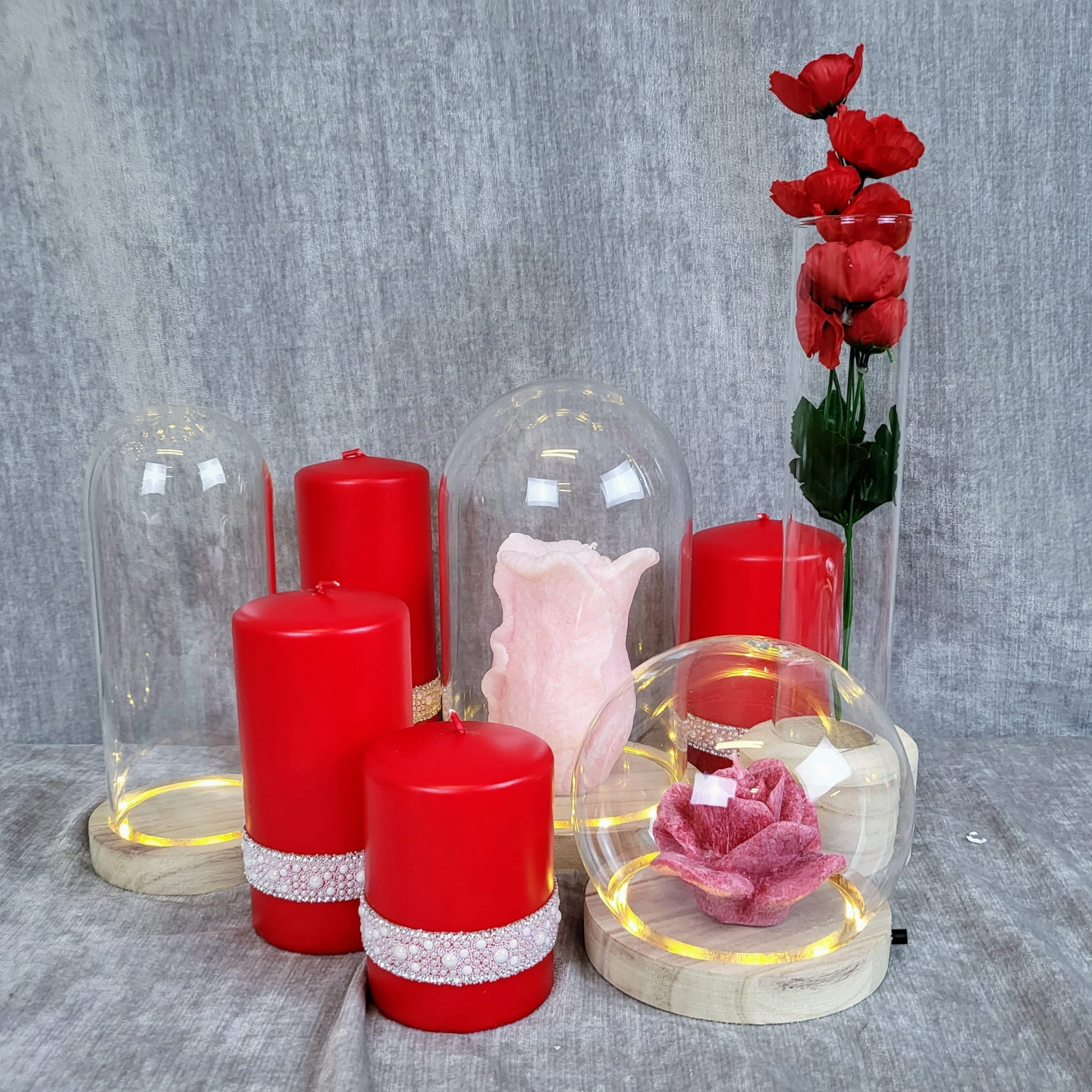 Szklany pojemnik na drewnianej podstawce w surowym stylu. Idealnie wkomponuje się we wnętrza loft, eklektyczne czy te industrialne. Można go wykorzystać jako wazonik na sztuczną roślinę, czy jako pojemnik dekoracyjny.