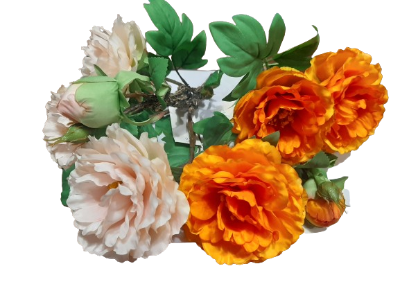 Gałązka składa się z 3 kwiatów i dużego pąka wykonanych z dbałością o najmniejsze szczegóły, co sprawia, że kompozycja wygląda wyjątkowo realistycznie. Kwiaty osadzone są na przypominającej zdrewniałą łodydze.
