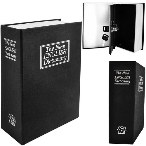 - STALOWA KASETKA WEWNĄTRZ – zewnętrzna obudowa w udany sposób imituje prawdziwą książkę, a w środku znajduje się wykonane ze stali pudełko, które jest trudne do sforsowania nawet w przypadku rozpoznania, że jest to schowek na kosztowności.