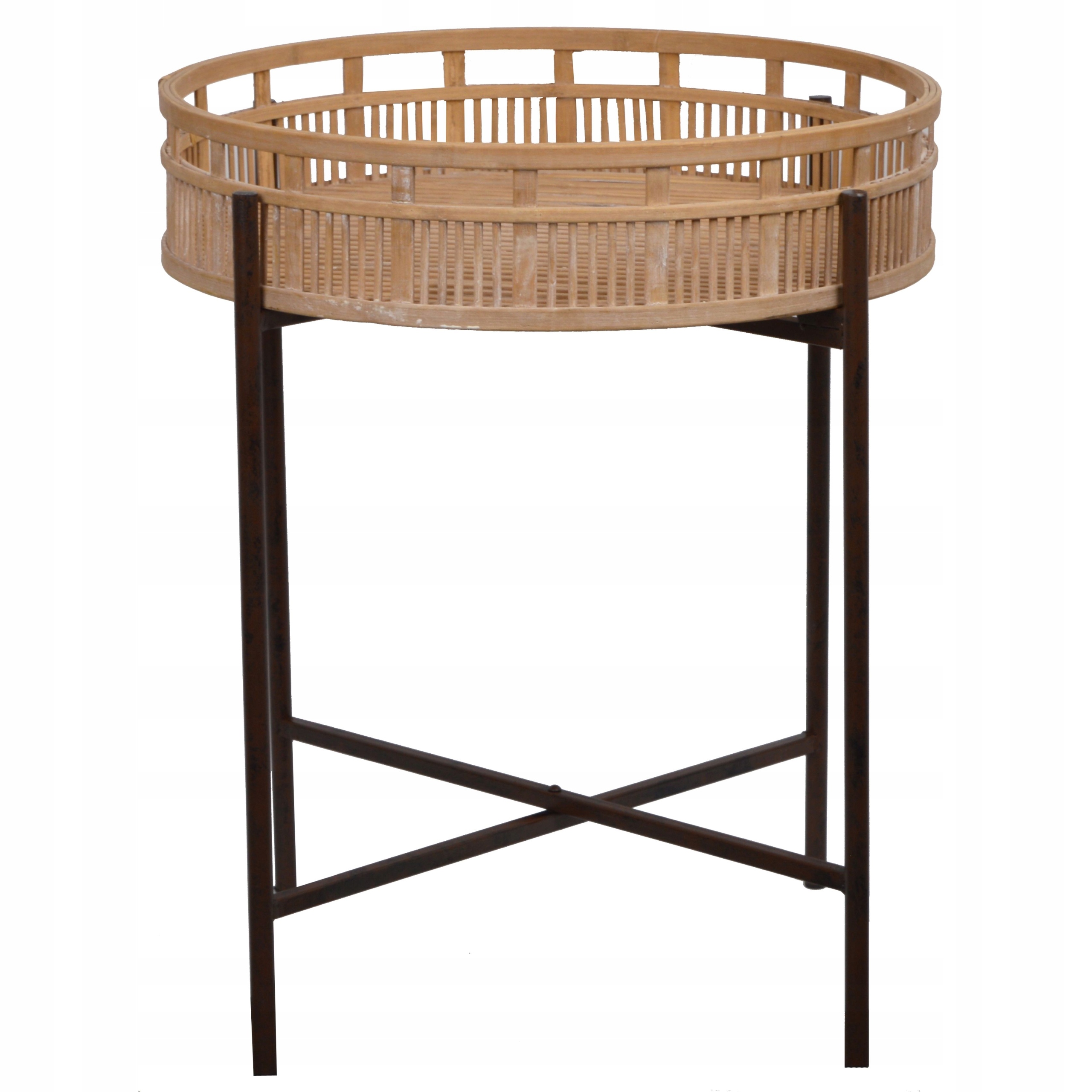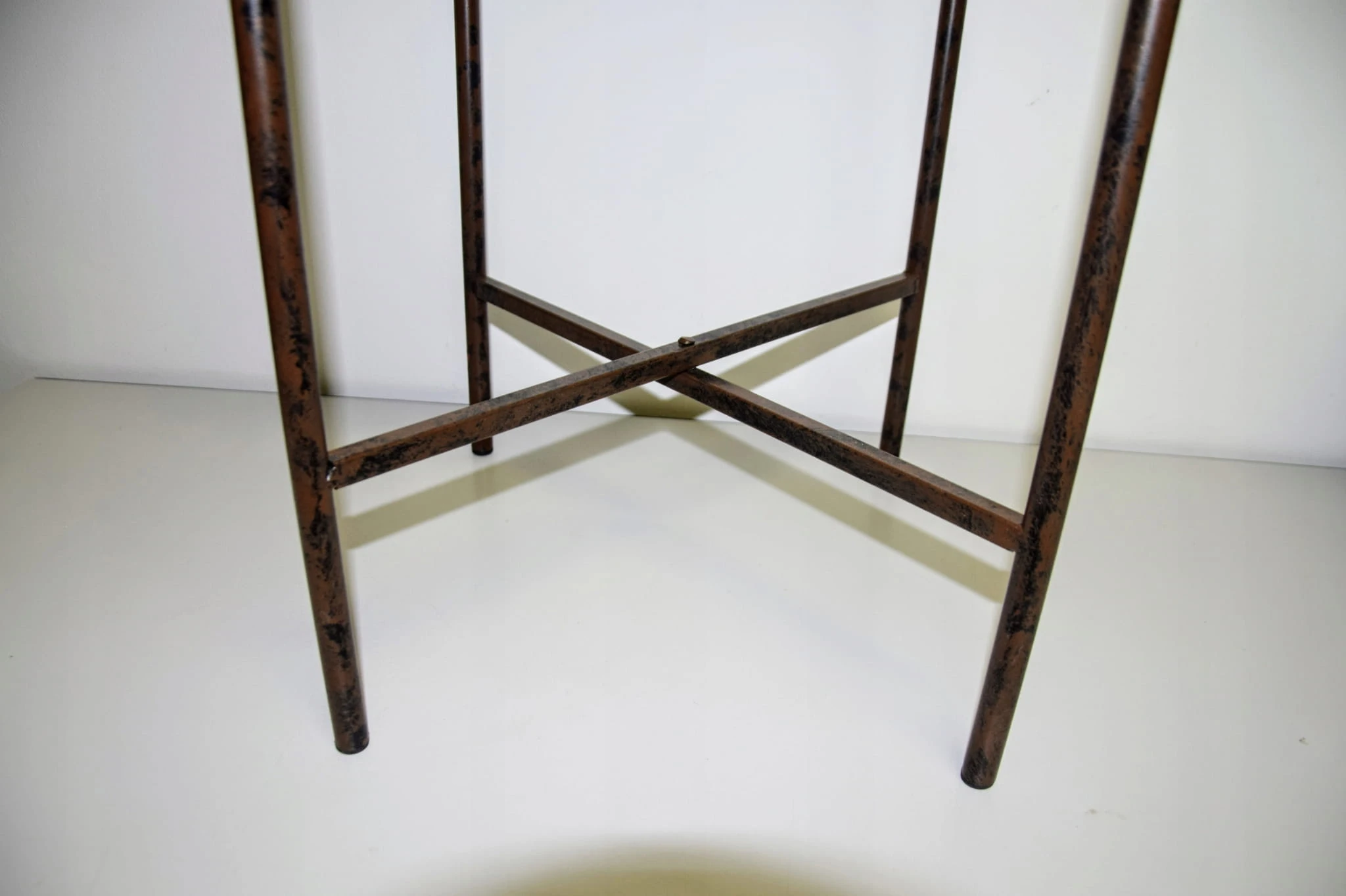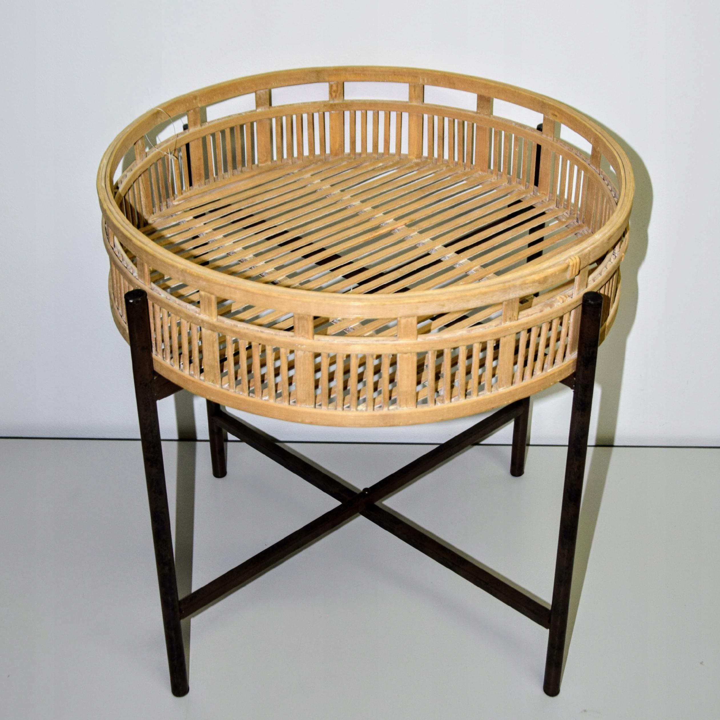 Stolik rattanowy na metalowych, przecieranych nogach. Może służyć jako stolik z wysoki brzegiem lub kwietnik na doniczkę z kwiatkiem.