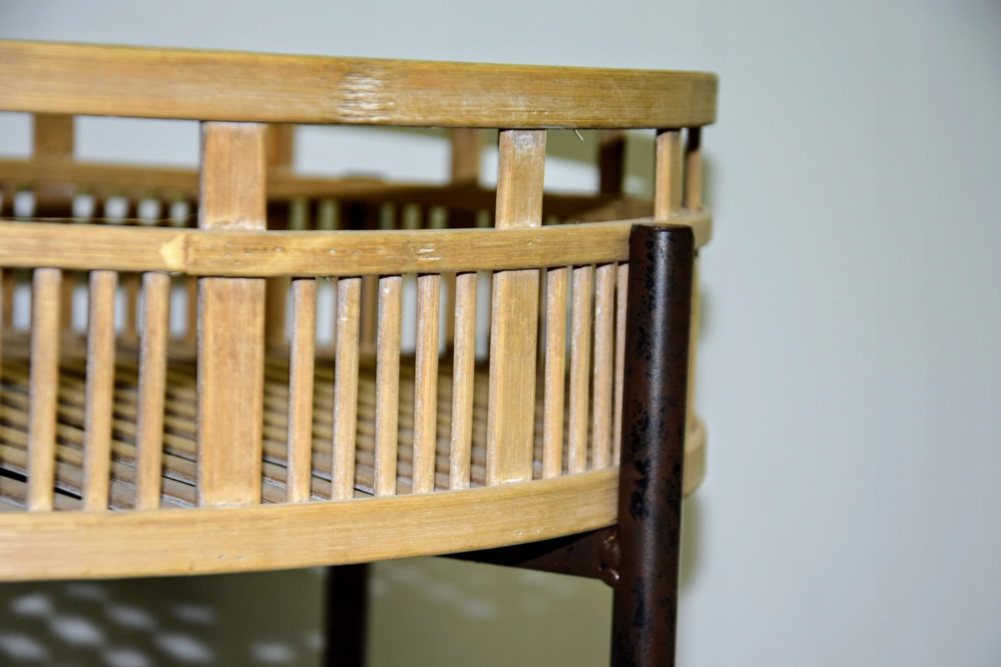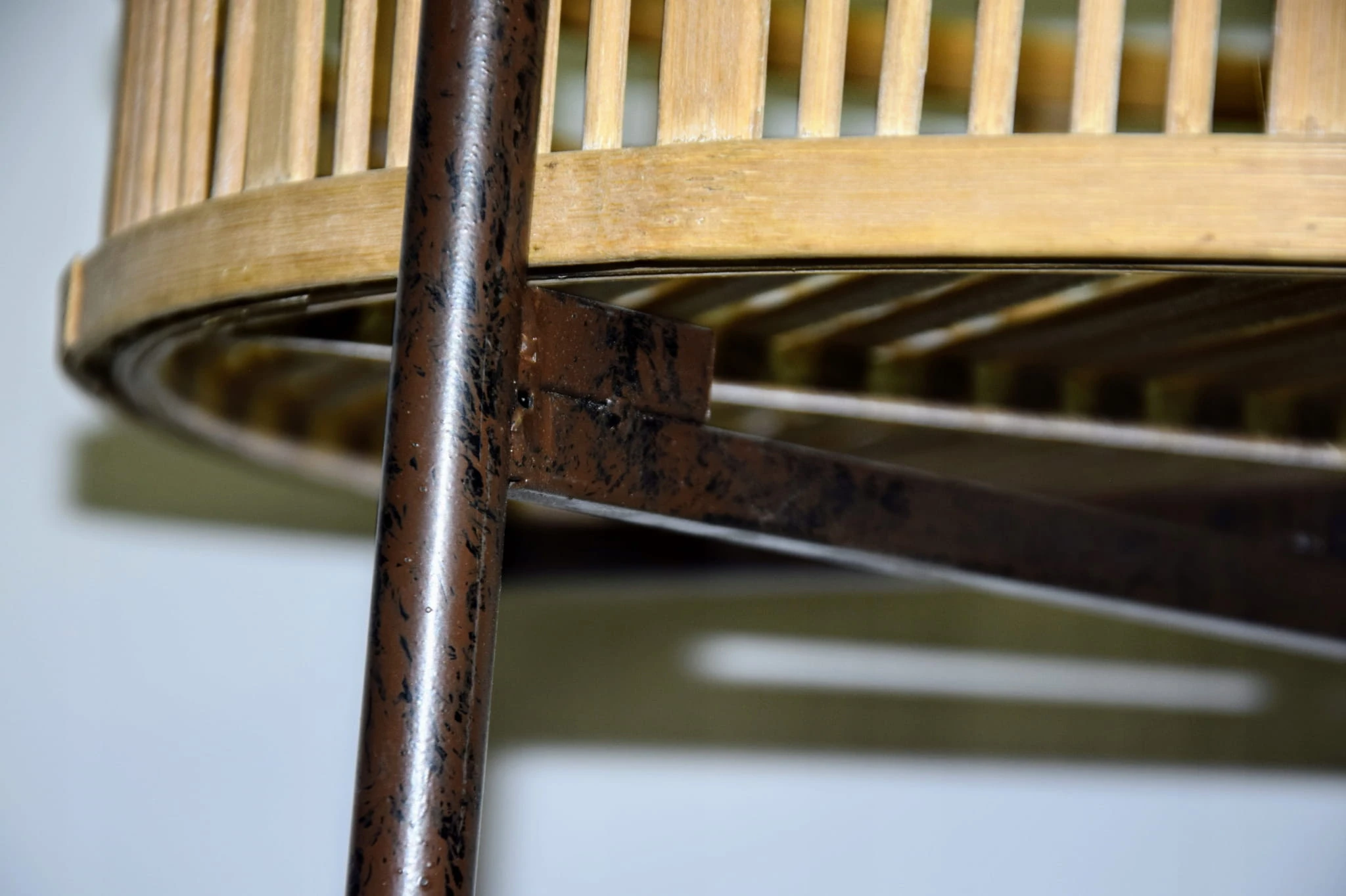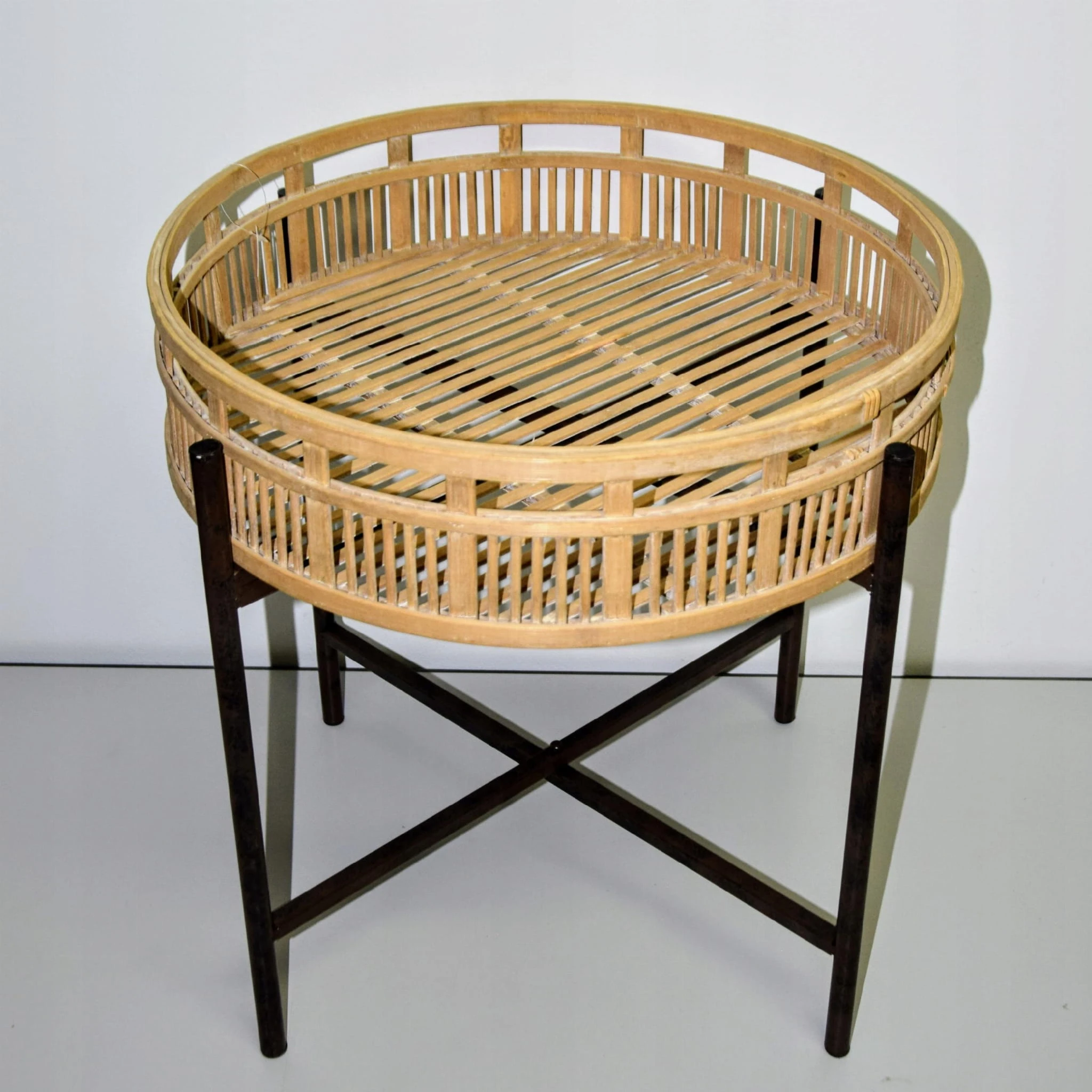 Stolik rattanowy na metalowych, przecieranych nogach. Może służyć jako stolik z wysoki brzegiem lub kwietnik na doniczkę z kwiatkiem.
