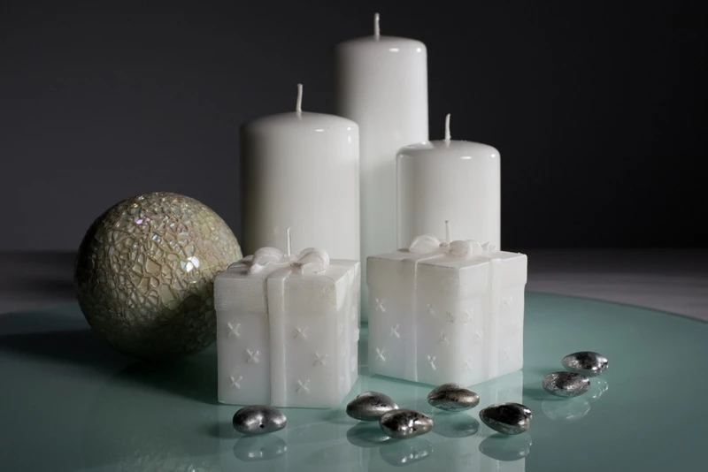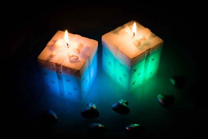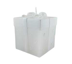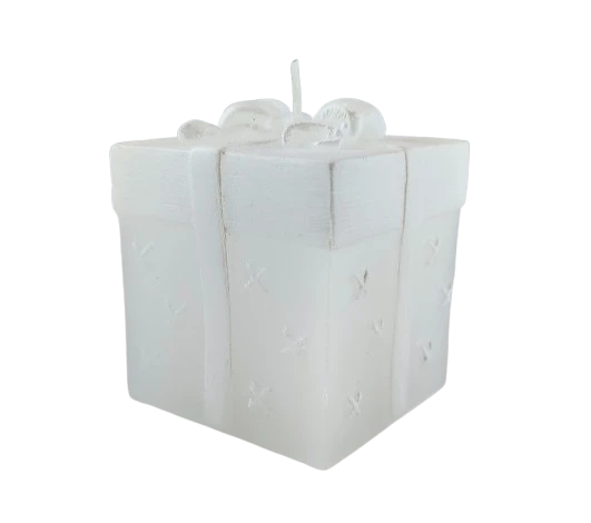 Świeca w kształcie prezentu z wbudowaną diodą led — doskonała jako element aranżacji wnętrz, dekoracja świąteczna lub prezent.