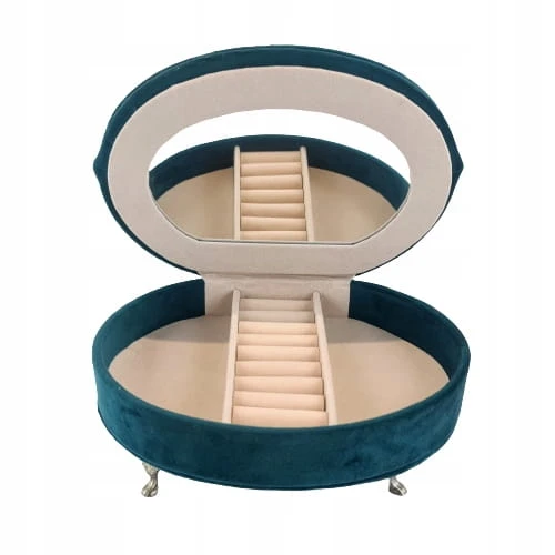 Welurowa szkatułka w kolorze zielonym, wyściełana jasnym materiałem, wyposażona w lusterko.