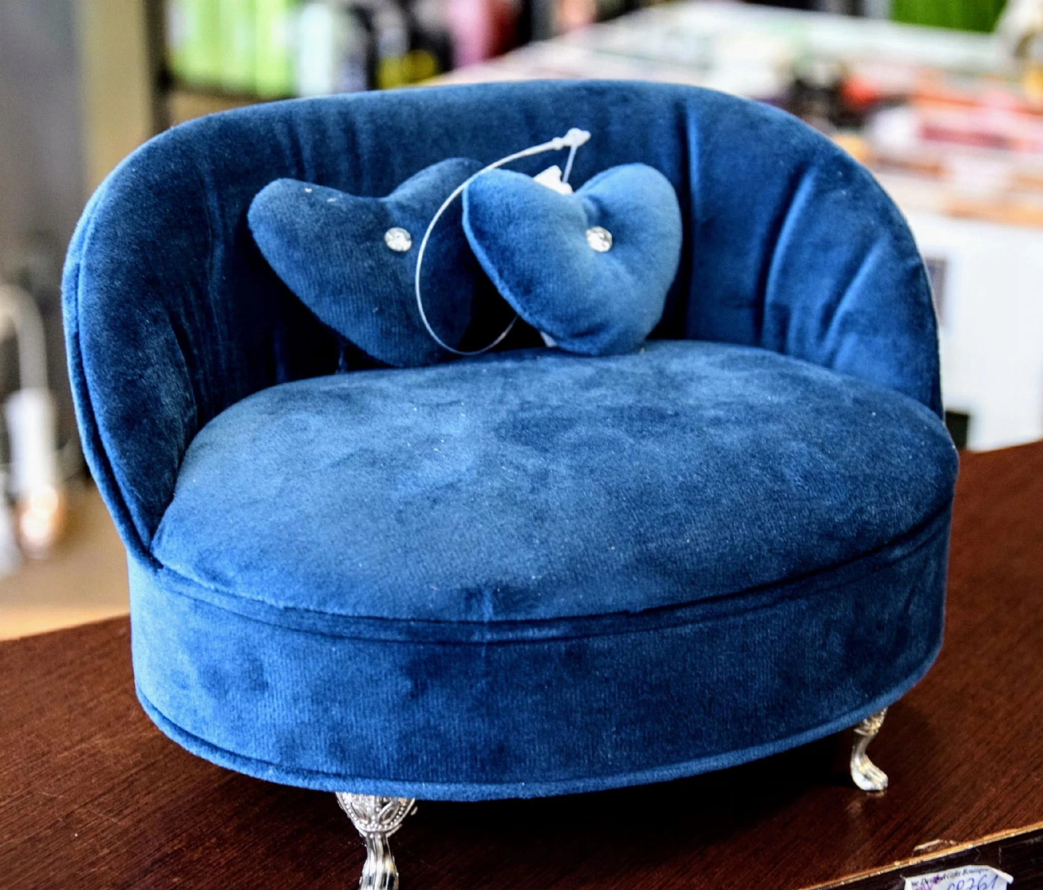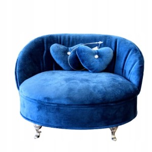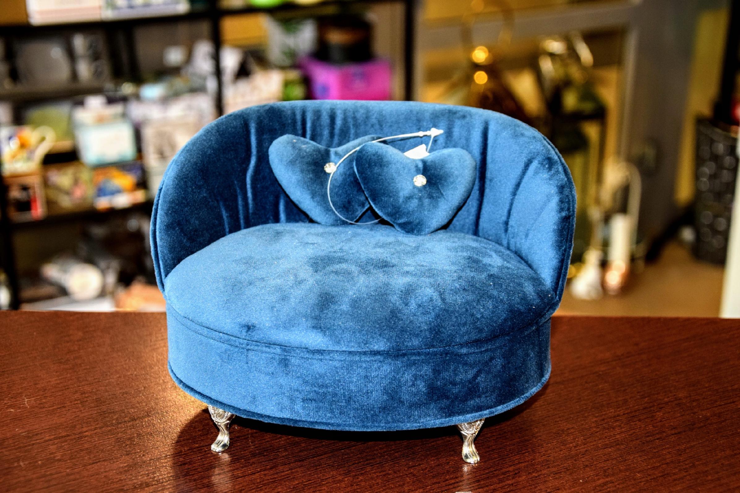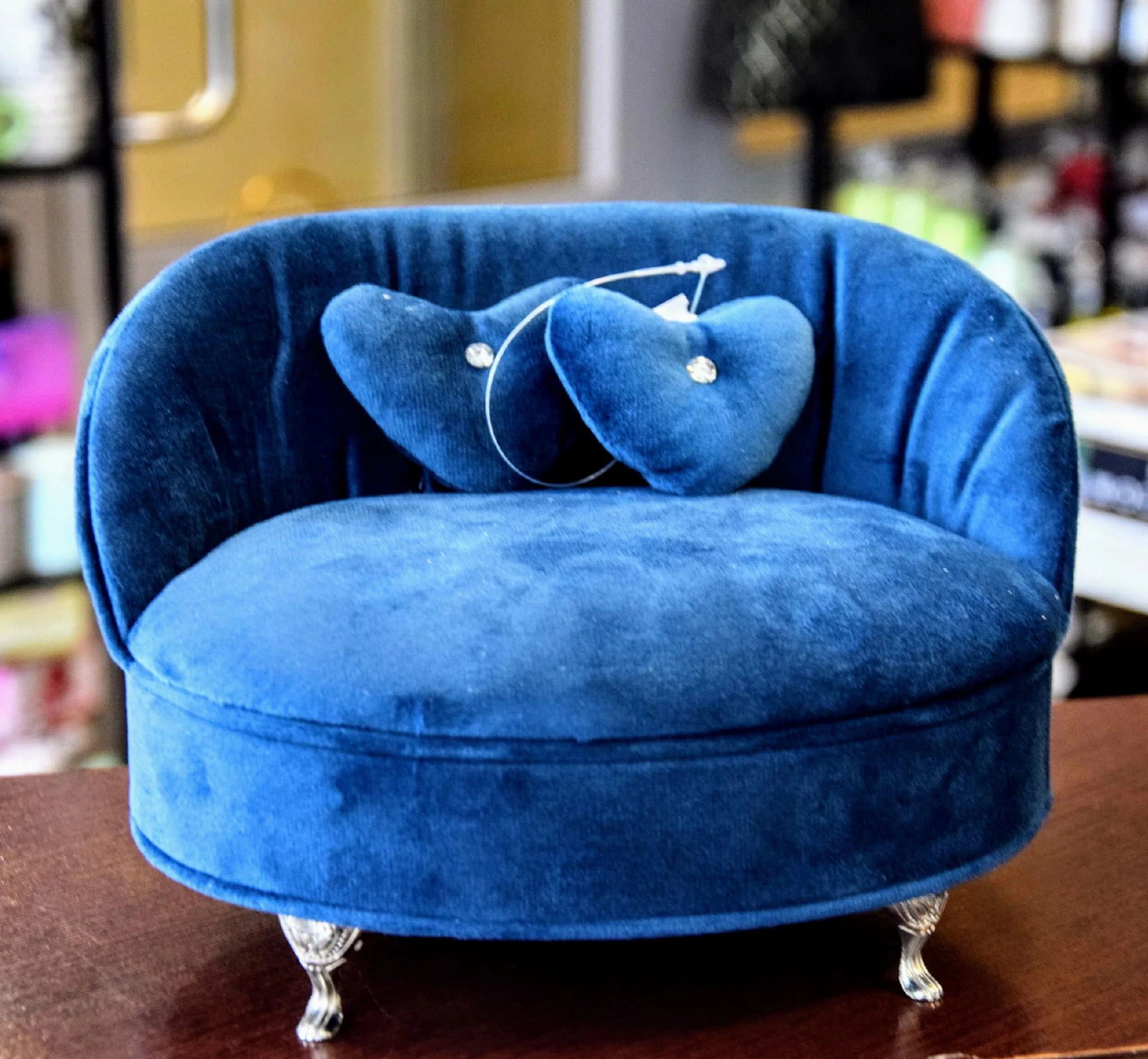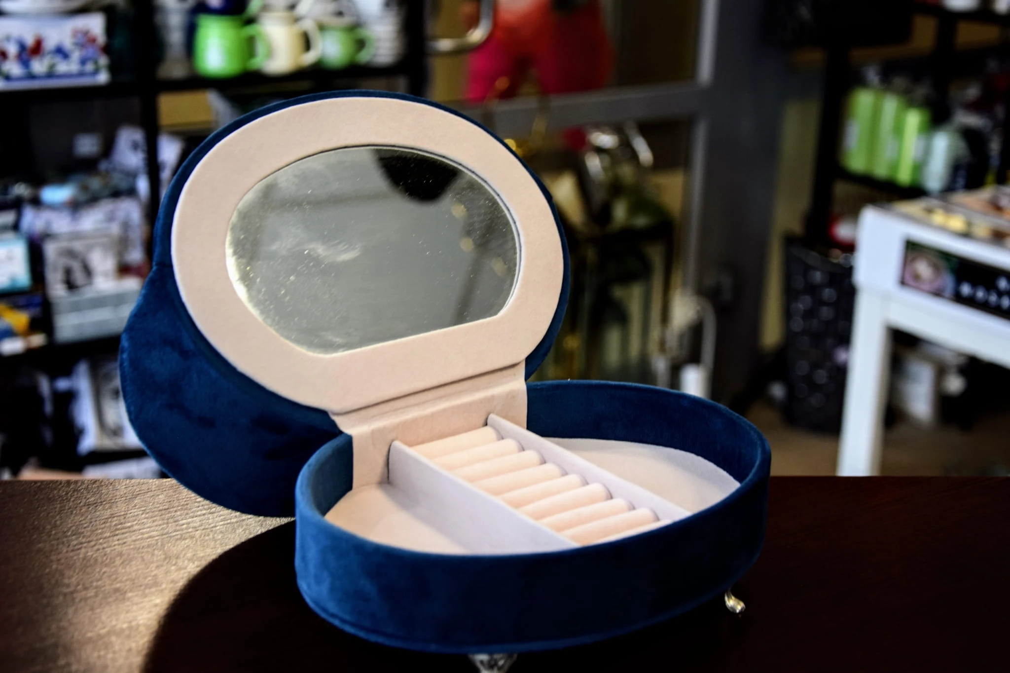 Welurowa szkatułka w kolorze granatowym, wyściełana jasnym materiałem, wyposażona w lusterko.