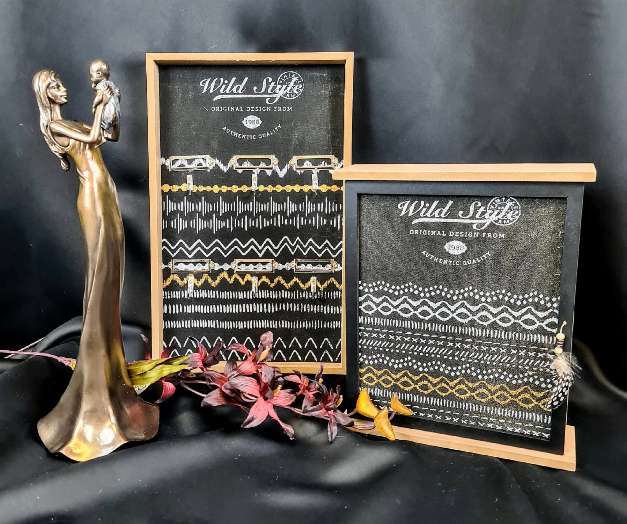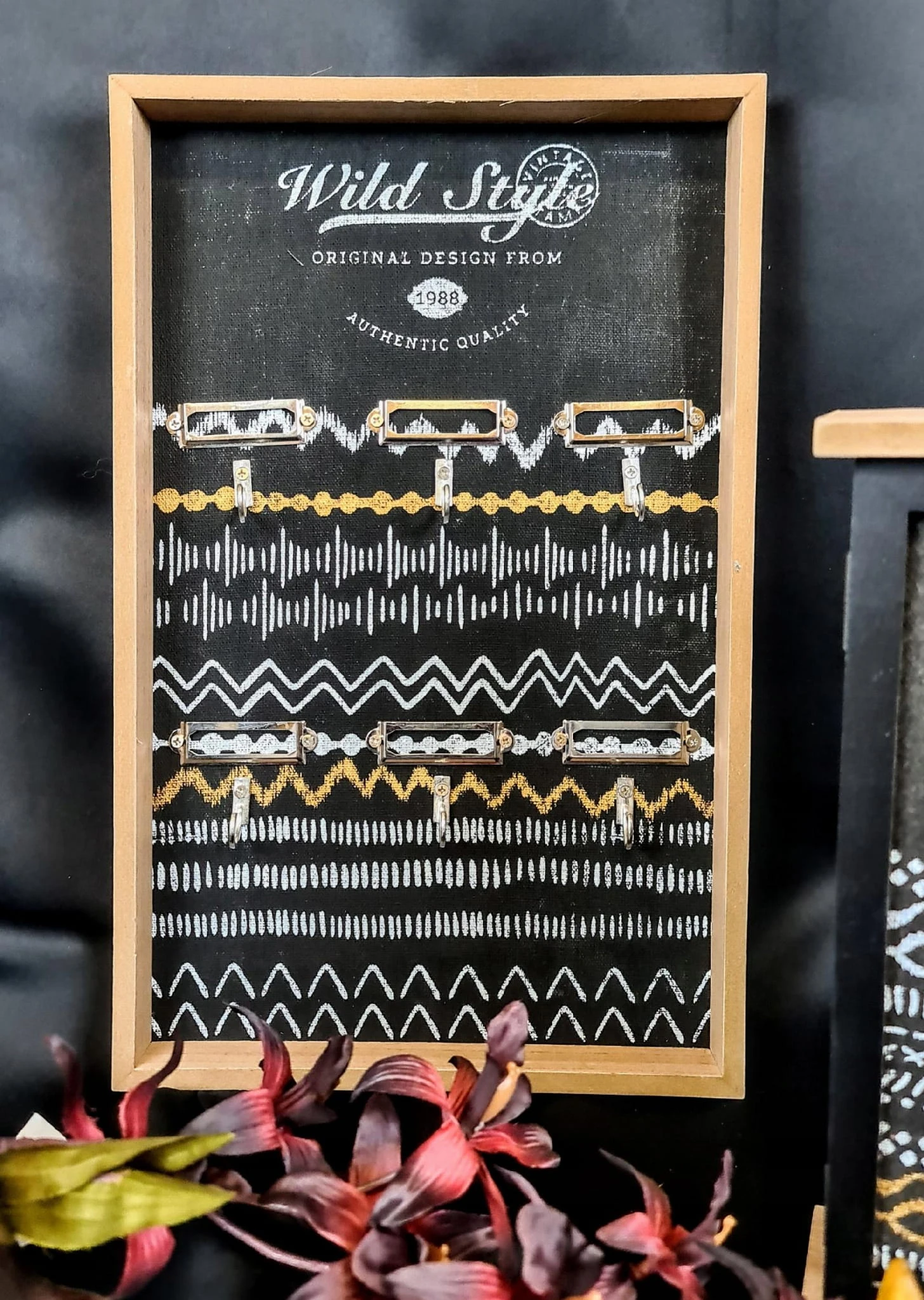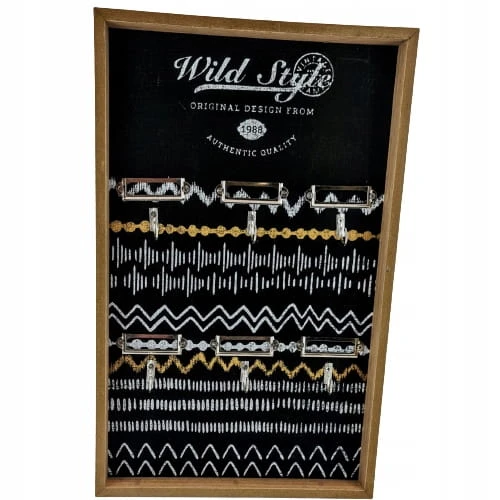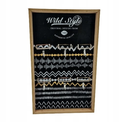 Tablica na klucze z drewniana ramką, z czarnymi elementami oraz sześcioma haczykami do zawieszenia kluczy.