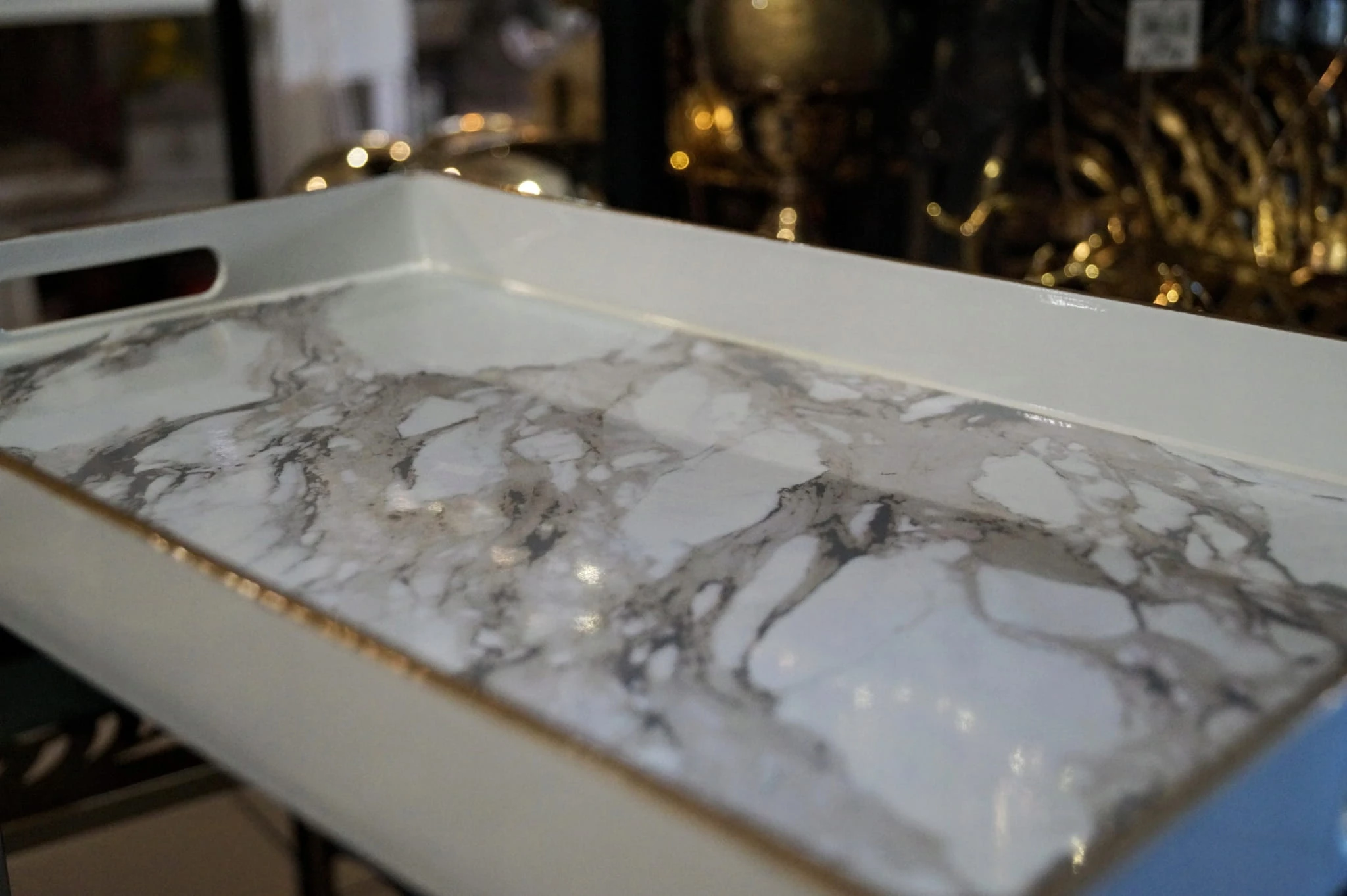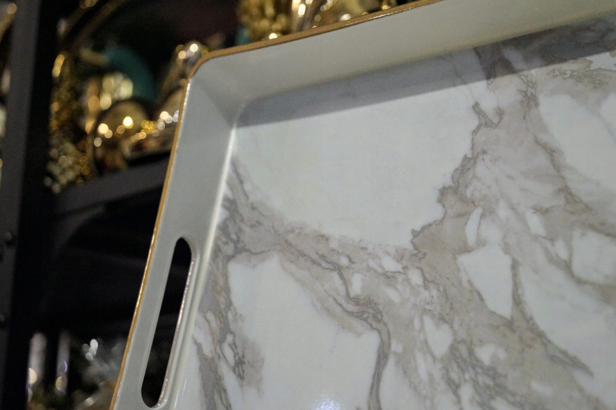 Jest to świetny sposób na serwowanie posiłków oraz jako element dekoracyjny. Marmurowy styl tacy, oraz złote wykończenia nadają elegancji.